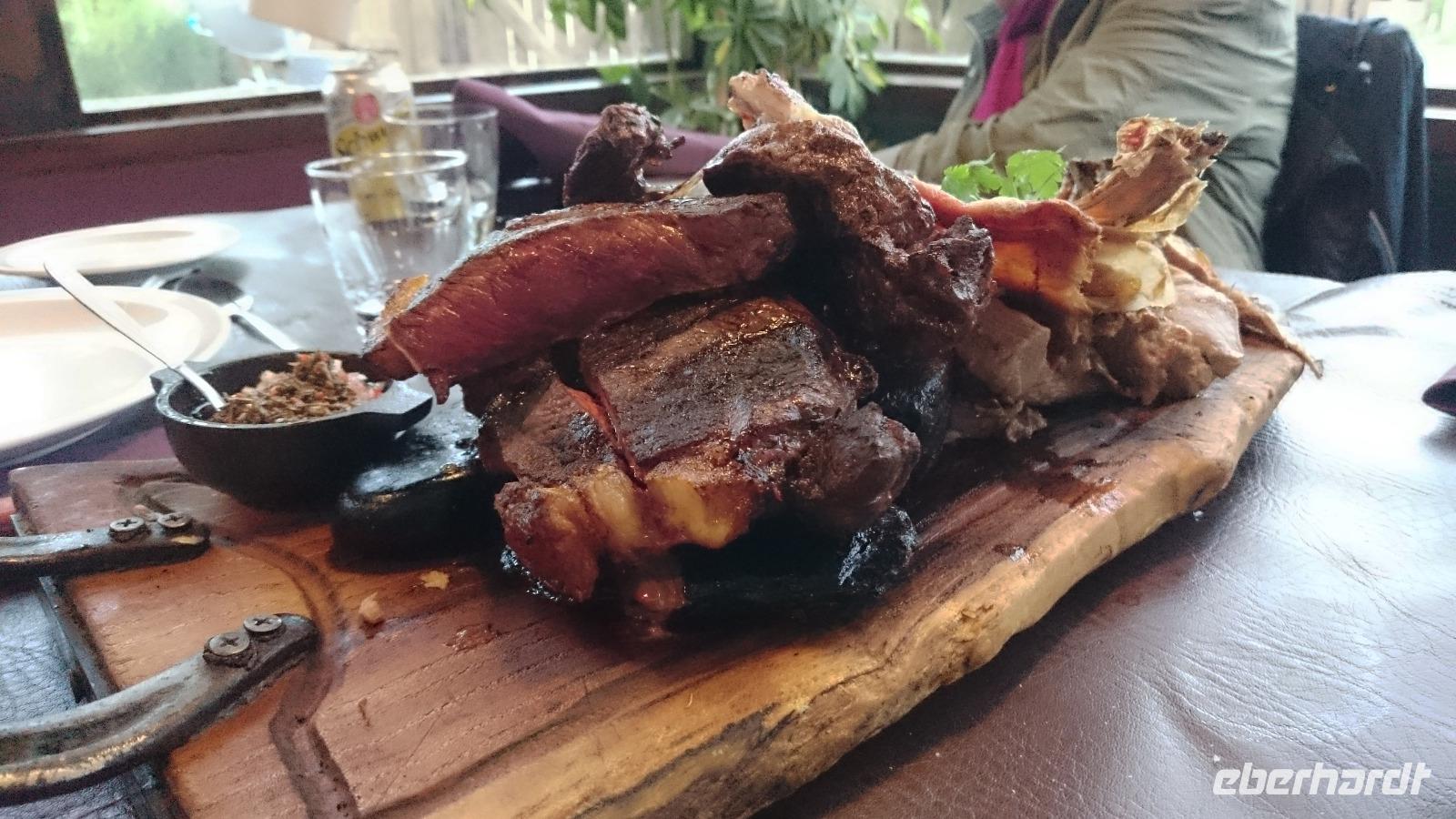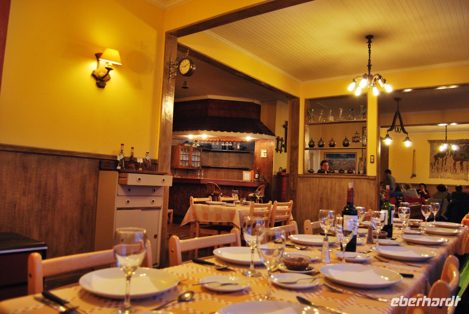 Unser Bus war mit Spikes an den Rädern ausgestattet. Da konnte man sich schon denken wie die Wetterverhältnisse hier üblicherweise waren. Wir waren im Frühsommer dort. Es war eisig, es wehte ein kalter Wind. Beim Aussteigen musste man aufpassen, dass einem die Tür nicht aus der Hand gerissen wird. Die meisten Häuser im Ort sind einfache Holzhütten. Im Restaurant El Marítimo machten wir Rast und freuten uns in dem gemütlich-erwärmten Speiseraum auf unser Süppchen sowie Steak mit Kartoffelstampf.