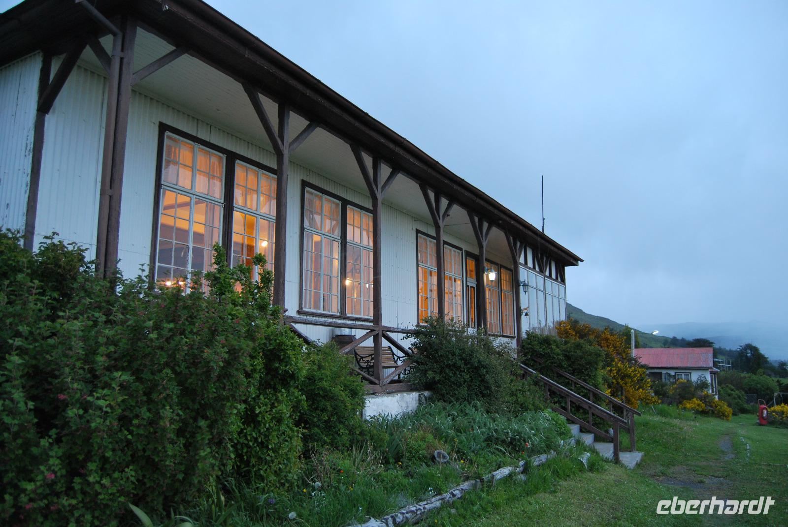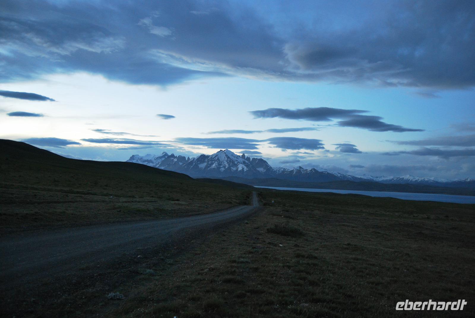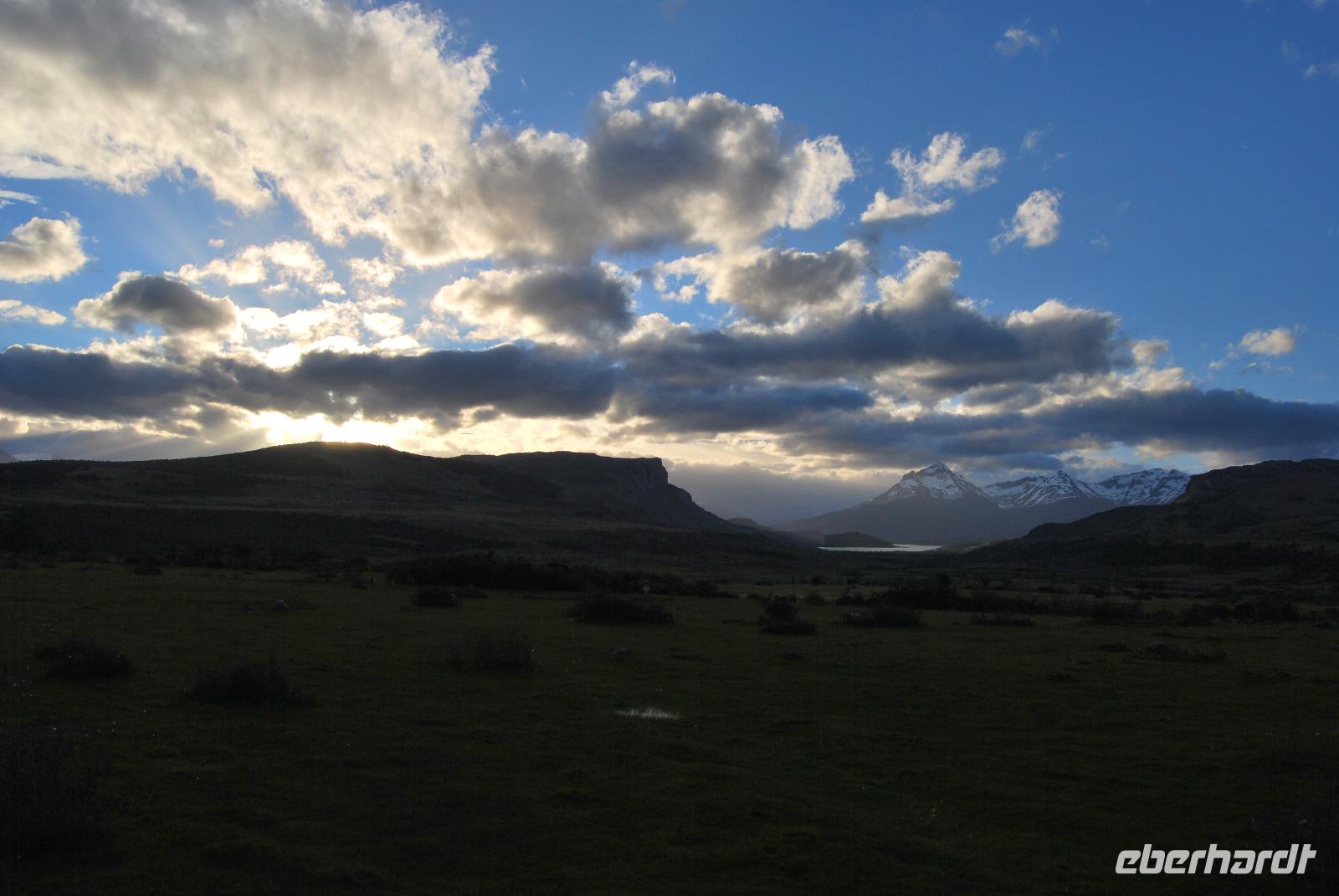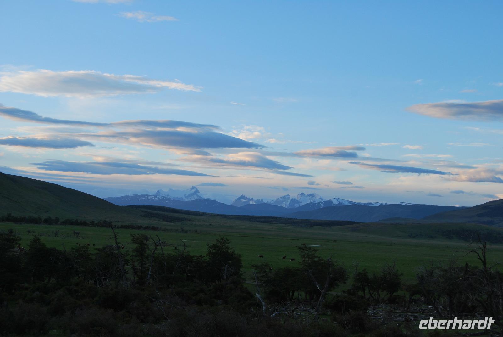 Die Sonne ging nun langsam unter. Es war gegen 21 Uhr als wir die letzten Strahlen genossen - das gewaltige Panorama der Berge und die Kondore, die über den Berghängen an ihren Nestern kreisten. Der Blick in die Ferne, zu den Torres del Paine, dem Wahrzeichen des gleichnamigen Nationalparks, erstaunte uns. Wir hatten wirklich großes Glück die Felsformation aus der Ferne zu betrachten, denn selten ist die Sicht so klar. Nach einiger Zeit verließen wir die Hauptstraße und bogen ab. Auf einer Schotterpiste ging es 25 km auf eine einsame Ranch, der Hosteria Mirador del Payne. Wir freuten uns auf das Abendessen in der kaminbeheizten Hütte und ein Bett.