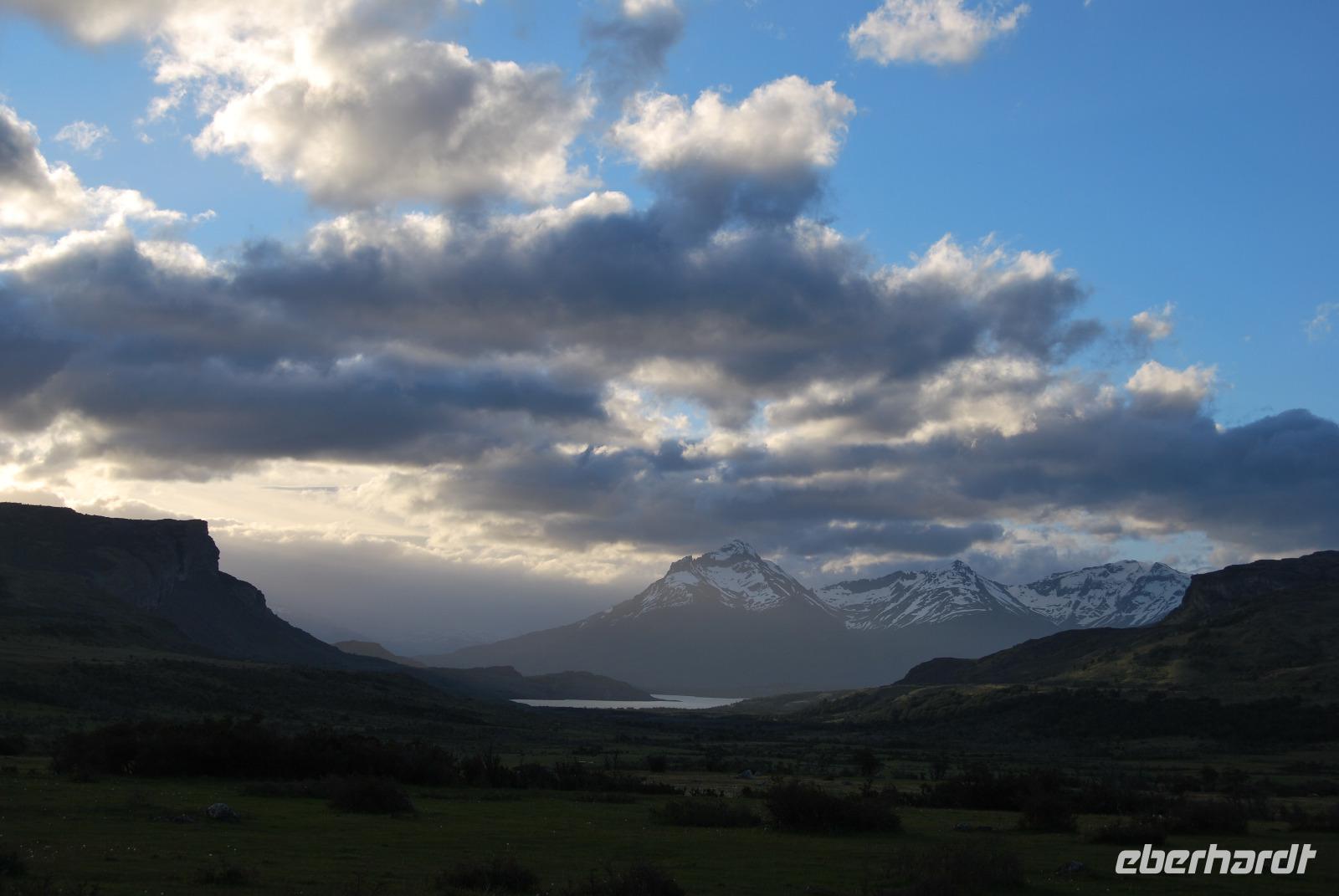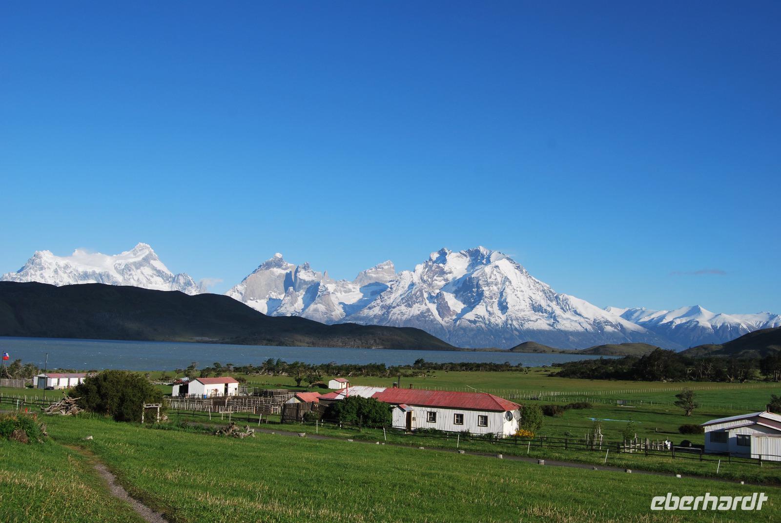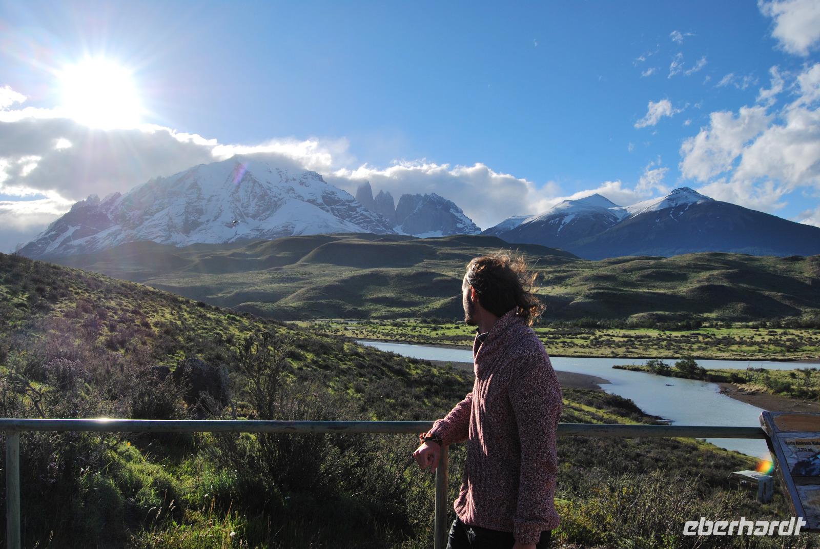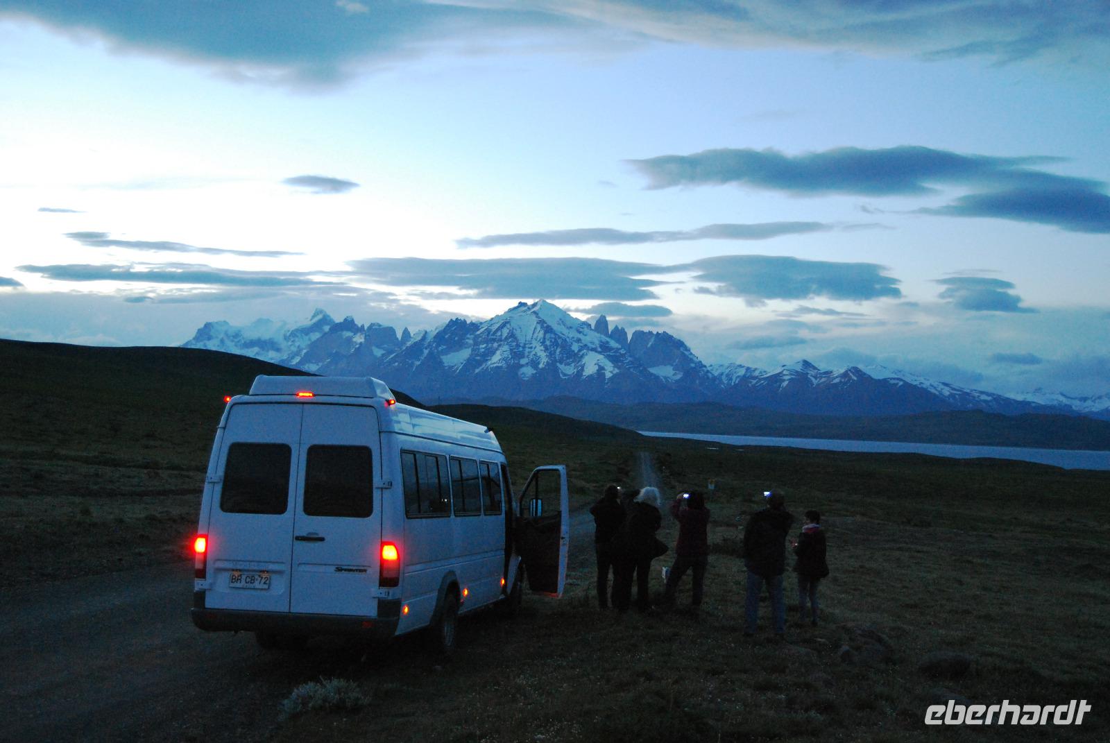 Die Sonne ging nun langsam unter. Es war gegen 21 Uhr als wir die letzten Strahlen genossen - das gewaltige Panorama der Berge und die Kondore, die über den Berghängen an ihren Nestern kreisten. Der Blick in die Ferne, zu den Torres del Paine, dem Wahrzeichen des gleichnamigen Nationalparks, erstaunte uns. Wir hatten wirklich großes Glück die Felsformation aus der Ferne zu betrachten, denn selten ist die Sicht so klar. Nach einiger Zeit verließen wir die Hauptstraße und bogen ab. Auf einer Schotterpiste ging es 25 km auf eine einsame Ranch, der Hosteria Mirador del Payne. Wir freuten uns auf das Abendessen in der kaminbeheizten Hütte und ein Bett.