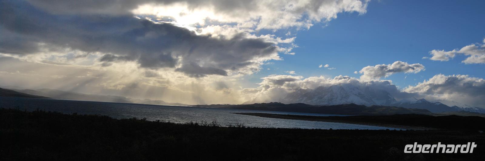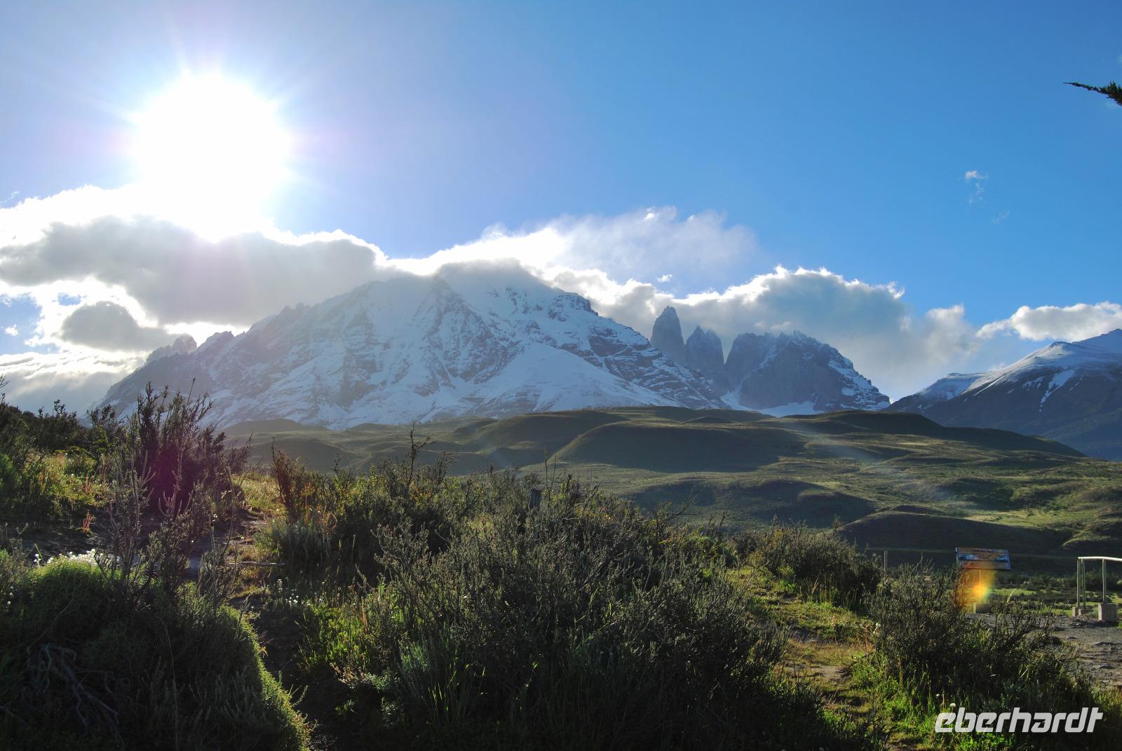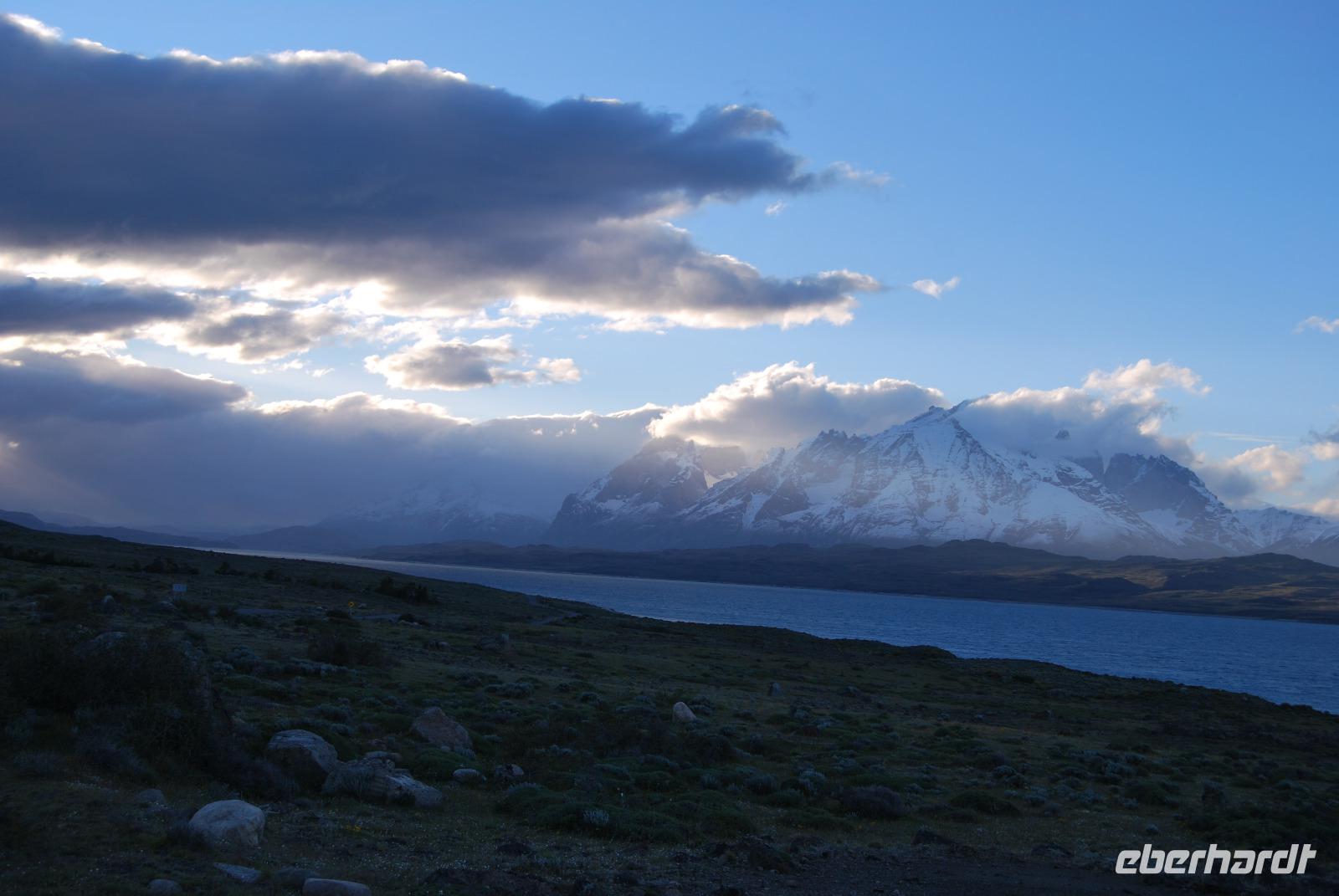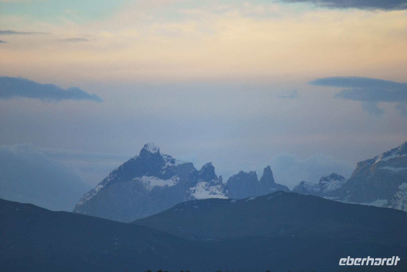 Die Sonne ging nun langsam unter. Es war gegen 21 Uhr als wir die letzten Strahlen genossen - das gewaltige Panorama der Berge und die Kondore, die über den Berghängen an ihren Nestern kreisten. Der Blick in die Ferne, zu den Torres del Paine, dem Wahrzeichen des gleichnamigen Nationalparks, erstaunte uns. Wir hatten wirklich großes Glück die Felsformation aus der Ferne zu betrachten, denn selten ist die Sicht so klar. Nach einiger Zeit verließen wir die Hauptstraße und bogen ab. Auf einer Schotterpiste ging es 25 km auf eine einsame Ranch, der Hosteria Mirador del Payne. Wir freuten uns auf das Abendessen in der kaminbeheizten Hütte und ein Bett.