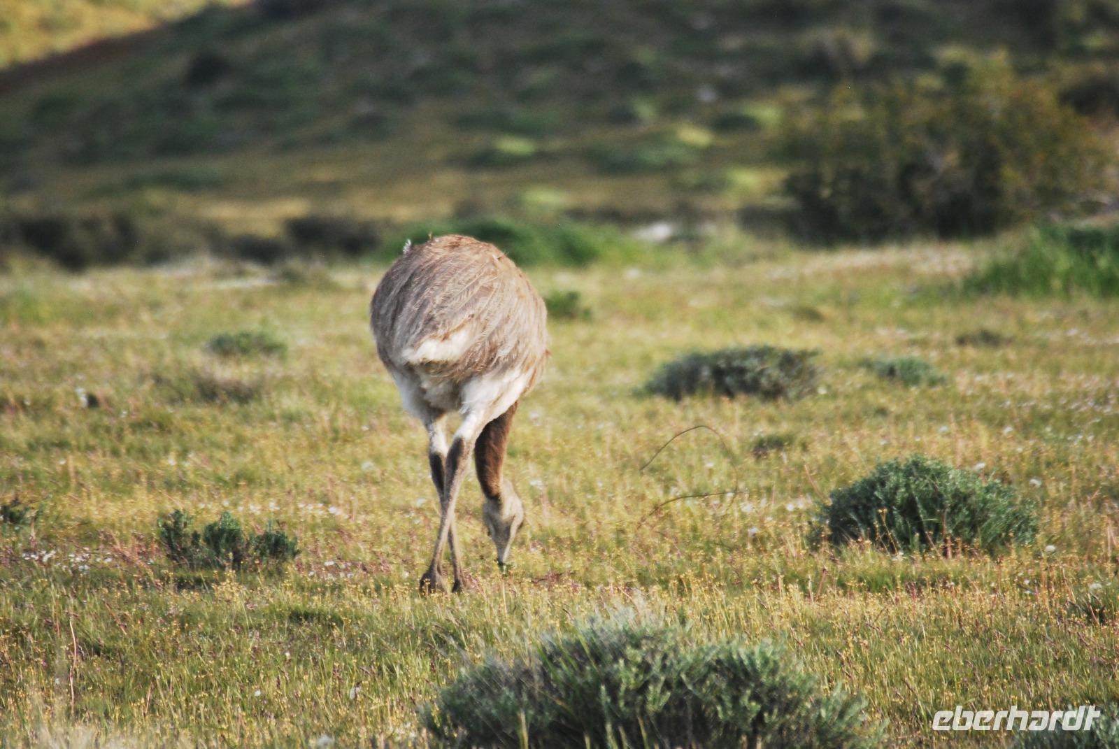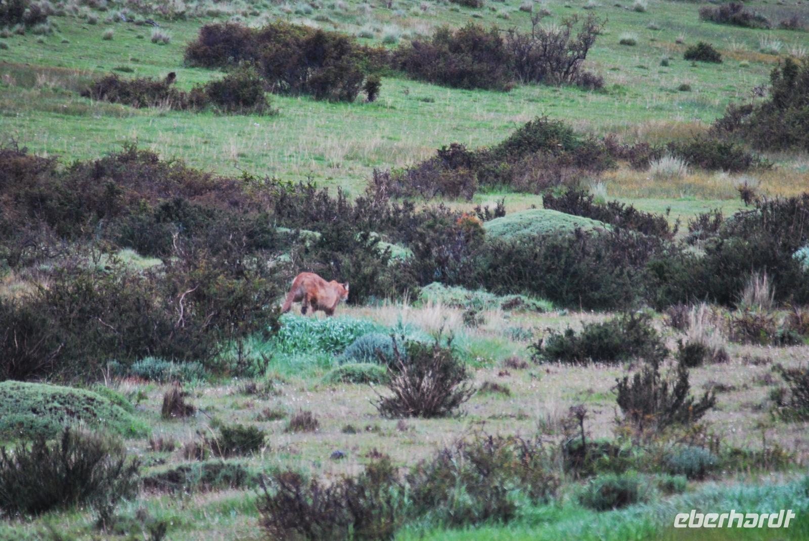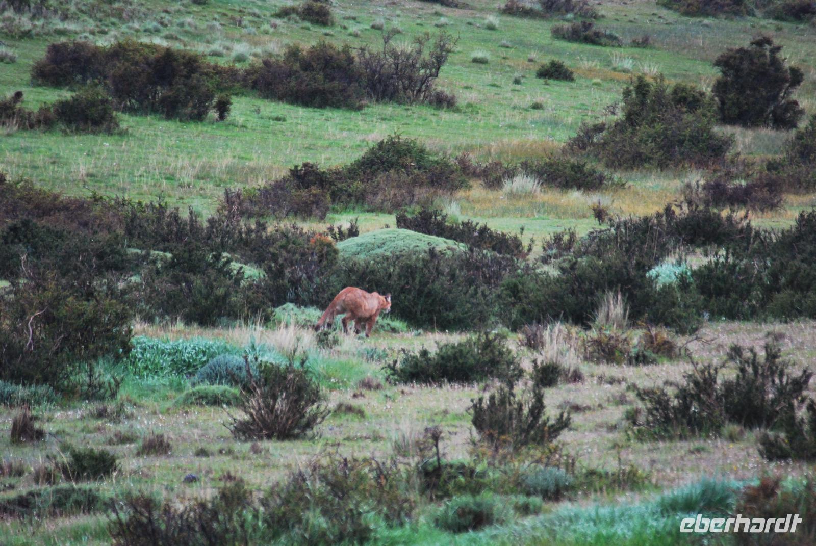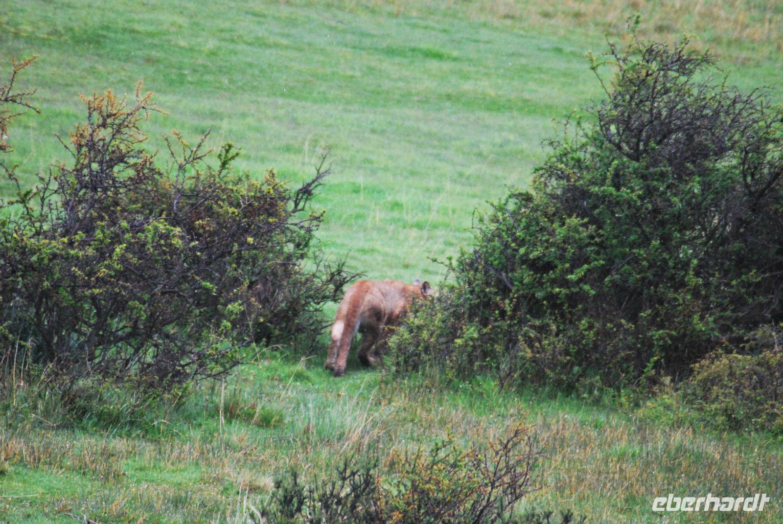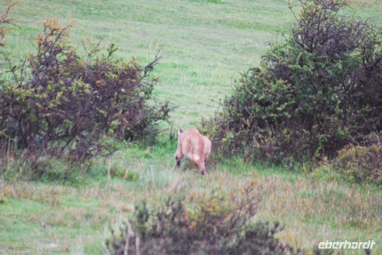 Wir fahren ein Stück weiter, wir haben den offiziellen Park noch immer nicht erreicht. Doch wir entdecken mit Erstaunen ein frisch gerissenes Tier. Ein ausgewachsener Guanako liegt dort unweit der Straße, zerfetzt und aufgerissen. Wer kann dies getan haben? - ein Puma? Es sieht noch alles recht frisch aus, wahrscheinlich ist er noch da. Wir steigen vorsichtig aus dem Auto aus. Oben auf dem Hügel steht ein Wächter, er beklagt lautstark den Verlust - oder warnt er nur die anderen von der Herde, wo der gefährliche Räuber sich befindet? Wir wissen es nicht genau. Nach einiger Zeit haben wir sein Versteck ausgemacht. Da! Hinter einem kleinen Strauch, im Dickicht hat er sich versteckt. Hin und wieder sieht man einen leichten silber-braunen Rücken blitzten. Er bewegt sich nur minimal. Vorsichtig versuche ich einen anderen Blickwinkel auf sein Versteck zu erlangen. Doch ein Ortsansässiger äußert seine Bedenken. Wir beobachten ihn eine Weile, aber geduldig harrt der Puma in seinem Versteck aus. Wir haben uns auf ungefähr 25 Meter genähert. Ab und zu scheint er sich zu bewegen, doch seine Position ist immer nur zu erahnen. Doch dann! Er wird aufgeschreckt - und entschließt sich seine frische Beute aufzugeben und den Rückzug anzutreten. Das ausgewachsene Tier verlässt sein Versteck und offenbart uns seine ganze Schönheit. Größer als wir ihn je vermutet hätten, ein Tier kann bis zu 90 Zentimeter Schulterhöhe haben, was er mit Sicherheit auch hatte, glitt er davon. Mit seinen riesigen Tatzen stampfte er elegant über die Graslandschaft. Sein seidig, silbrig-braunes Fell sah man noch von weitem glänzen. Doch war er innerhalb von wenigen Sekunden über alle Berge.