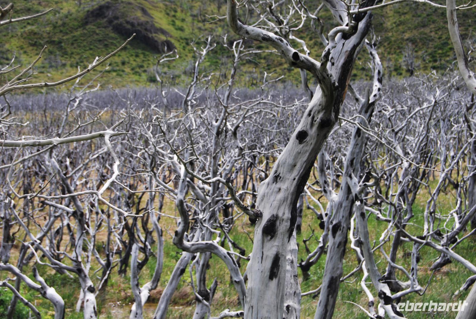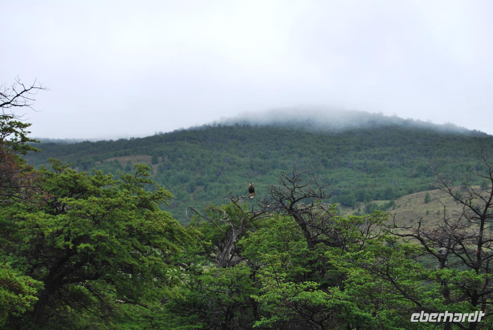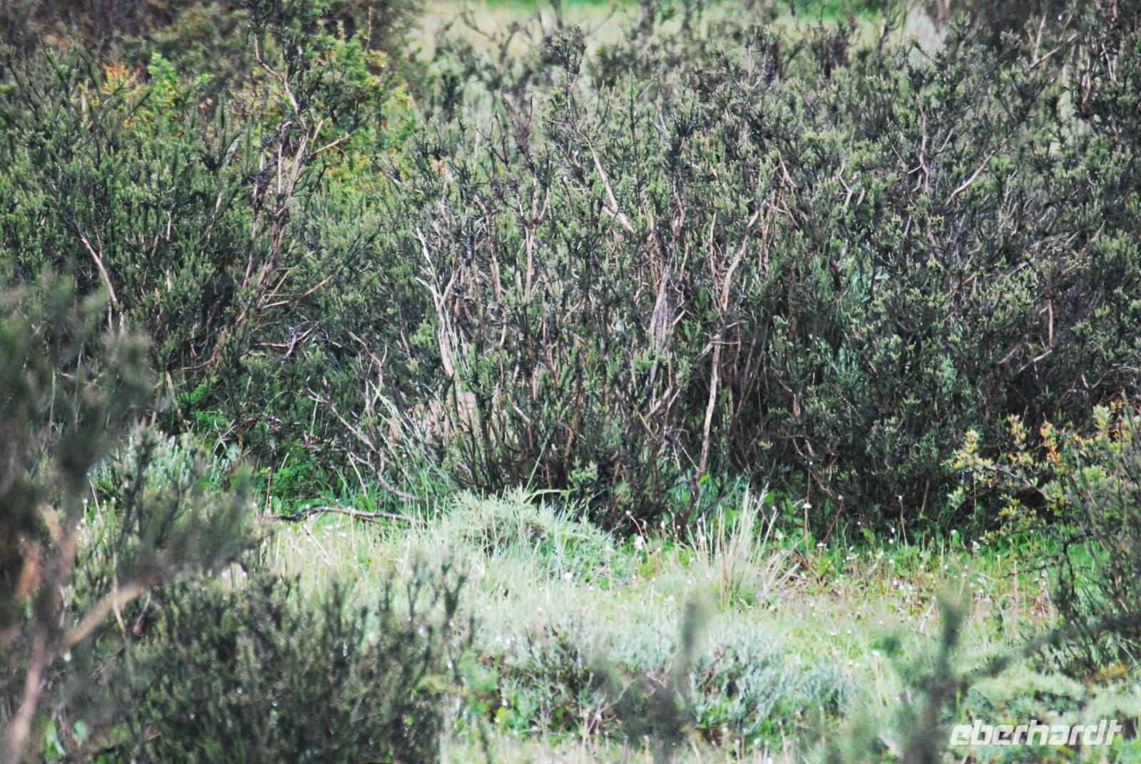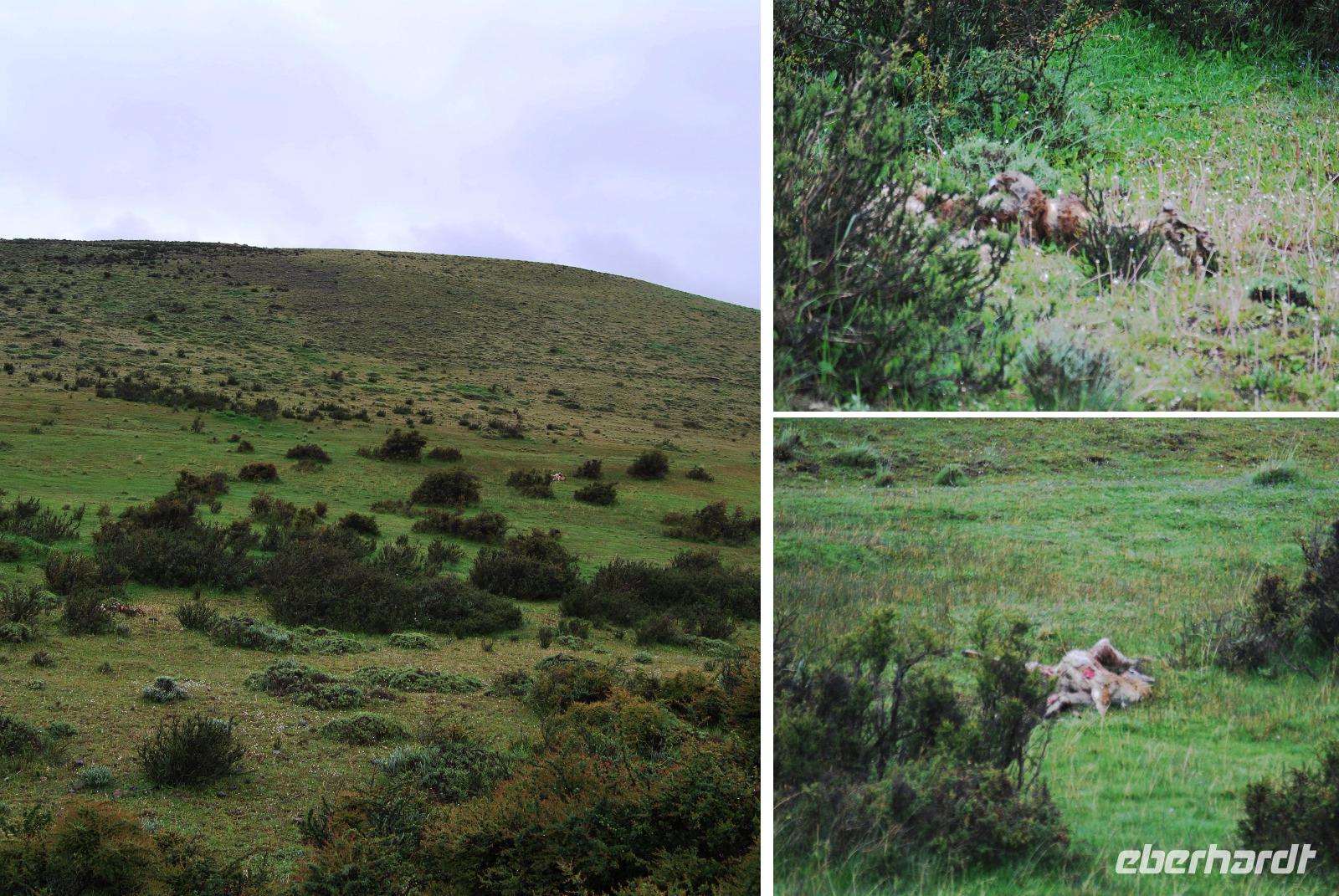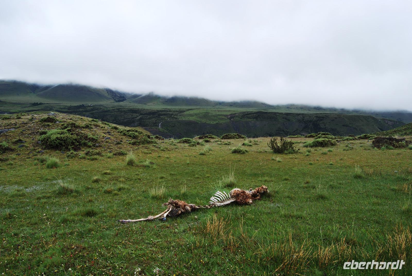 Wir fahren ein Stück weiter, wir haben den offiziellen Park noch immer nicht erreicht. Doch wir entdecken mit Erstaunen ein frisch gerissenes Tier. Ein ausgewachsener Guanako liegt dort unweit der Straße, zerfetzt und aufgerissen. Wer kann dies getan haben? - ein Puma? Es sieht noch alles recht frisch aus, wahrscheinlich ist er noch da. Wir steigen vorsichtig aus dem Auto aus. Oben auf dem Hügel steht ein Wächter, er beklagt lautstark den Verlust - oder warnt er nur die anderen von der Herde, wo der gefährliche Räuber sich befindet? Wir wissen es nicht genau. Nach einiger Zeit haben wir sein Versteck ausgemacht. Da! Hinter einem kleinen Strauch, im Dickicht hat er sich versteckt. Hin und wieder sieht man einen leichten silber-braunen Rücken blitzten. Er bewegt sich nur minimal. Vorsichtig versuche ich einen anderen Blickwinkel auf sein Versteck zu erlangen. Doch ein Ortsansässiger äußert seine Bedenken. Wir beobachten ihn eine Weile, aber geduldig harrt der Puma in seinem Versteck aus. Wir haben uns auf ungefähr 25 Meter genähert. Ab und zu scheint er sich zu bewegen, doch seine Position ist immer nur zu erahnen. Doch dann! Er wird aufgeschreckt - und entschließt sich seine frische Beute aufzugeben und den Rückzug anzutreten. Das ausgewachsene Tier verlässt sein Versteck und offenbart uns seine ganze Schönheit. Größer als wir ihn je vermutet hätten, ein Tier kann bis zu 90 Zentimeter Schulterhöhe haben, was er mit Sicherheit auch hatte, glitt er davon. Mit seinen riesigen Tatzen stampfte er elegant über die Graslandschaft. Sein seidig, silbrig-braunes Fell sah man noch von weitem glänzen. Doch war er innerhalb von wenigen Sekunden über alle Berge.