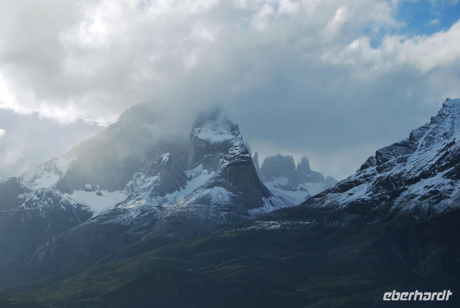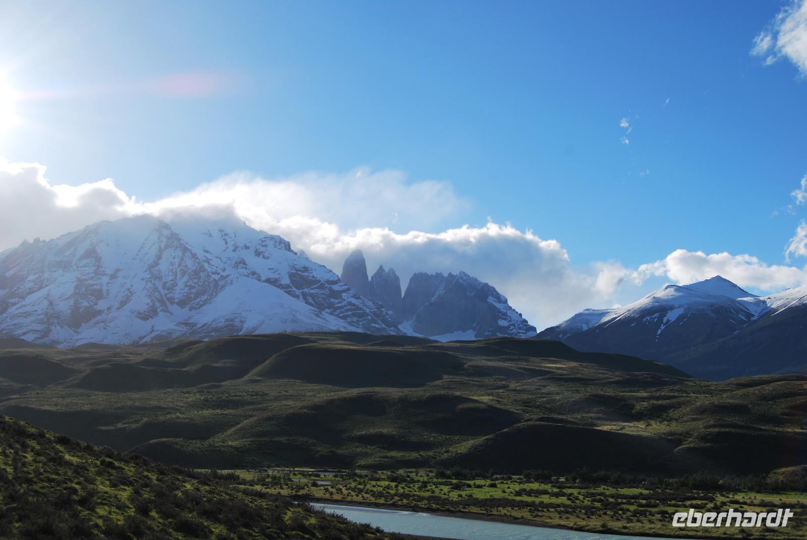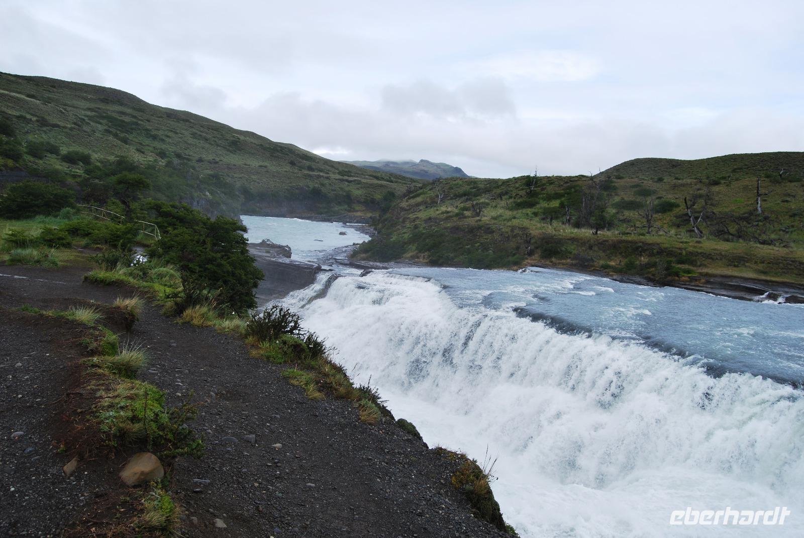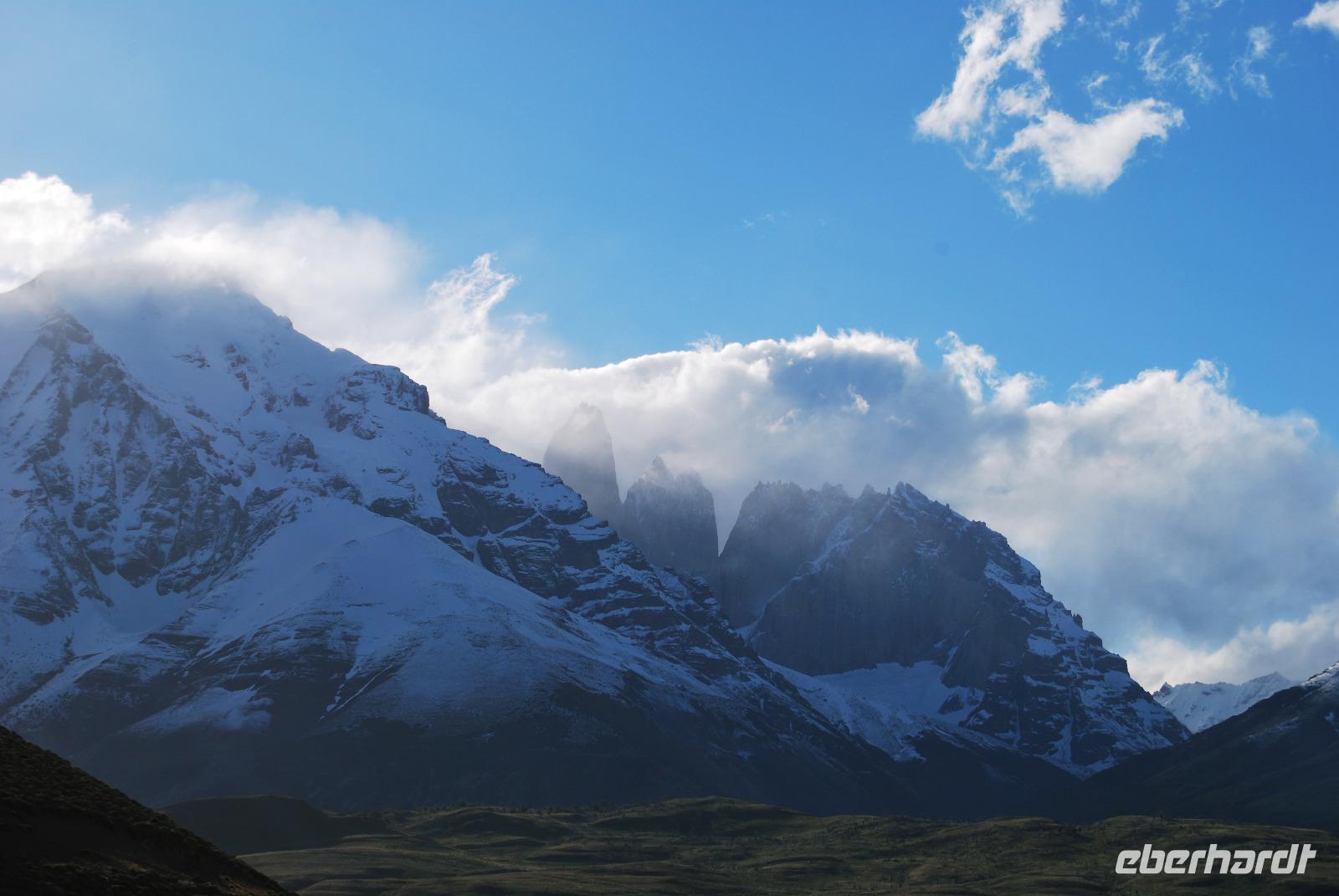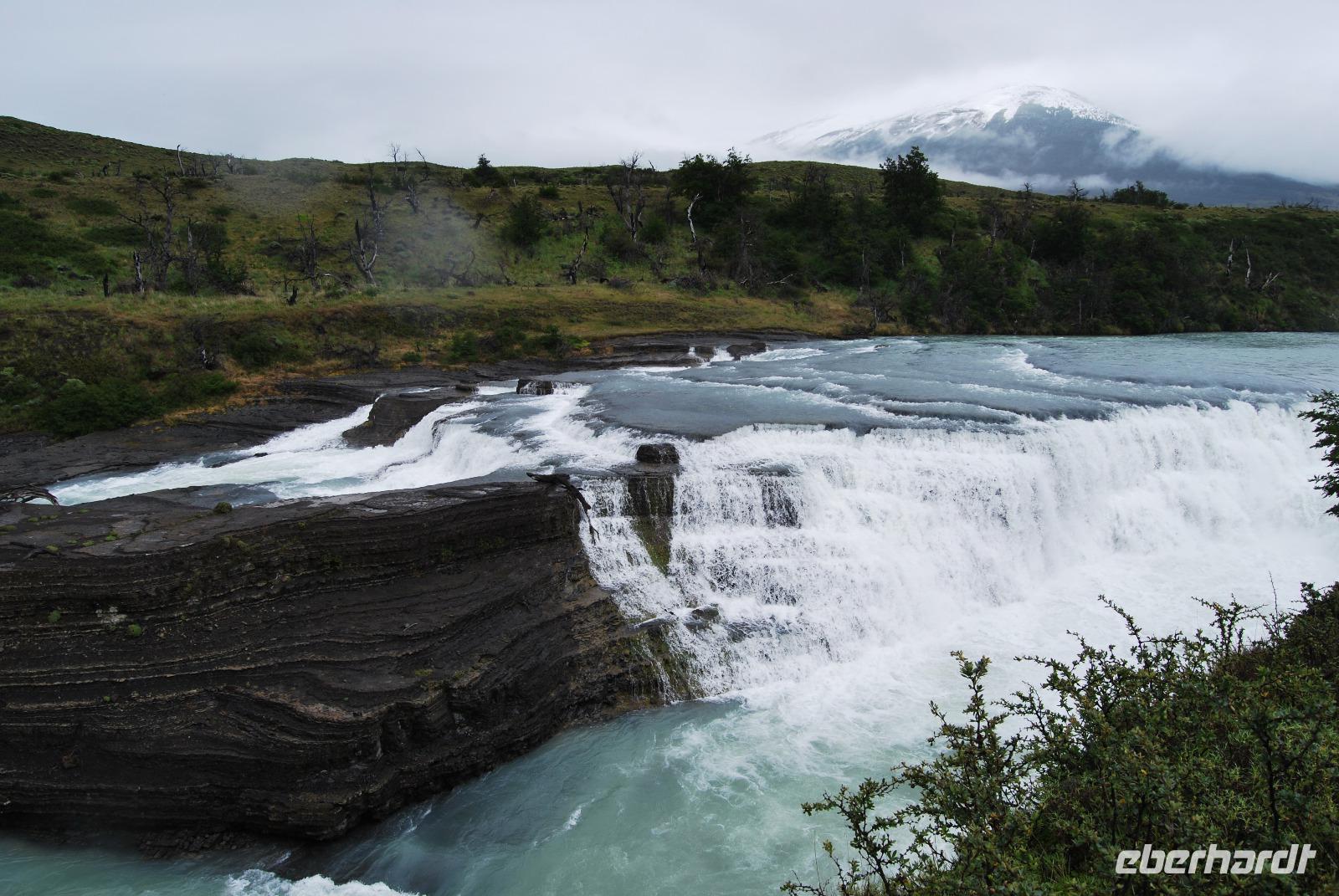 Unsere Reise führte uns weiter zum Largo Azul. Auf dem Rückweg von diesem Aussichtspunkt sagte Omar wir sollen uns gut festhalten. Durch den Regen war die Straße sehr aufgeweicht. Mit Schwung ging es durch den Schlamm. Der Wagen rutschte etwas, aber wir kamen durch und blieben nicht stecken. Mit Gejubel und Getöse wurde der Fahrer gefeiert. Dann ist die Straße wieder etwas besser und wir kommen gut voran. Wir besuchen noch ein paar Wasserfälle, darunter den Salto Grande. Immer wieder haben wir das grandiose Bergpanorama des Cerro Paine Grande, mit 3.050 Metern Höhe, und des Torres del Paine, mit 2.850 Metern vor der Nase. Denn das Glück war wieder einmal auf unserer Seite. Ohne den diesigen Nebel hätten wir den Puma wahrscheinlich nie zu Gesicht bekommen. Und nun klarte es auch noch auf und das Antlitz der gewaltigen Berge gab sich immer mehr zu erkennen.