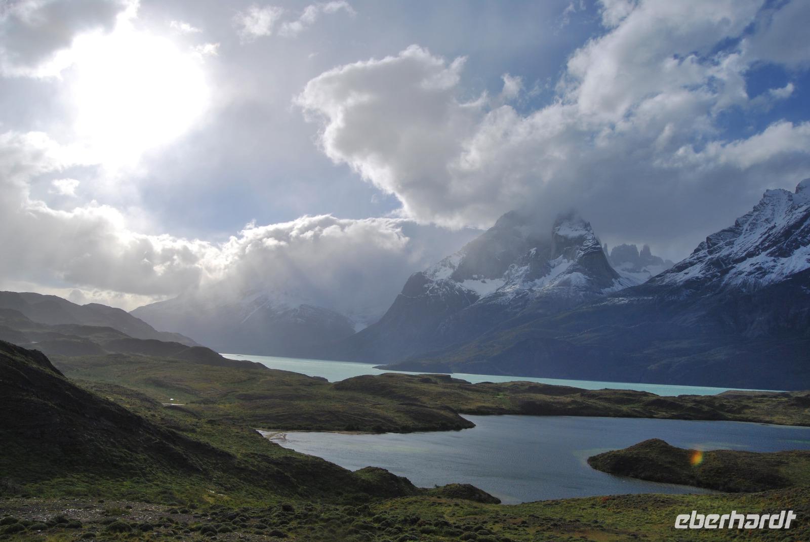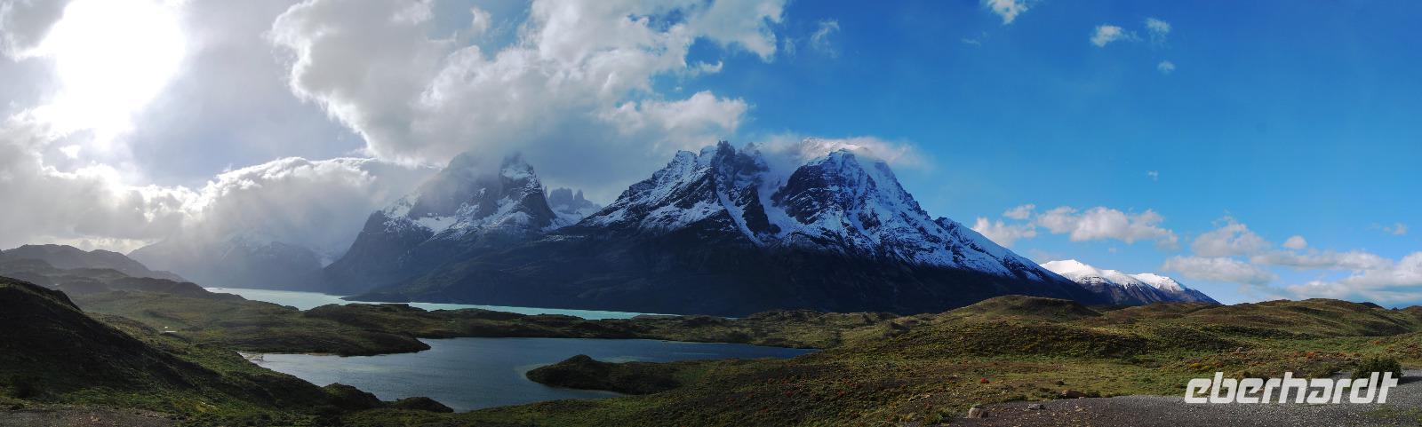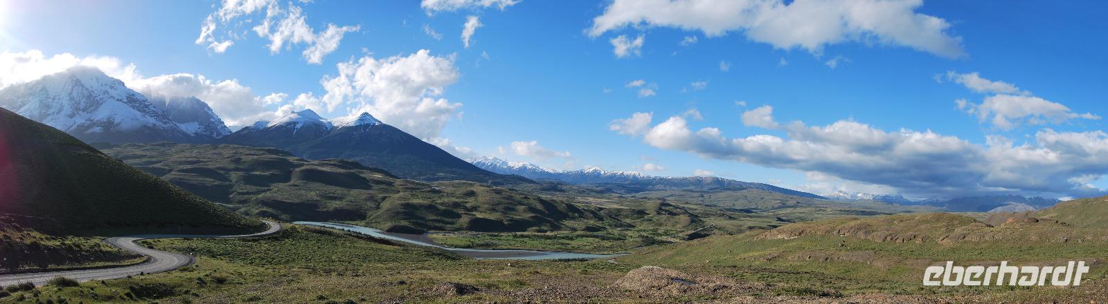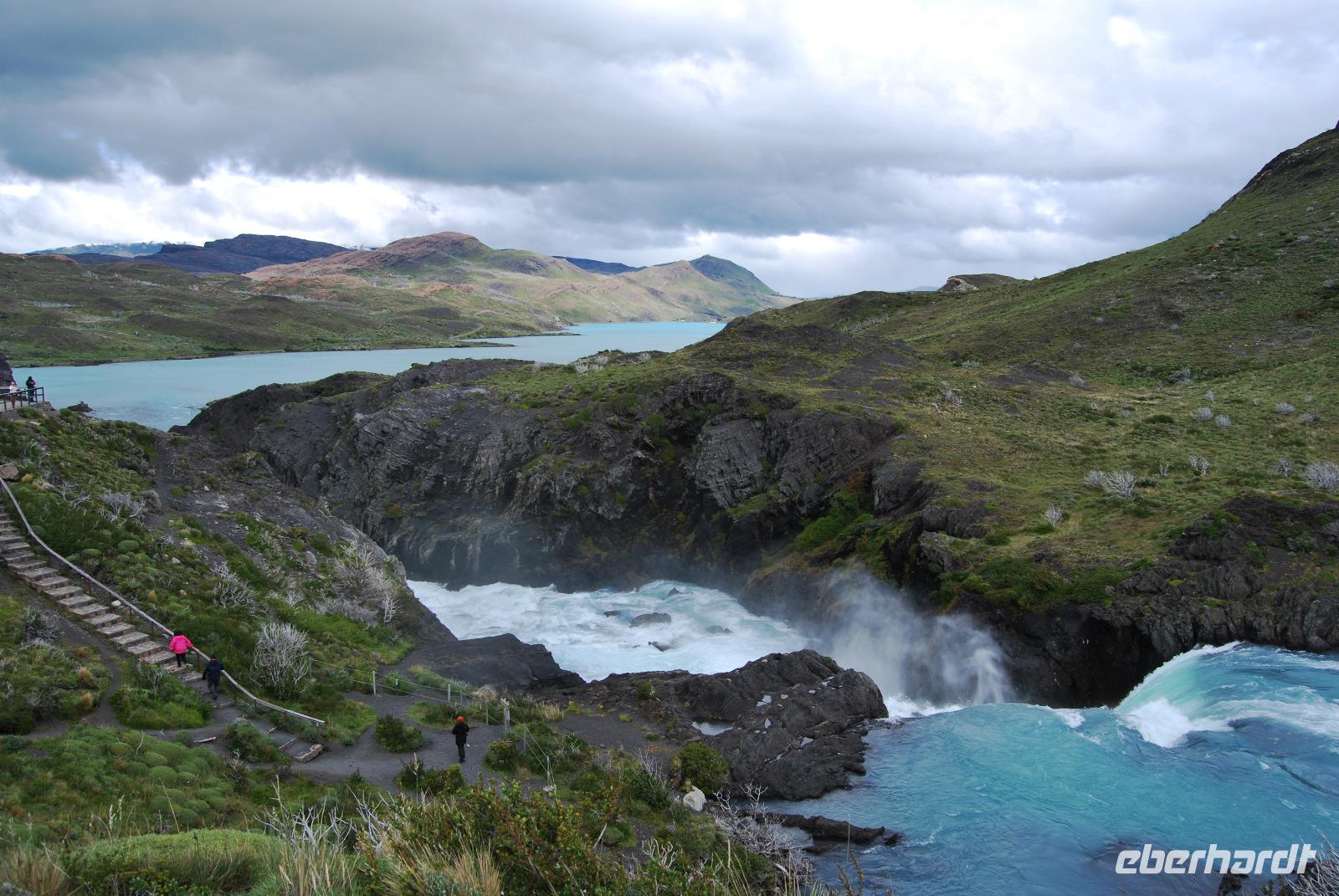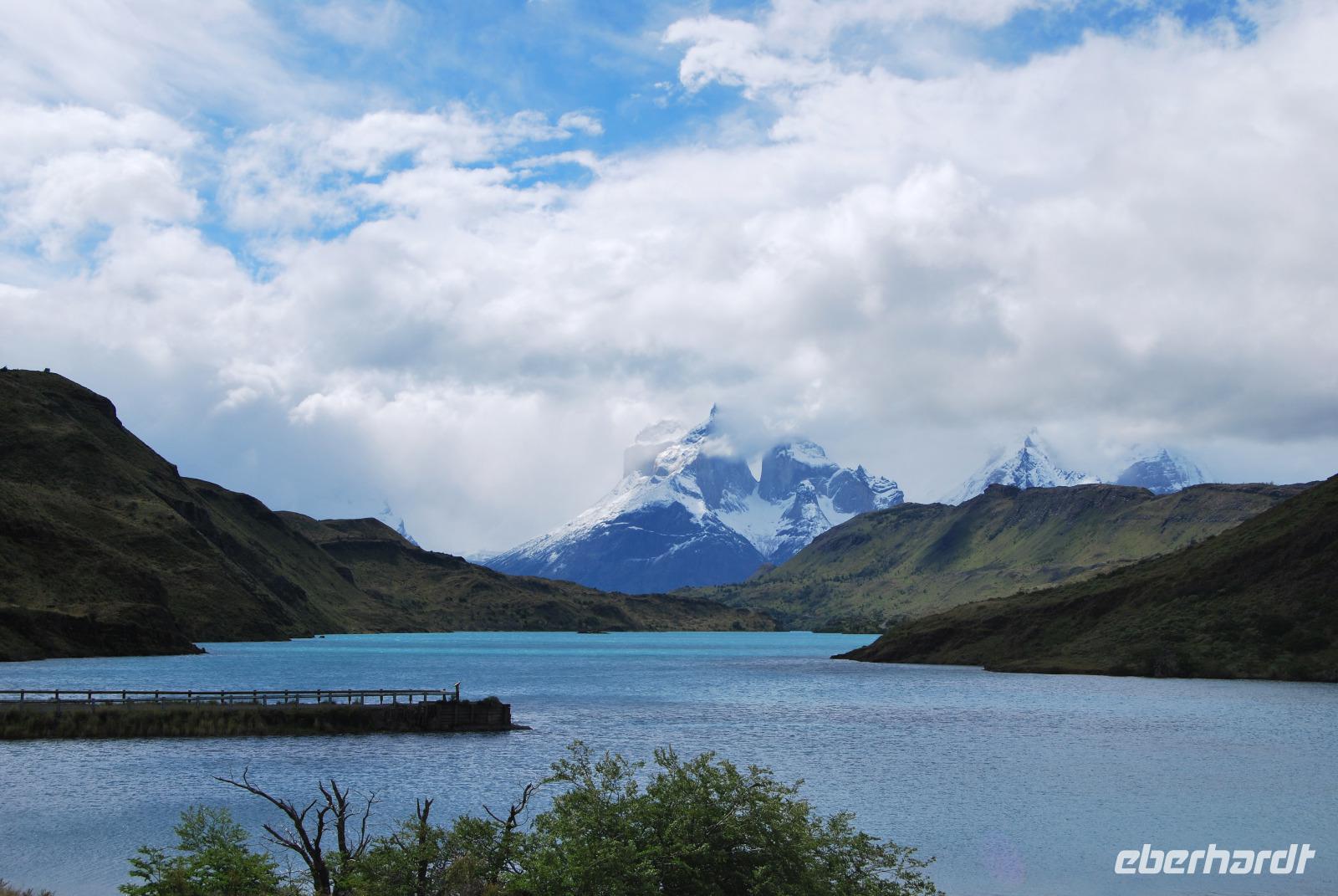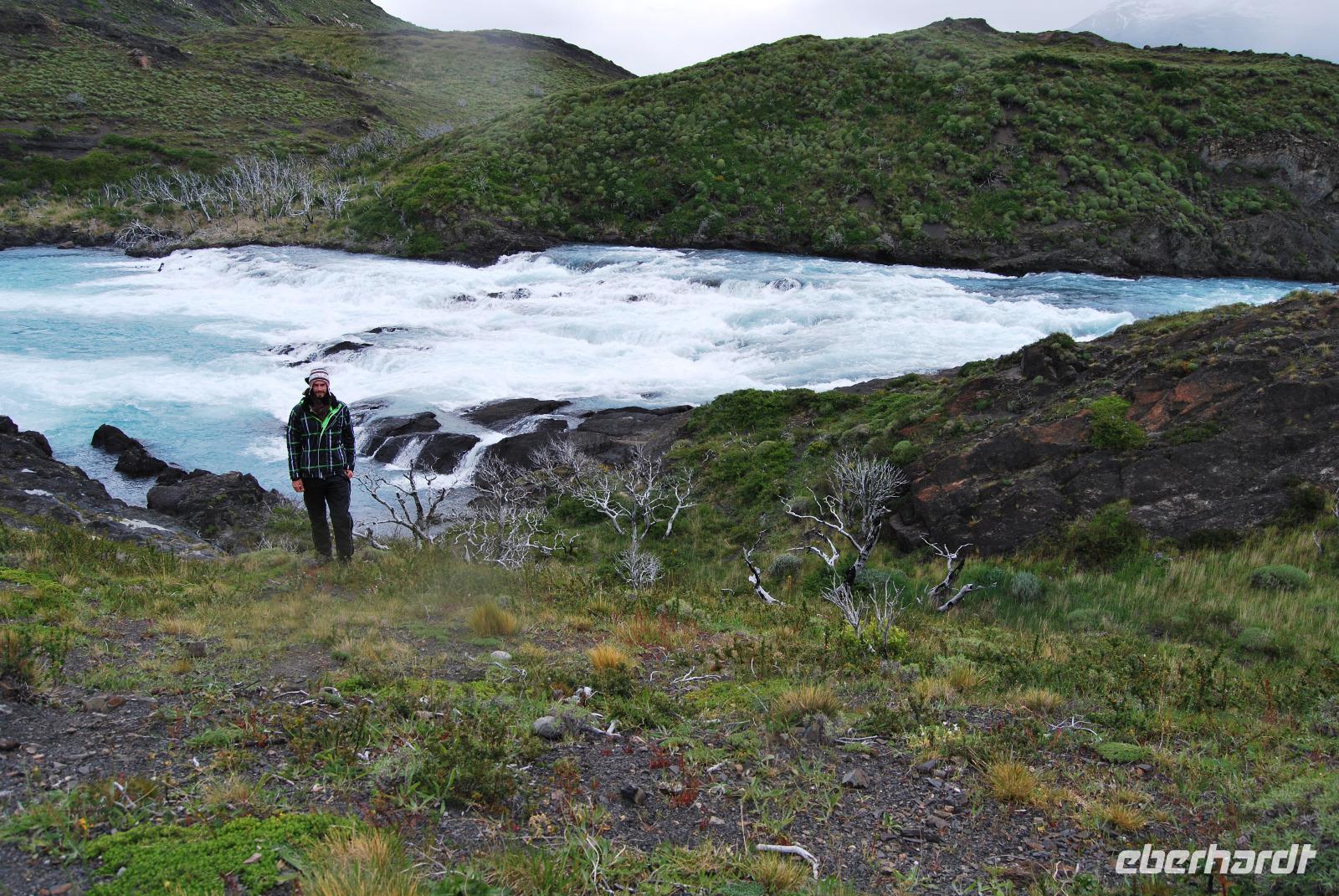 Unsere Reise führte uns weiter zum Largo Azul. Auf dem Rückweg von diesem Aussichtspunkt sagte Omar wir sollen uns gut festhalten. Durch den Regen war die Straße sehr aufgeweicht. Mit Schwung ging es durch den Schlamm. Der Wagen rutschte etwas, aber wir kamen durch und blieben nicht stecken. Mit Gejubel und Getöse wurde der Fahrer gefeiert. Dann ist die Straße wieder etwas besser und wir kommen gut voran. Wir besuchen noch ein paar Wasserfälle, darunter den Salto Grande. Immer wieder haben wir das grandiose Bergpanorama des Cerro Paine Grande, mit 3.050 Metern Höhe, und des Torres del Paine, mit 2.850 Metern vor der Nase. Denn das Glück war wieder einmal auf unserer Seite. Ohne den diesigen Nebel hätten wir den Puma wahrscheinlich nie zu Gesicht bekommen. Und nun klarte es auch noch auf und das Antlitz der gewaltigen Berge gab sich immer mehr zu erkennen.
