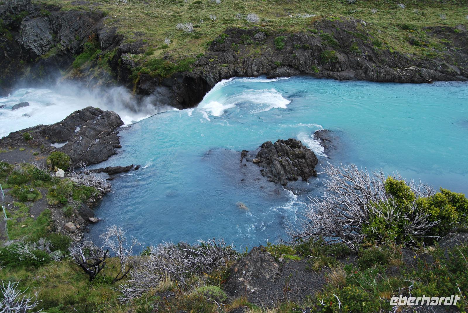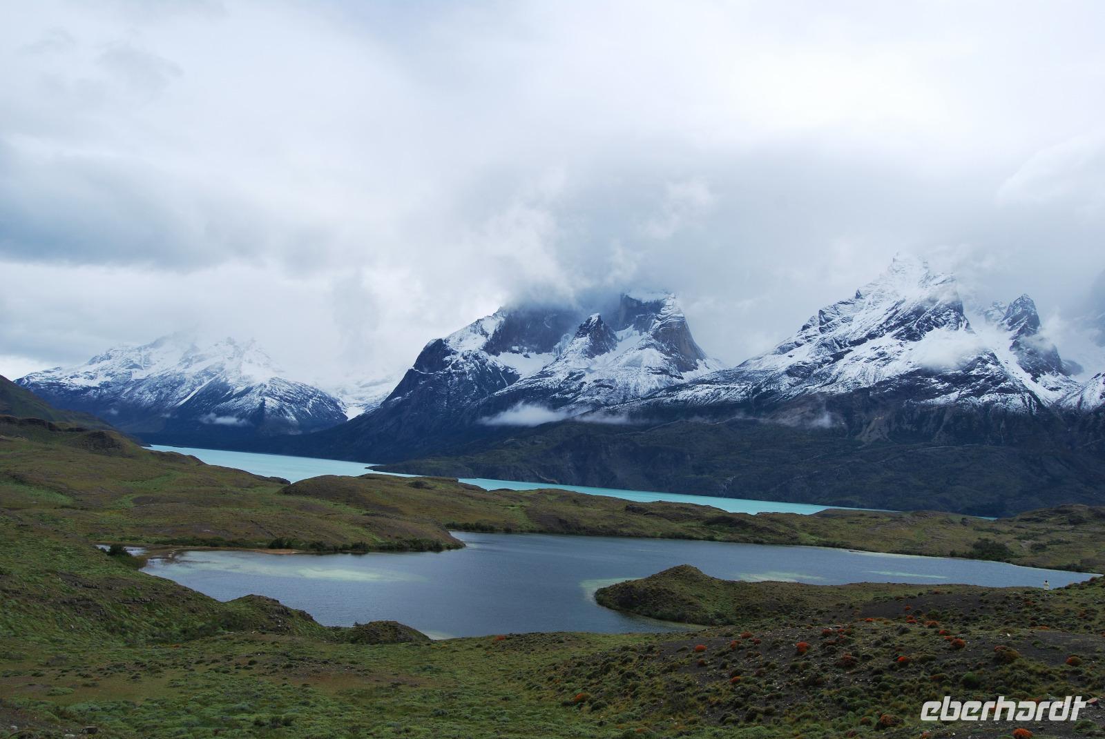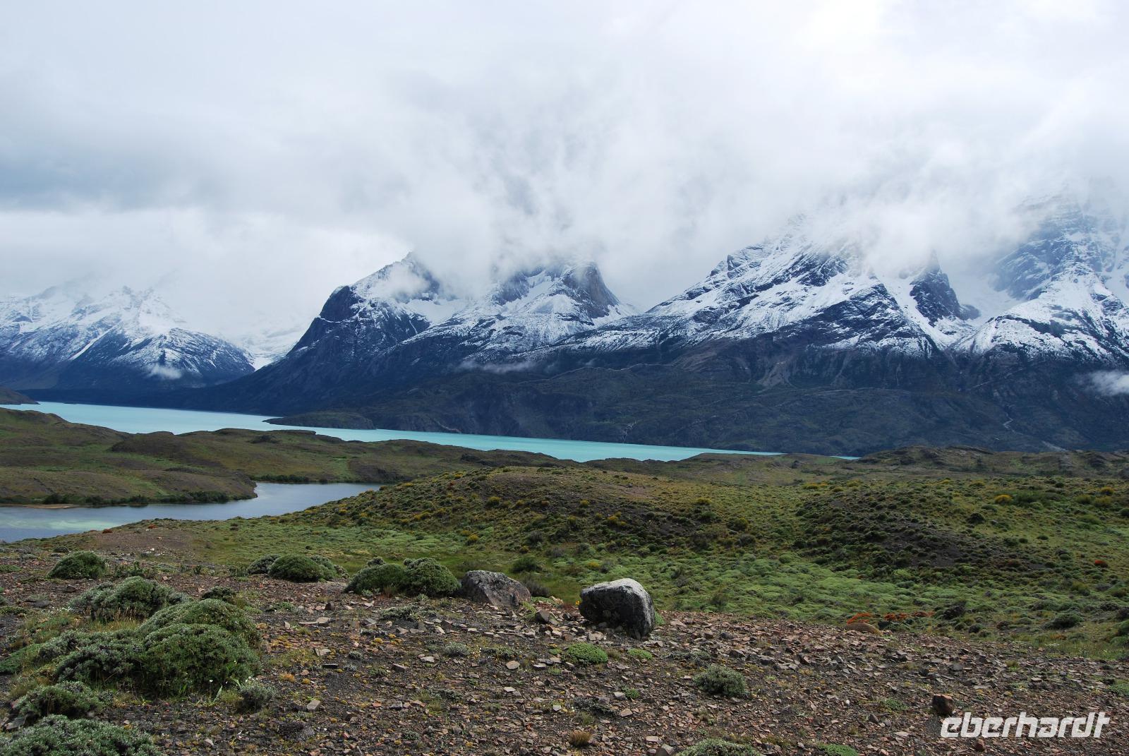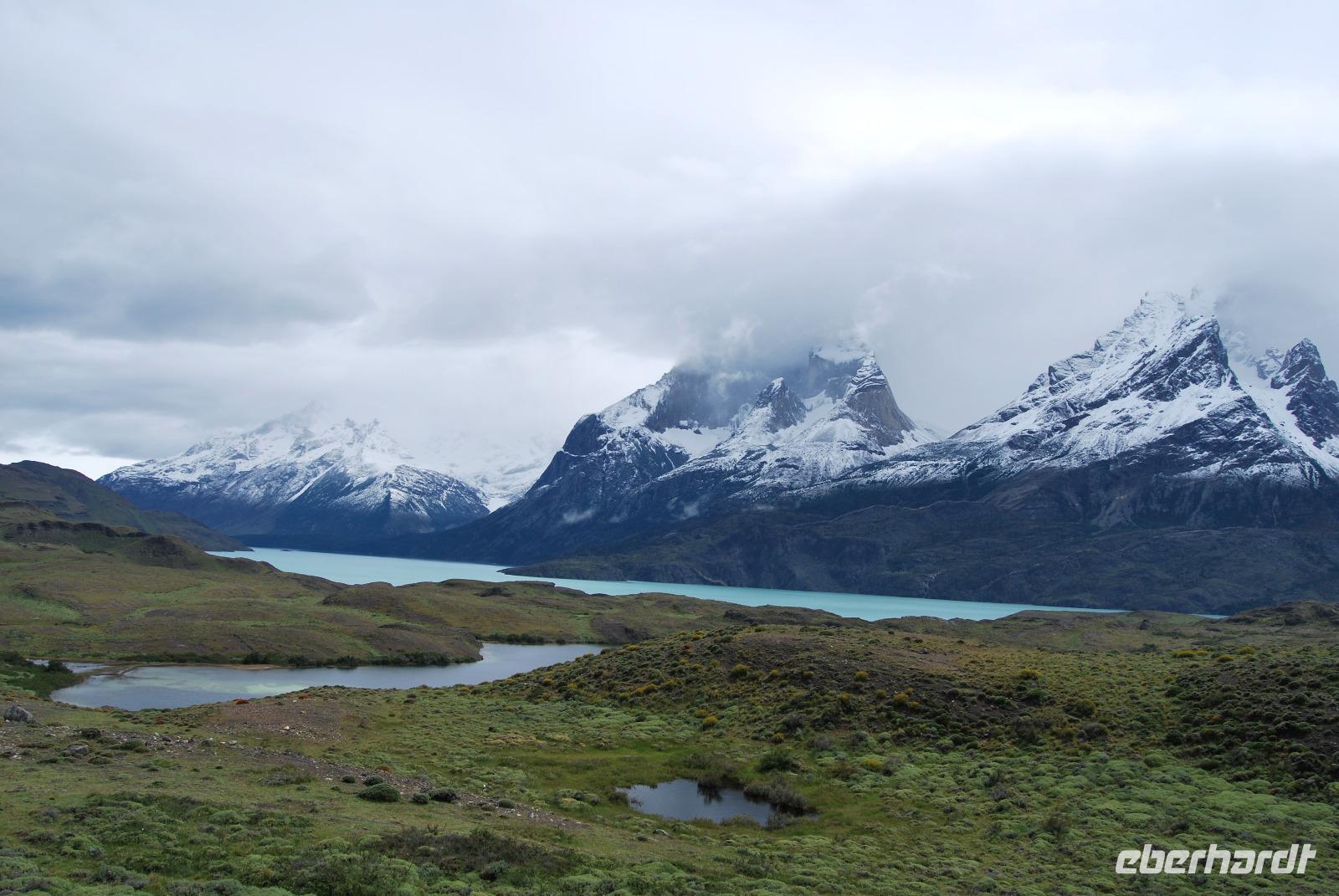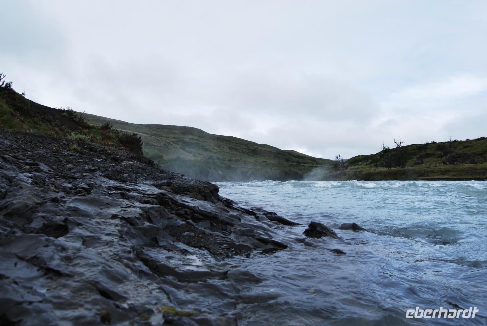 Unsere Reise führte uns weiter zum Largo Azul. Auf dem Rückweg von diesem Aussichtspunkt sagte Omar wir sollen uns gut festhalten. Durch den Regen war die Straße sehr aufgeweicht. Mit Schwung ging es durch den Schlamm. Der Wagen rutschte etwas, aber wir kamen durch und blieben nicht stecken. Mit Gejubel und Getöse wurde der Fahrer gefeiert. Dann ist die Straße wieder etwas besser und wir kommen gut voran. Wir besuchen noch ein paar Wasserfälle, darunter den Salto Grande. Immer wieder haben wir das grandiose Bergpanorama des Cerro Paine Grande, mit 3.050 Metern Höhe, und des Torres del Paine, mit 2.850 Metern vor der Nase. Denn das Glück war wieder einmal auf unserer Seite. Ohne den diesigen Nebel hätten wir den Puma wahrscheinlich nie zu Gesicht bekommen. Und nun klarte es auch noch auf und das Antlitz der gewaltigen Berge gab sich immer mehr zu erkennen.