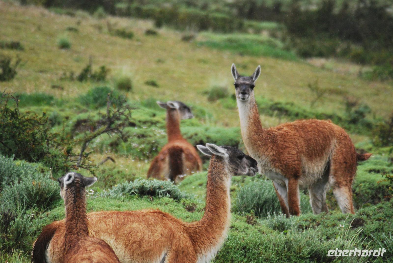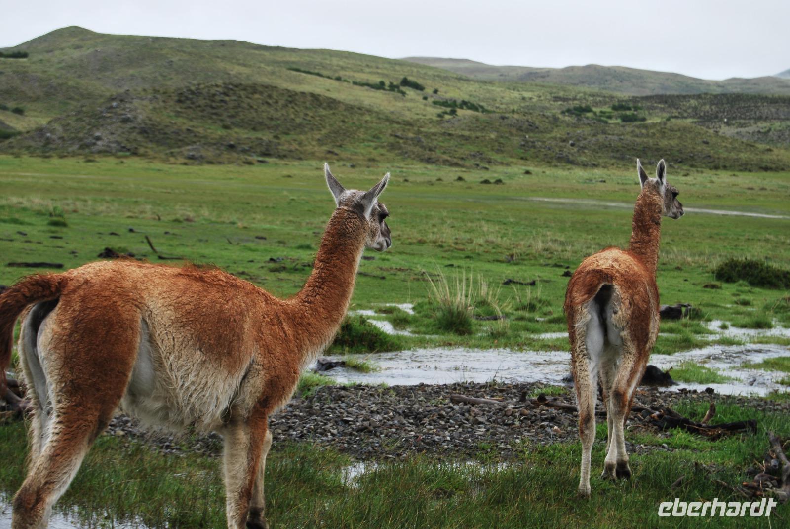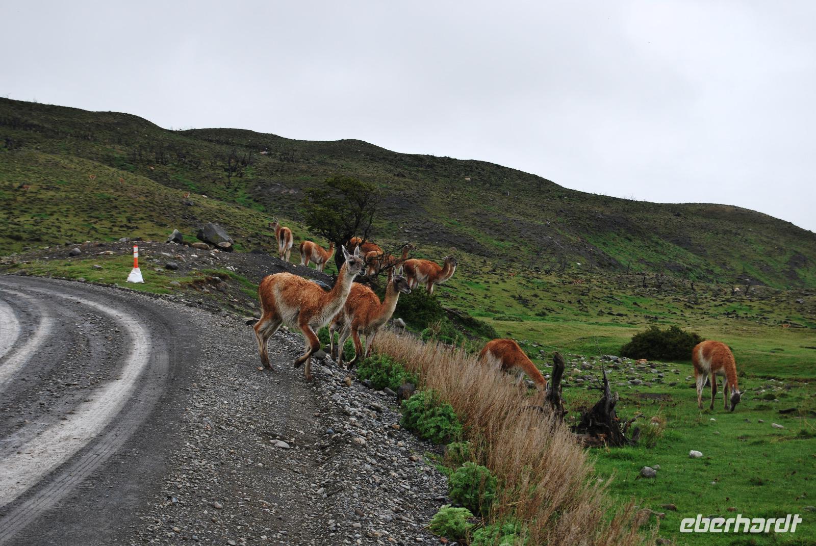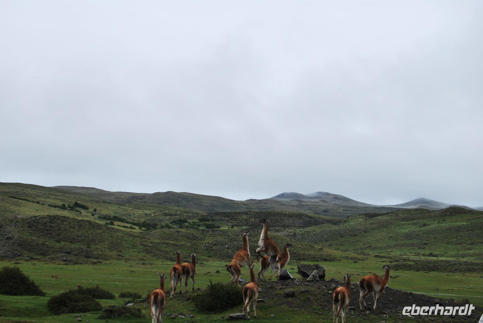 Voller Vorfreude erwachte ich - wie sieht es hier wohl am Tage aus? Doch dann, beim Verlassen der Baracke, ein kalter Schlag ins Gesicht. Schneeregen, eisiger Wind und eine Sichtweite von unter hundert Metern. Auch im Haupthaus während des Frühstücks wurde das Wetter in keinster Weise besser. Aber davon ließen wir uns nicht abschrecken. Gut ausgerüstet fuhren wir zum National Park Torre del Paine. Neben Tatjana und Omar begleitete uns heute noch ein Guide vom National Park - Paula. Auf unserer Fahrt in den Park sahen wir die erste größere Herde Guanakos, eine wildlebende Art der Familie der Kamele, die als Urform der Lamas gilt. Sie haben eine Kopfrumpflänge von 120 bis 220 Zentimetern. Wir stiegen aus und betrachteten ihre Schönheit: rötliches Fell auf dem Rücken und weiß am Bauch, große Augen und langen spitze Ohren. Schnell bemerken wir die verblüffende Parallele der Guanakos und der Inkas. Wie bei den Inkas haben die Guanakos auf jedem Hügel einen Wächter stehen. Manchmal über mehrere Hügel hinweg. Die Herde weiß stets was um sie herum passiert und sie können beruhigt und friedlich grasen. Die zahlreichen Wächter auf den Hügeln können so stets kommunizieren und gegebenenfalls alarmschlagen.