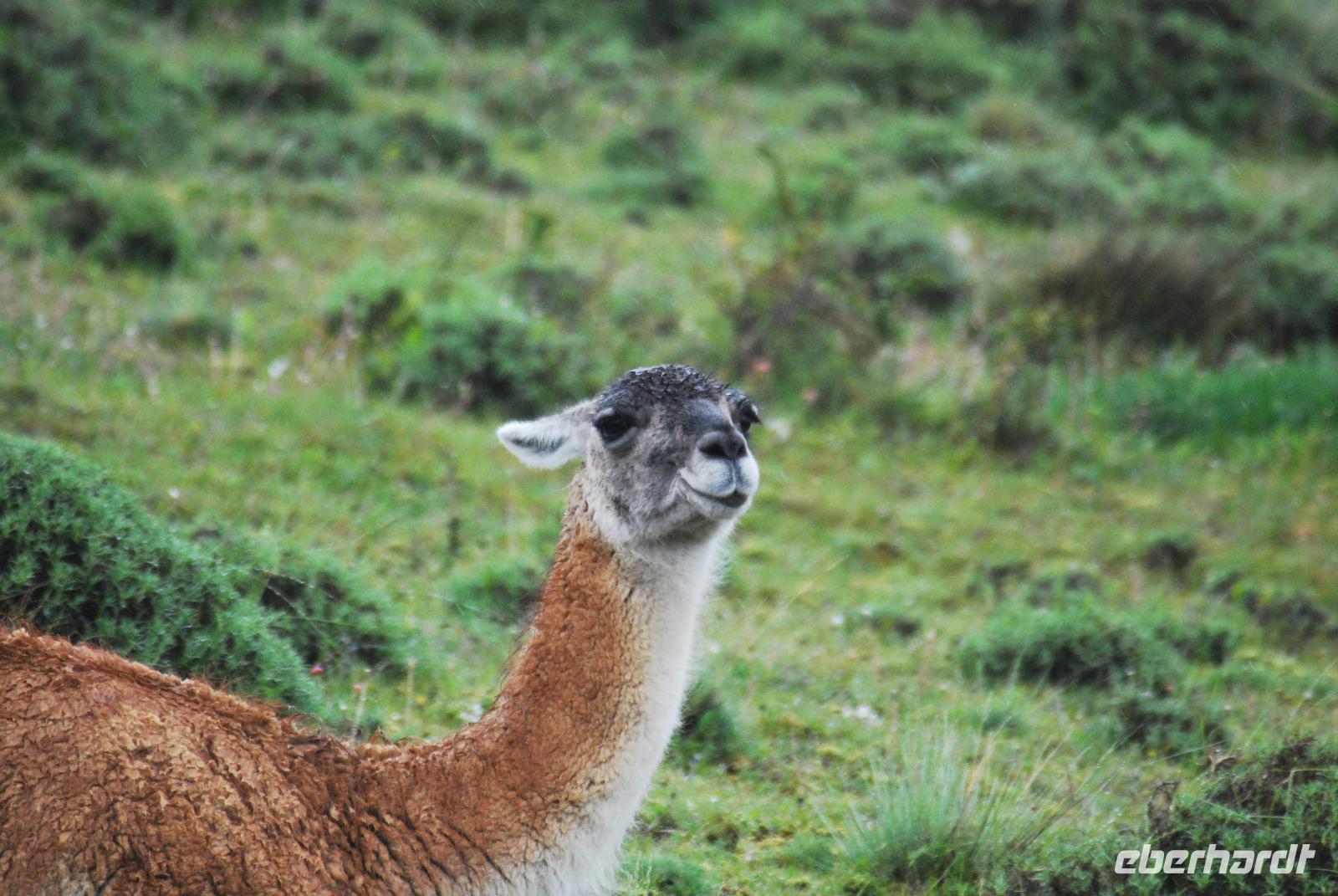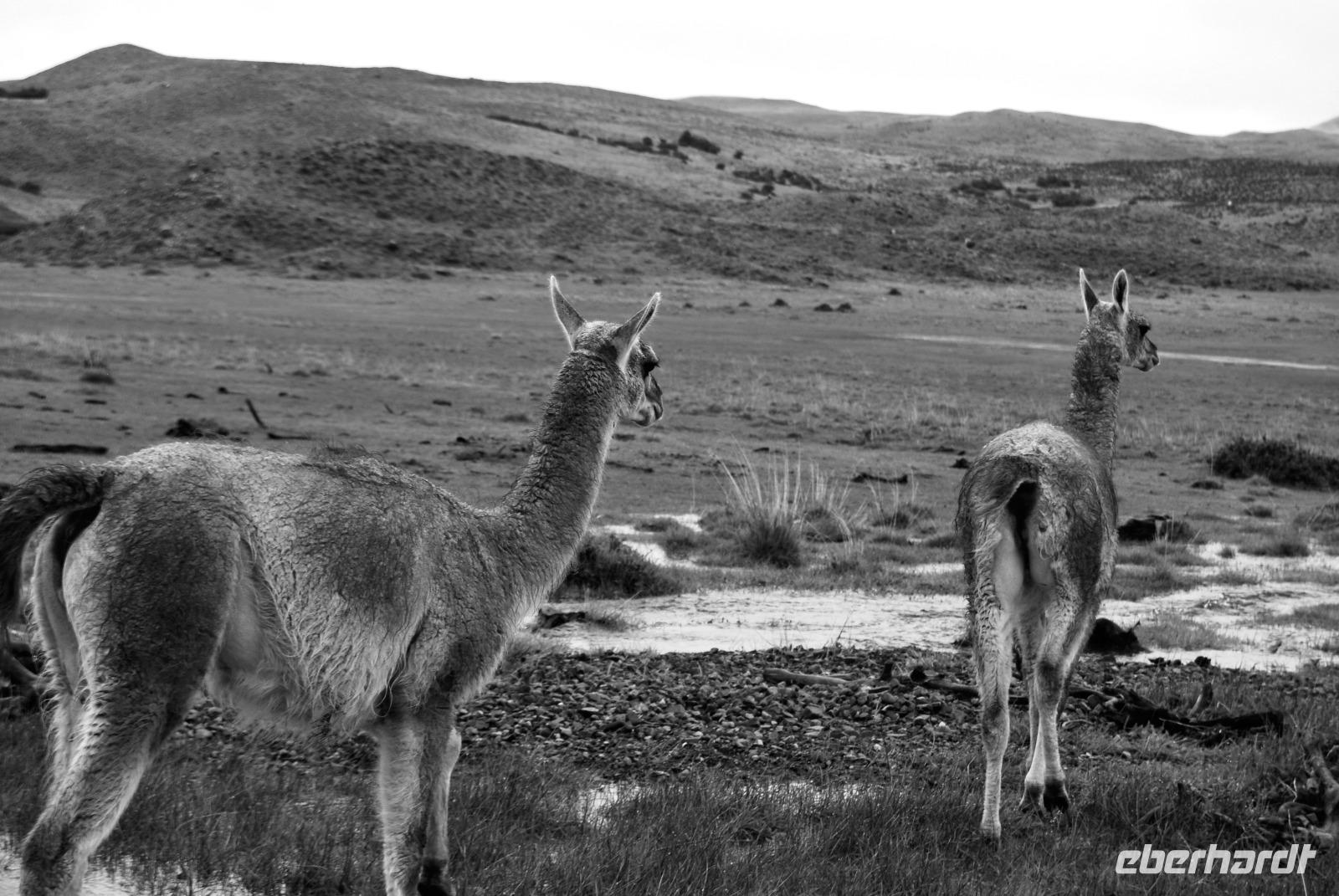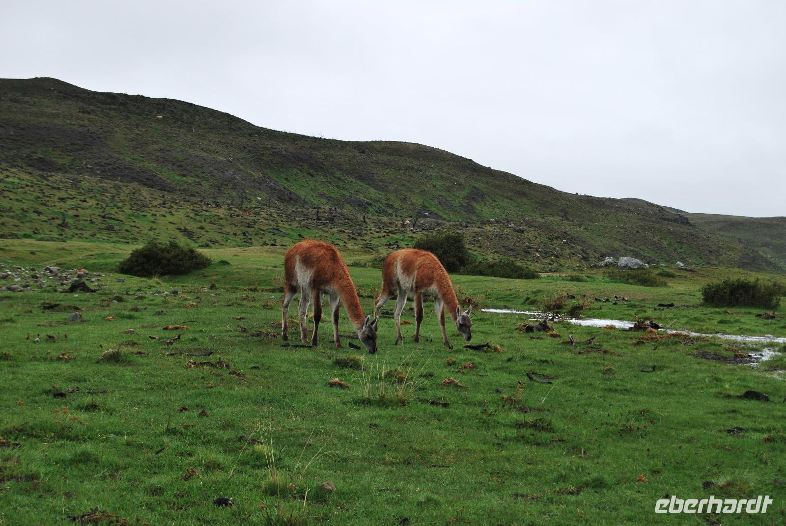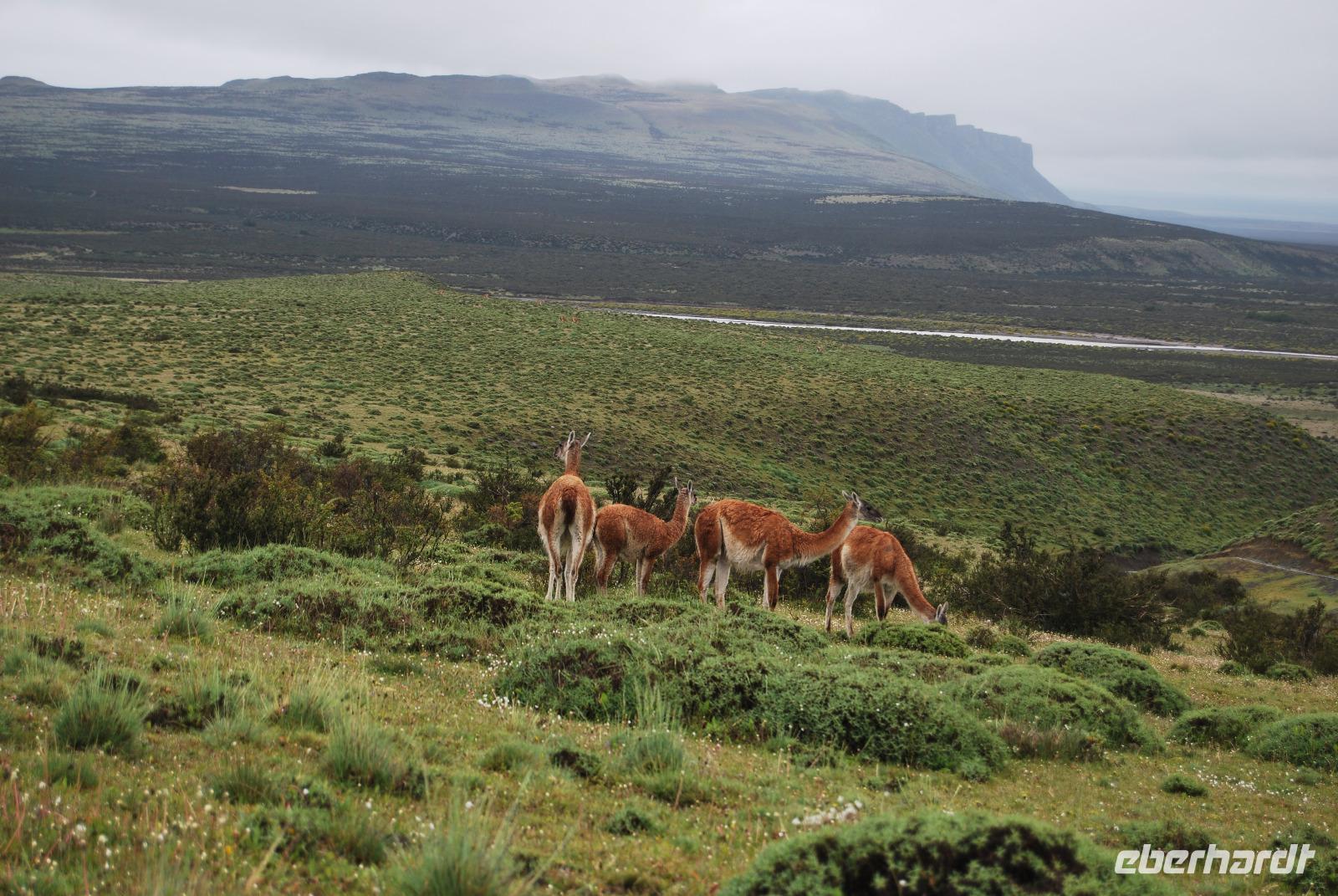 Voller Vorfreude erwachte ich - wie sieht es hier wohl am Tage aus? Doch dann, beim Verlassen der Baracke, ein kalter Schlag ins Gesicht. Schneeregen, eisiger Wind und eine Sichtweite von unter hundert Metern. Auch im Haupthaus während des Frühstücks wurde das Wetter in keinster Weise besser. Aber davon ließen wir uns nicht abschrecken. Gut ausgerüstet fuhren wir zum National Park Torre del Paine. Neben Tatjana und Omar begleitete uns heute noch ein Guide vom National Park - Paula. Auf unserer Fahrt in den Park sahen wir die erste größere Herde Guanakos, eine wildlebende Art der Familie der Kamele, die als Urform der Lamas gilt. Sie haben eine Kopfrumpflänge von 120 bis 220 Zentimetern. Wir stiegen aus und betrachteten ihre Schönheit: rötliches Fell auf dem Rücken und weiß am Bauch, große Augen und langen spitze Ohren. Schnell bemerken wir die verblüffende Parallele der Guanakos und der Inkas. Wie bei den Inkas haben die Guanakos auf jedem Hügel einen Wächter stehen. Manchmal über mehrere Hügel hinweg. Die Herde weiß stets was um sie herum passiert und sie können beruhigt und friedlich grasen. Die zahlreichen Wächter auf den Hügeln können so stets kommunizieren und gegebenenfalls alarmschlagen.