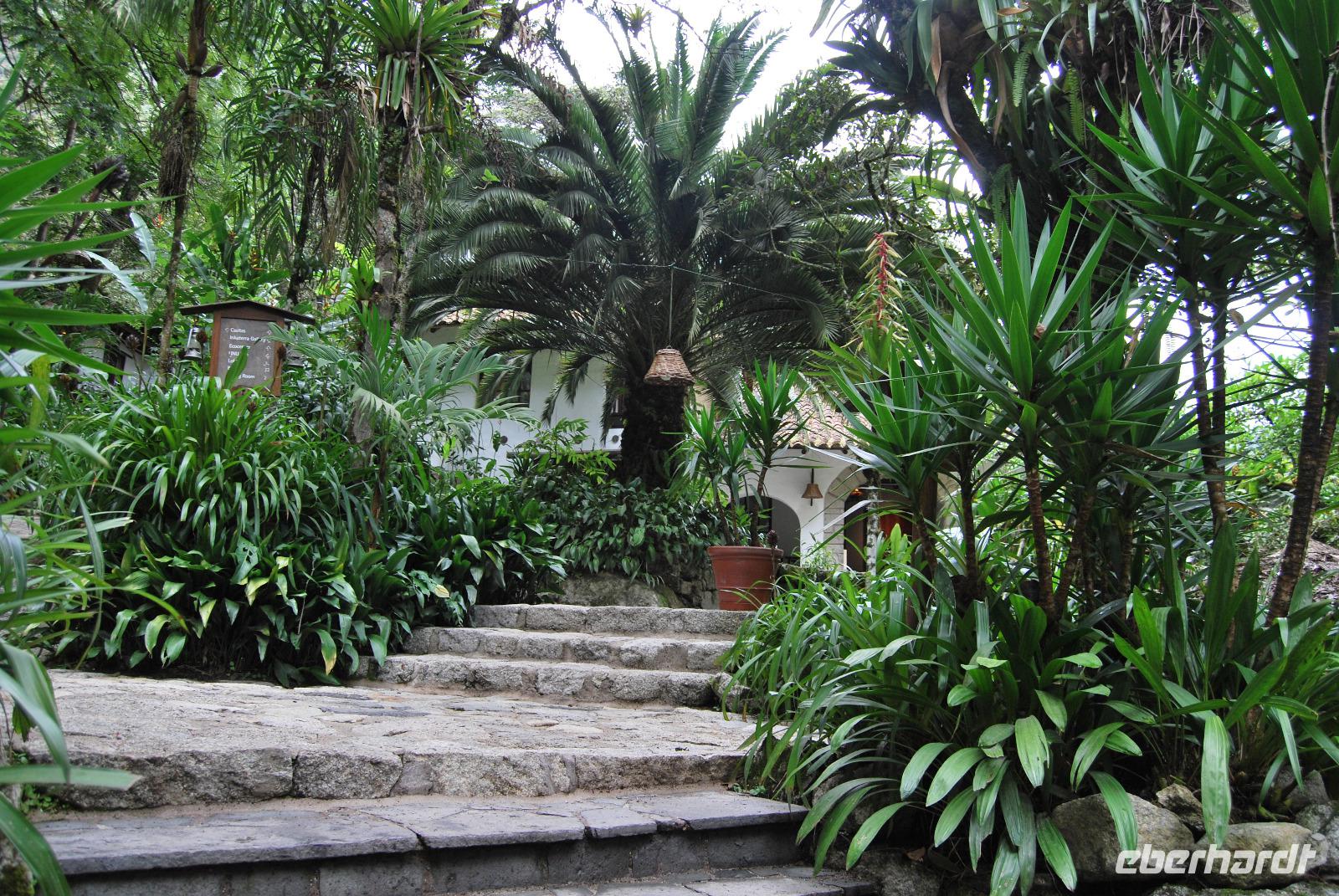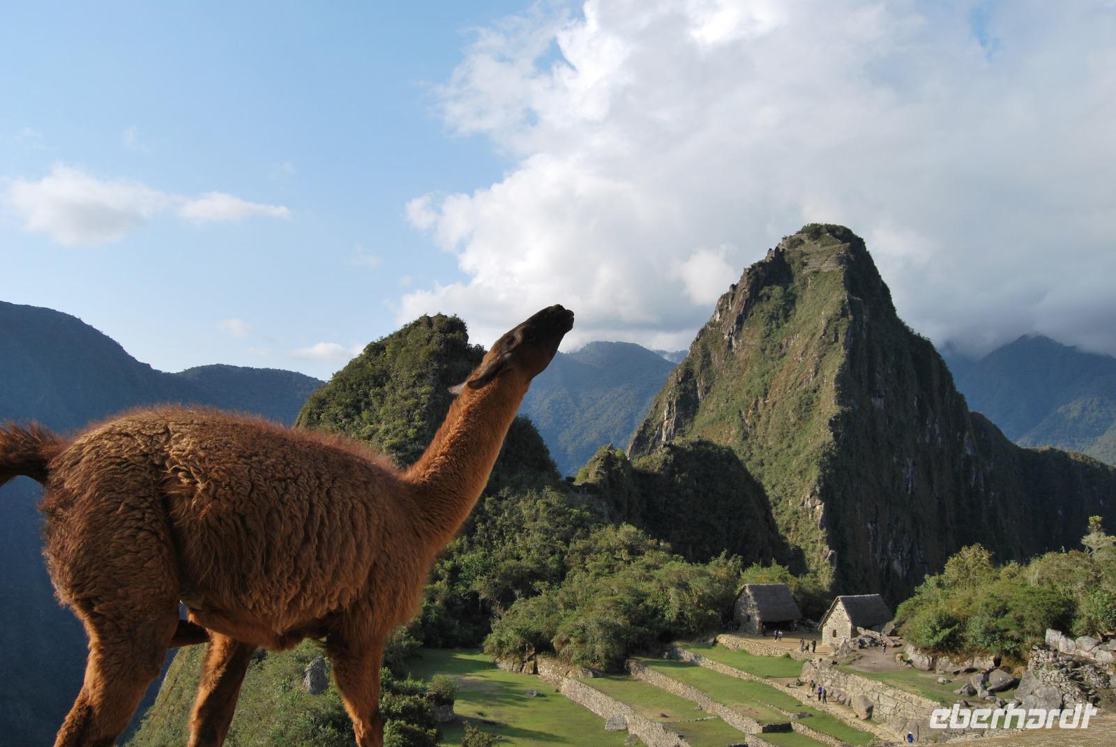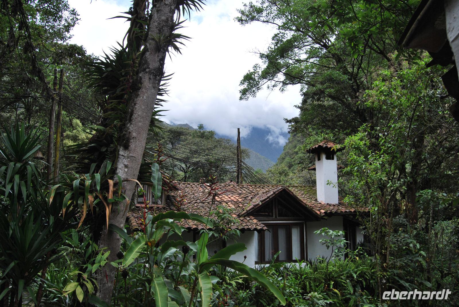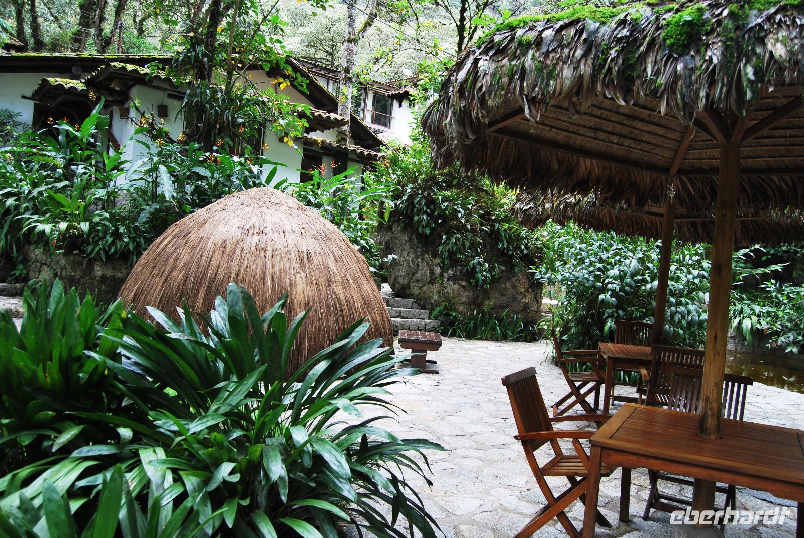 Erwachen auf der Hacienda, die Vögel zwitschern, die Luft ist angenehm frisch, der Himmel ist klar. Es ist schon hell und in der Ferne sieht man die Nebelschwaden flach über die Berge ziehen. Etwa 7 Uhr und wir fahren wieder nach Ollantaytambo. Den Großteil unseres Gepäcks haben wir hier zurückgelassen. Leicht bepackt kamen wir an der Inka Rail an, dem Bahnhof der Ortschaft. Es herrscht reges Treiben am Bahnsteig. Wir drängen uns durch die Menschen zum Abteil B vor. Der Zug fährt ein, die Schaffner blasen in ihre Pfeifen. Man fühlt sich fast achtzig Jahre zurückversetzt. Wir steigen ein. Der Zug rollt - die Freude ist groß! Man hat einen herrlichen Ausblick in dem Panorama-Zug und kann schön beobachten wie sich die Landschaft langsam vom trockenen Hochgebirge zum saftig-grünen Urwald entwickelt. Am Vormittag kommen wir in Aguas Calientes an oder heute auch Machu Picchu Pueblo genannt. Wir ruhen uns noch ein wenig im Hotel Inkaterra aus, was inmitten des Waldes liegt. Ein Garten Eden des Dschungels - mehrere kleine, strohbedeckte Häuschen verstecken sich inmitten des dichten Waldes. Ein verzweigtes Netzwerk aus Wegen führt einen zu den unterschiedlichen Unterkünften. Zentral gelegen der Pool und die Sauna, welche aussieht wie eine riesige Kokosnuss. Nun war es aber Zeit! Der Berg ruft - Machu Picchu! Wir verließen unser Dschungel-Camp und spazierten durch die Inka-Hotel-Stadt zur Busabfahrt. Wir fuhren zum Eingangstor der Inkastätte in zahlreichen Serpentinen etwa 1.300 Höhenmeter hinauf. Dort angekommen kehrten wir noch kurz in das Restaurant ein um uns für den Nachmittag zu kräftigen. Eine große Auswahl an peruanischen Gerichten stand am Buffet bereit.