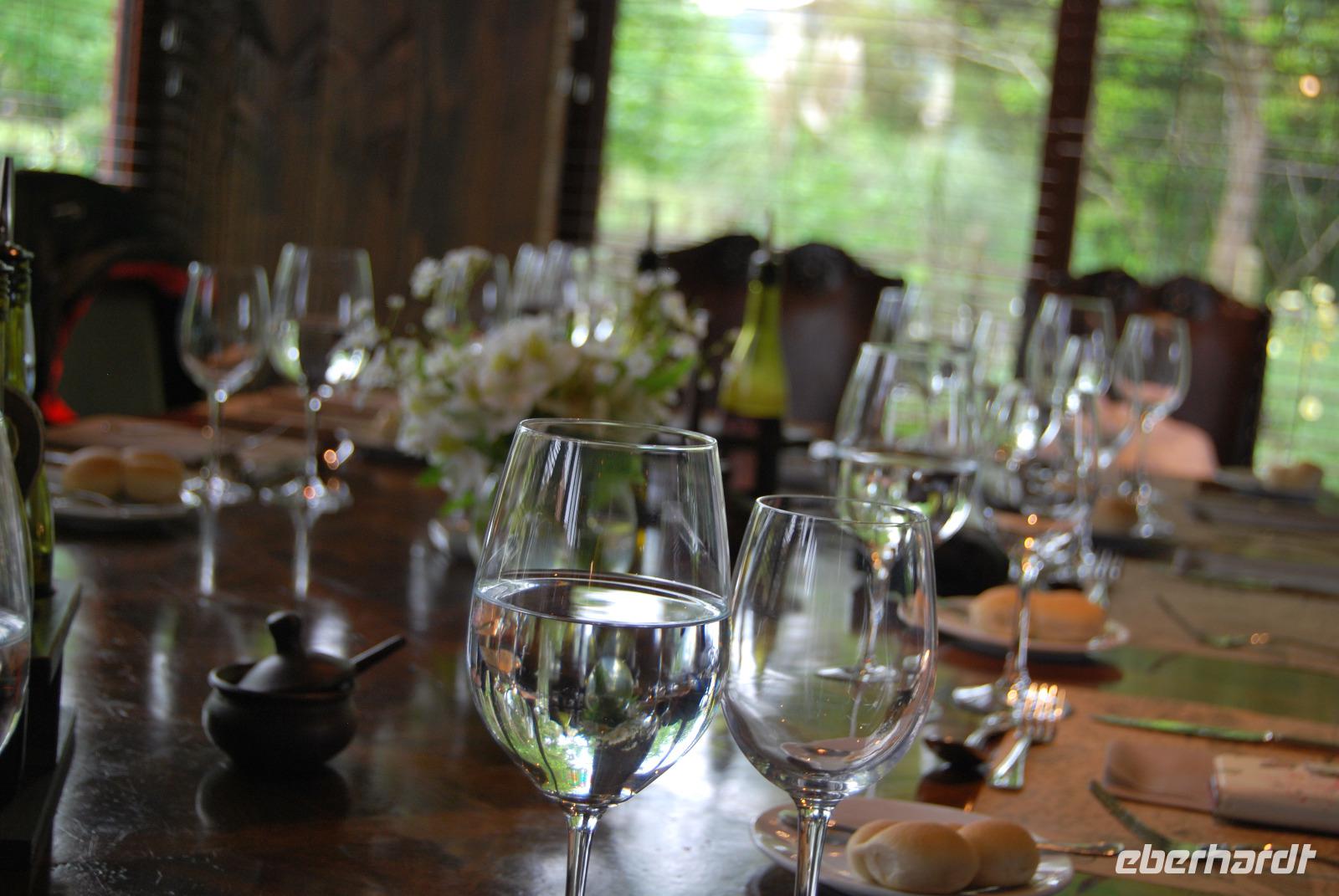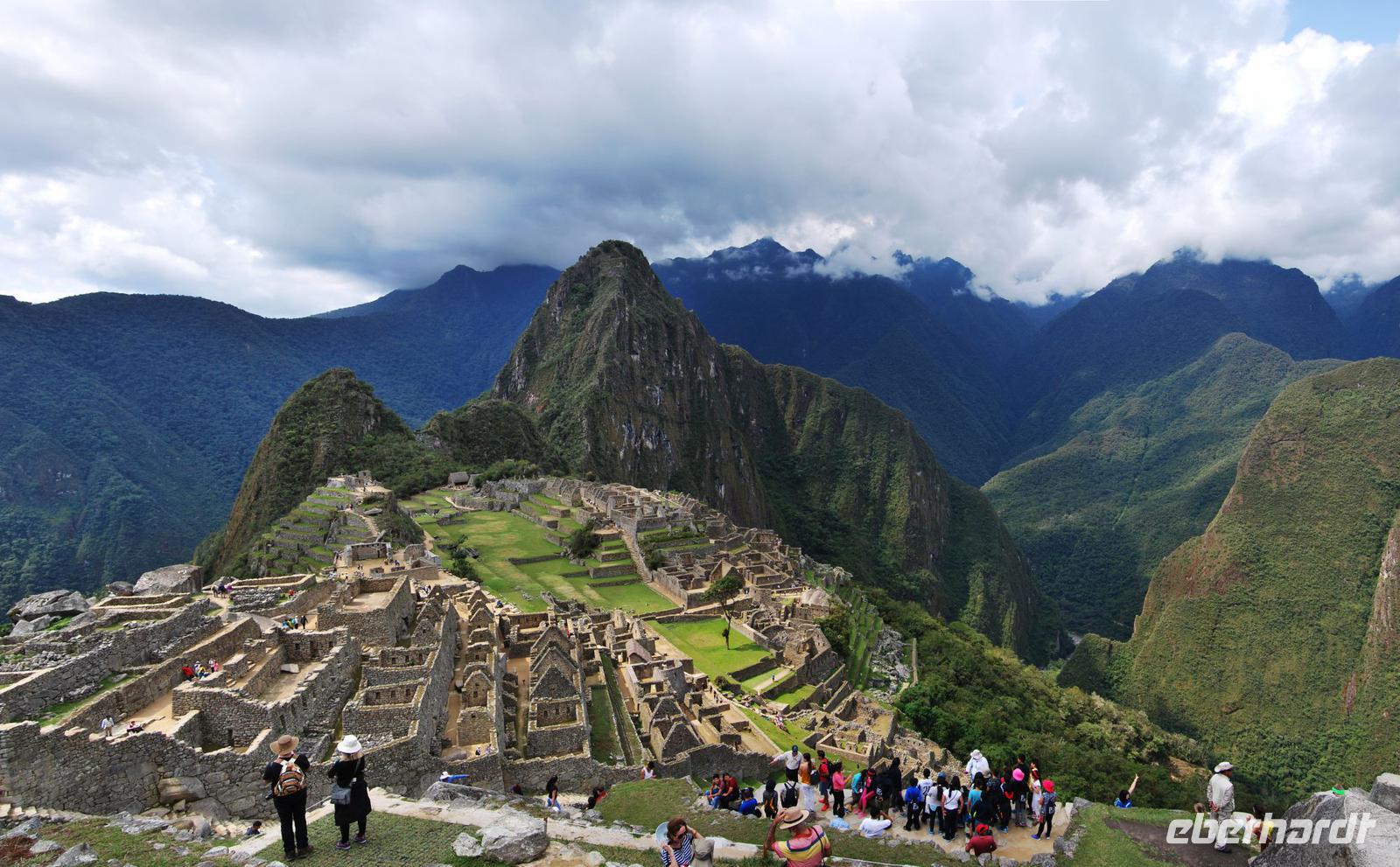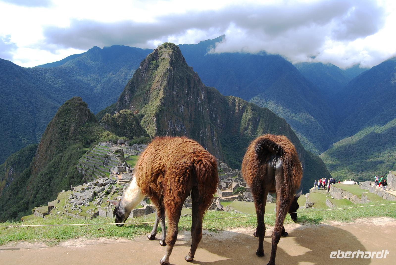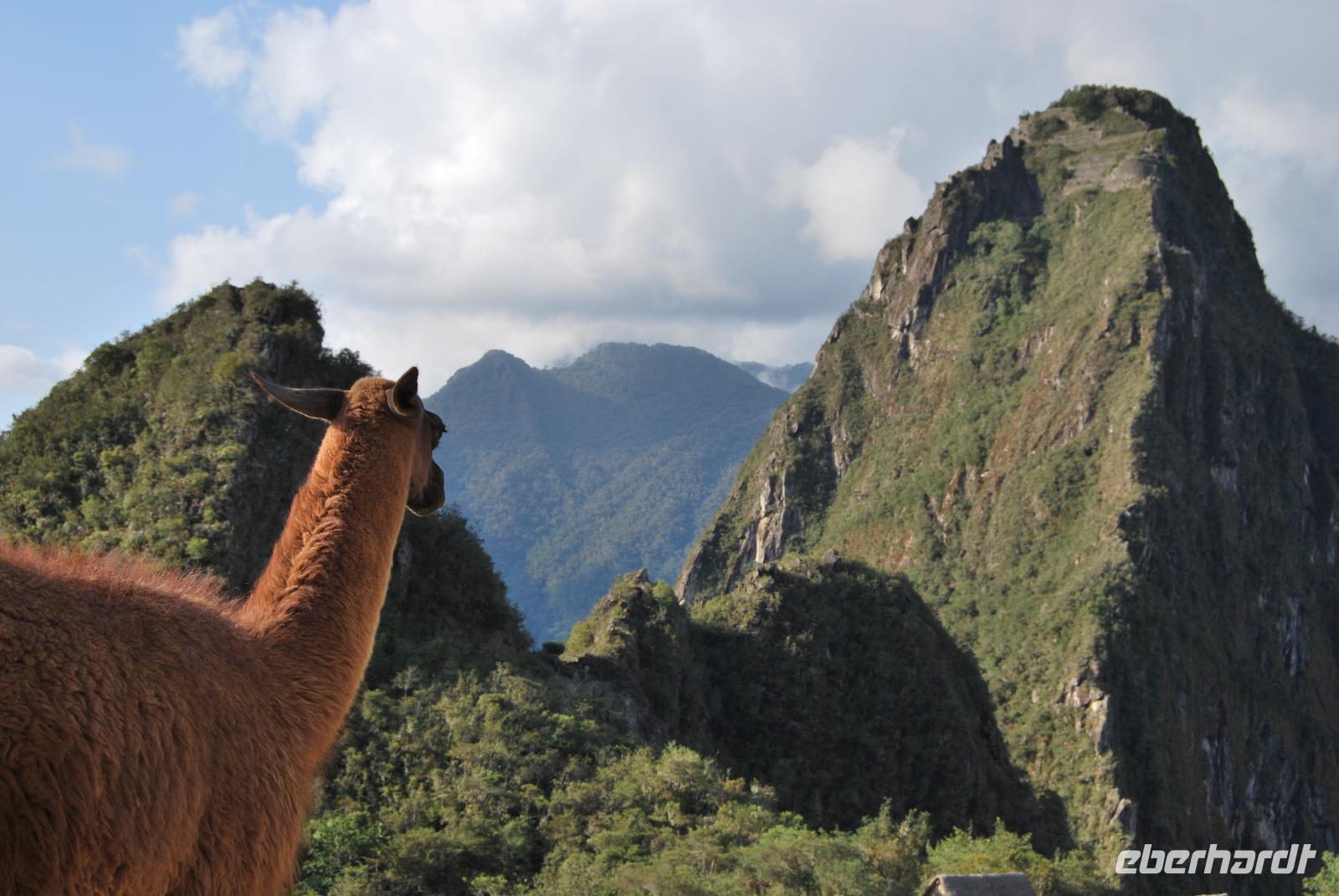 Erwachen auf der Hacienda, die Vögel zwitschern, die Luft ist angenehm frisch, der Himmel ist klar. Es ist schon hell und in der Ferne sieht man die Nebelschwaden flach über die Berge ziehen. Etwa 7 Uhr und wir fahren wieder nach Ollantaytambo. Den Großteil unseres Gepäcks haben wir hier zurückgelassen. Leicht bepackt kamen wir an der Inka Rail an, dem Bahnhof der Ortschaft. Es herrscht reges Treiben am Bahnsteig. Wir drängen uns durch die Menschen zum Abteil B vor. Der Zug fährt ein, die Schaffner blasen in ihre Pfeifen. Man fühlt sich fast achtzig Jahre zurückversetzt. Wir steigen ein. Der Zug rollt - die Freude ist groß! Man hat einen herrlichen Ausblick in dem Panorama-Zug und kann schön beobachten wie sich die Landschaft langsam vom trockenen Hochgebirge zum saftig-grünen Urwald entwickelt. Am Vormittag kommen wir in Aguas Calientes an oder heute auch Machu Picchu Pueblo genannt. Wir ruhen uns noch ein wenig im Hotel Inkaterra aus, was inmitten des Waldes liegt. Ein Garten Eden des Dschungels - mehrere kleine, strohbedeckte Häuschen verstecken sich inmitten des dichten Waldes. Ein verzweigtes Netzwerk aus Wegen führt einen zu den unterschiedlichen Unterkünften. Zentral gelegen der Pool und die Sauna, welche aussieht wie eine riesige Kokosnuss. Nun war es aber Zeit! Der Berg ruft - Machu Picchu! Wir verließen unser Dschungel-Camp und spazierten durch die Inka-Hotel-Stadt zur Busabfahrt. Wir fuhren zum Eingangstor der Inkastätte in zahlreichen Serpentinen etwa 1.300 Höhenmeter hinauf. Dort angekommen kehrten wir noch kurz in das Restaurant ein um uns für den Nachmittag zu kräftigen. Eine große Auswahl an peruanischen Gerichten stand am Buffet bereit.
