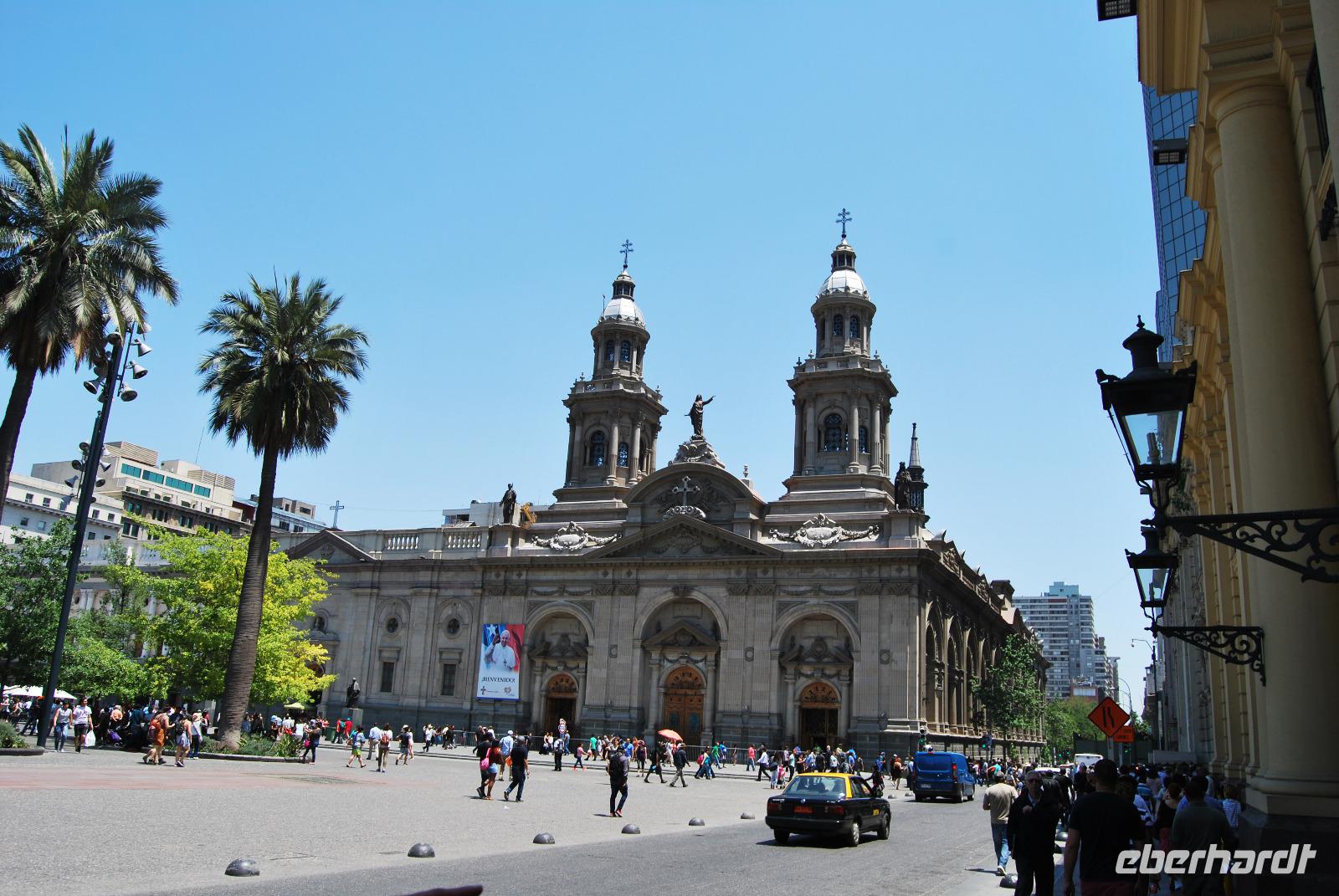 Die Stadtrundfahrt von Santiago de Chile konnte endlich beginnen! Als erstes fuhren wir von unserem zentral gelegenen Hotel in die Nachbarschaft Bellavista. Darauffolgend begaben wir uns auf die Spuren des chilenischen Schriftstellers Pablo Neruda und liefen an seinem Haus La Chascona vorbei. Wir verhundertfachten unser Geld in der Wechselstube und sahen uns den Parque Bicentario im Stadtteil Las Condes an. Das wichtige Naherholungsgebiet umfasst 27 Hektar Fläche und beherbergt 4.000 Bäume wovon mehr als 1.300 einheimische Arten sind. Aus der Ferne sahen wir uns das größte Gebäude Südamerikas an - den Sky Costanera oder auch Gran Torre Santiago genannten, mit seinen 300 Metern Höhe. Dann stand noch die Plaza de Armas von Santiago de Chile auf unserem Programm sowie das Mittagessen im El Galeon Mercado Central. Der zentrale Markt aus dem 19. Jahrhundert hat ein gusseisernes Dach und Unterkonstruktion, die ein authentisches Flair vermittelt. Darunter werden die unterschiedlichsten Waren verkauft. Das größte Angebot besteht aber aus dem frischen Fisch aus dem Südpazifik.