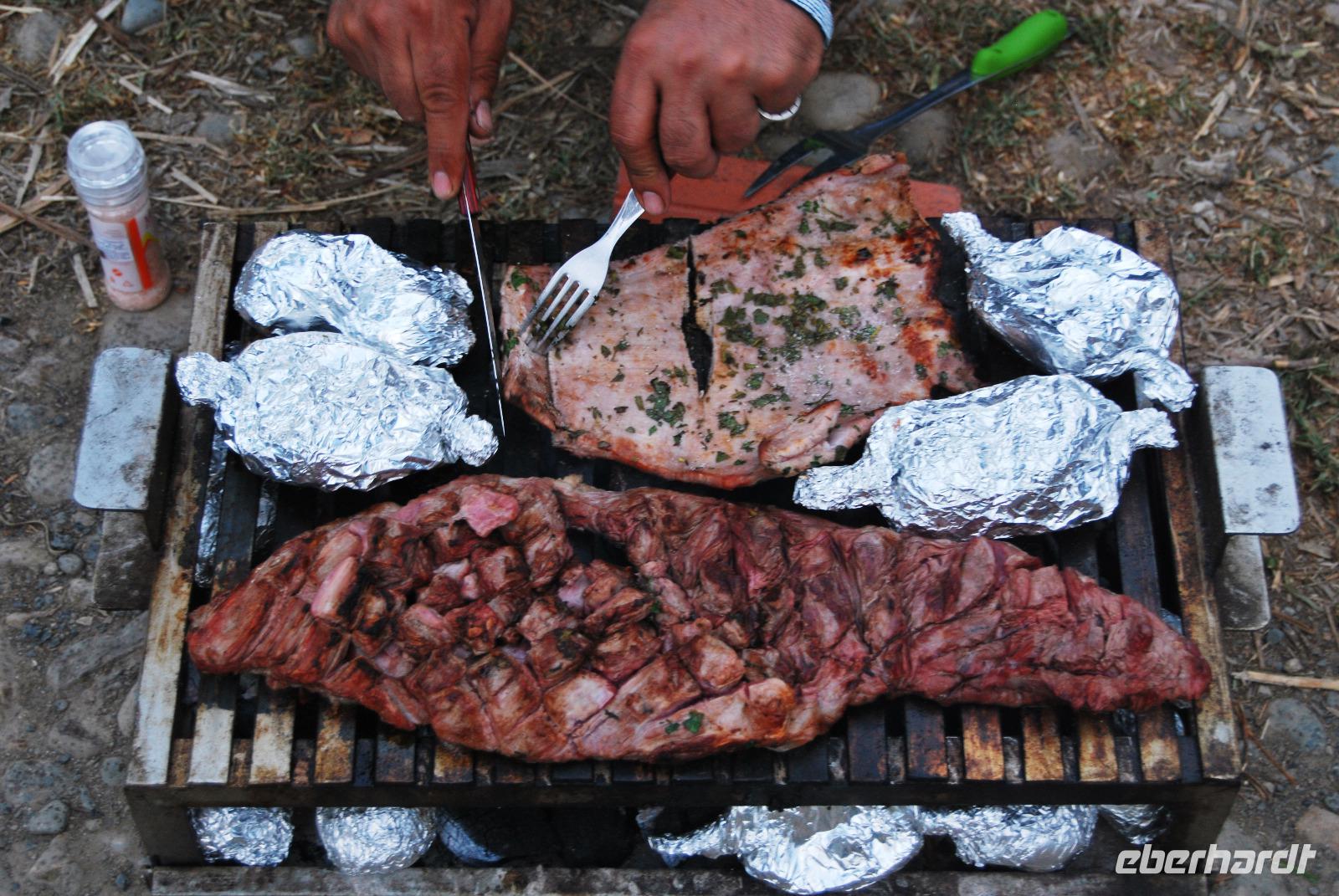 Gegen Abend kamen die meisten von uns noch einmal zusammen. Ich hatte jede Menge Fleisch - typisch bolivianisch - und etwas Gemüse eingekauft. Rodrigo besorgte einen Grill und auf dem Weg in den grüneren Außenbezirk der Stadt kauften wir noch ein paar Getränke. Gut eine Stunde außerhalb der Stadt, nahe einem Fluss, mitten in Feldern hatten wir unser Plätzchen gefunden. Leider brauchte der Grill etwas Zeit um die richtige Hitze zu entwickeln - es wurde dunkel - aber wir haben die riesigen Steaks und das Hühnchen gar bekommen. Gewürzt mit jeder Menge Salz, Zitrone und ein wenig Petersilie, eben klassisch bolivianisch, hat es doch jedem geschmeckt.