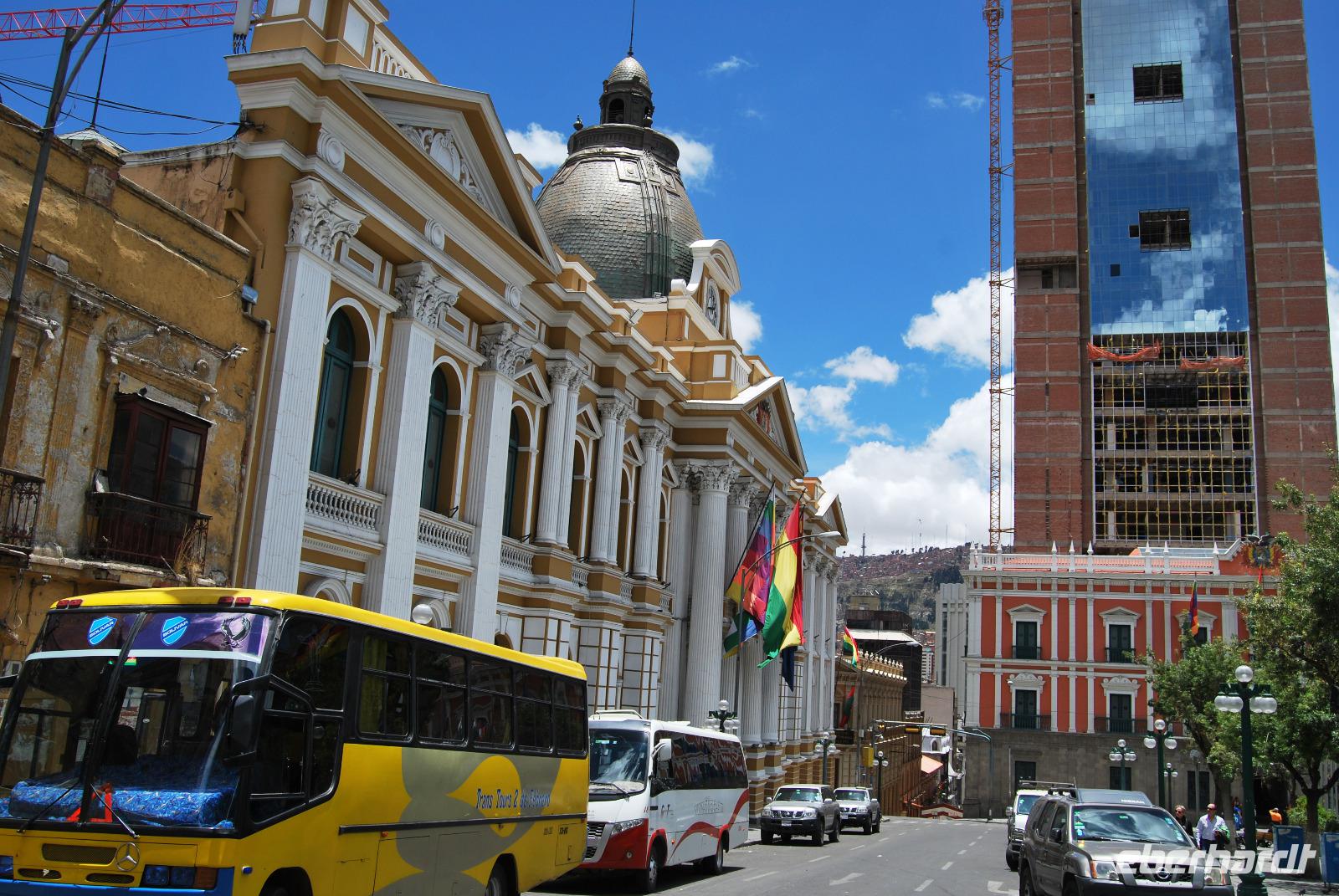 Unsere City-Tour ging aber weiter: vom spanischen Viertel über das älteste Staatstheater Südamerikas bis auf den Hauptplatz im Zentrum von La Paz - wie sollte er auch anders heißen - Plaza de Armas, wo uns Rodrigo etwas über sein Land und die Geschichte erklärte. Zum Ende unserer Stadtführung gingen wir über den Hexenberg, wo es einige Kräuter und Dinge für den Schamanismus zu erstehen gibt sowie zahlreiche Souvenirs für den Touristen. An der Basílica de San Francisco wurden wir eingesammelt und zum Hotel gebracht. Rodrigo organisierte für uns schnell noch ein paar Salteñas, die uns ins Hotel geliefert wurden - mit Fleisch oder Käse gefüllte Teigtaschen, frittiert oder gebacken.
