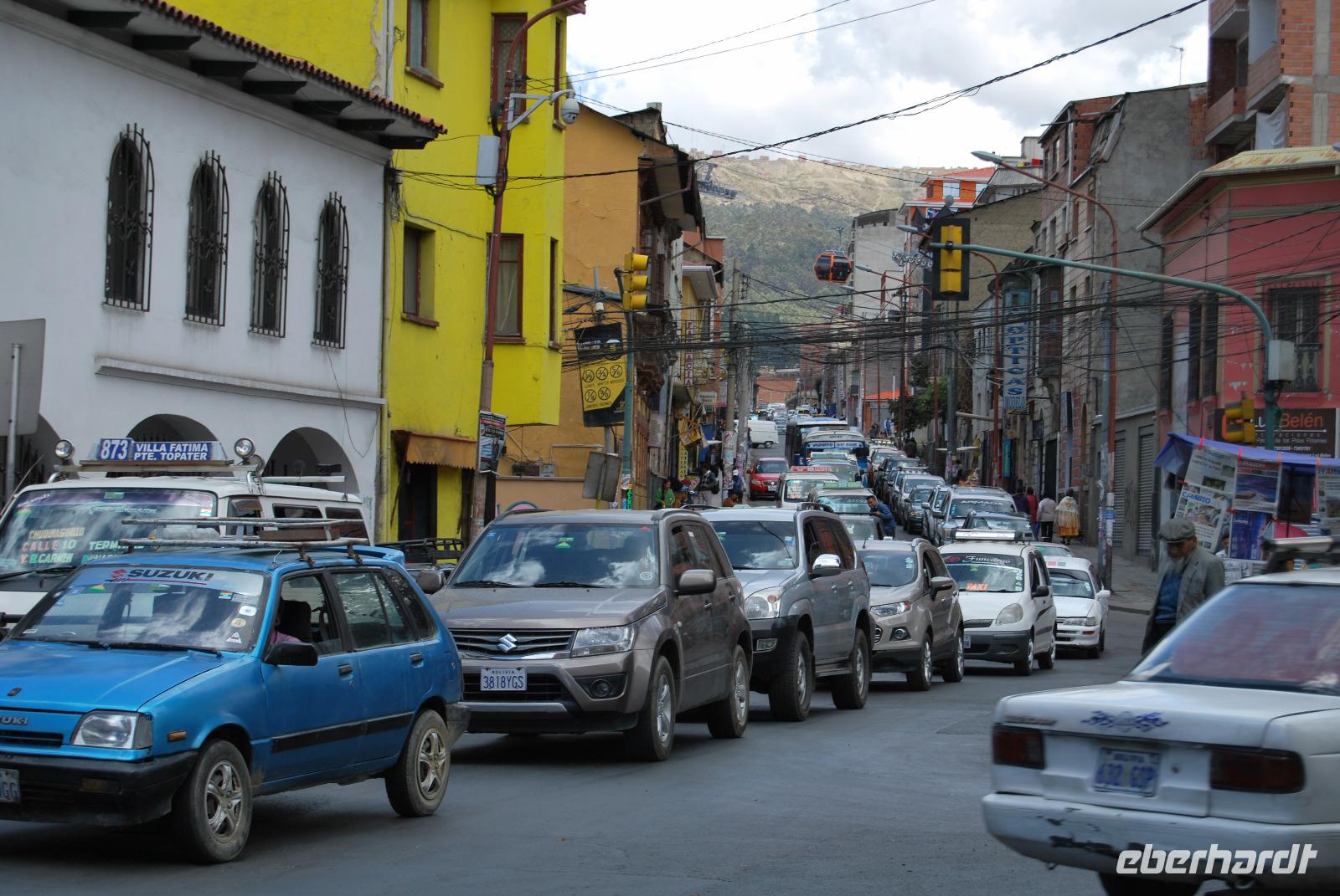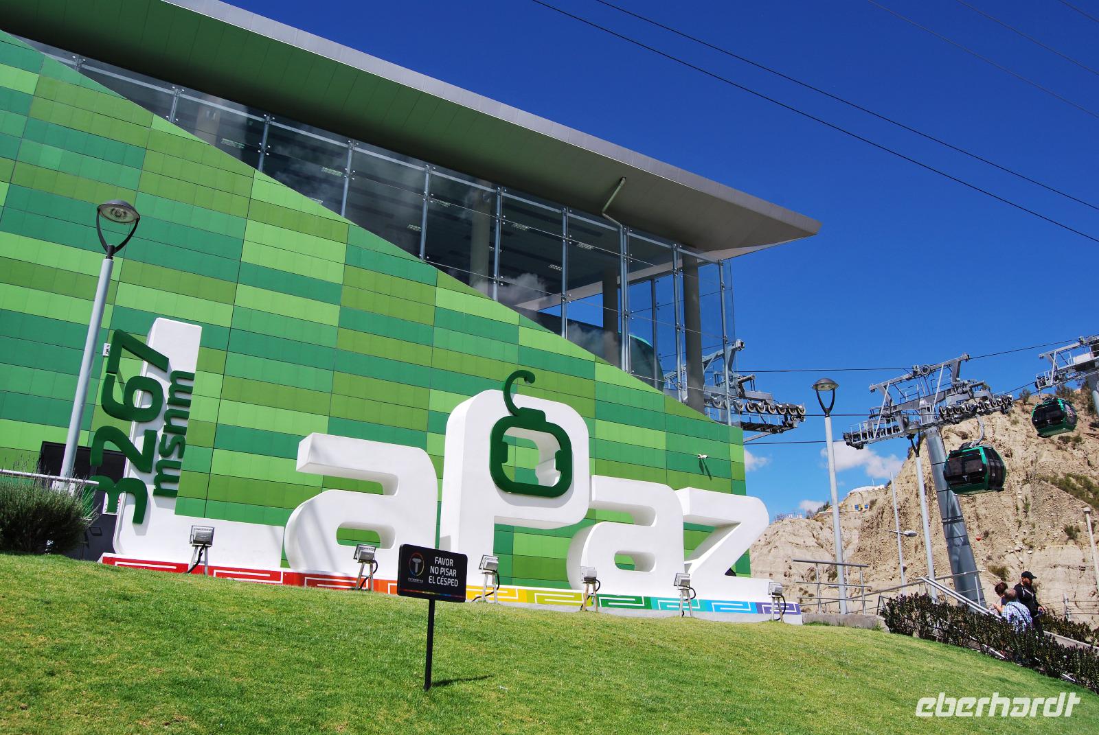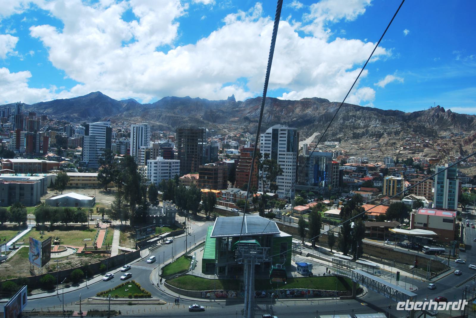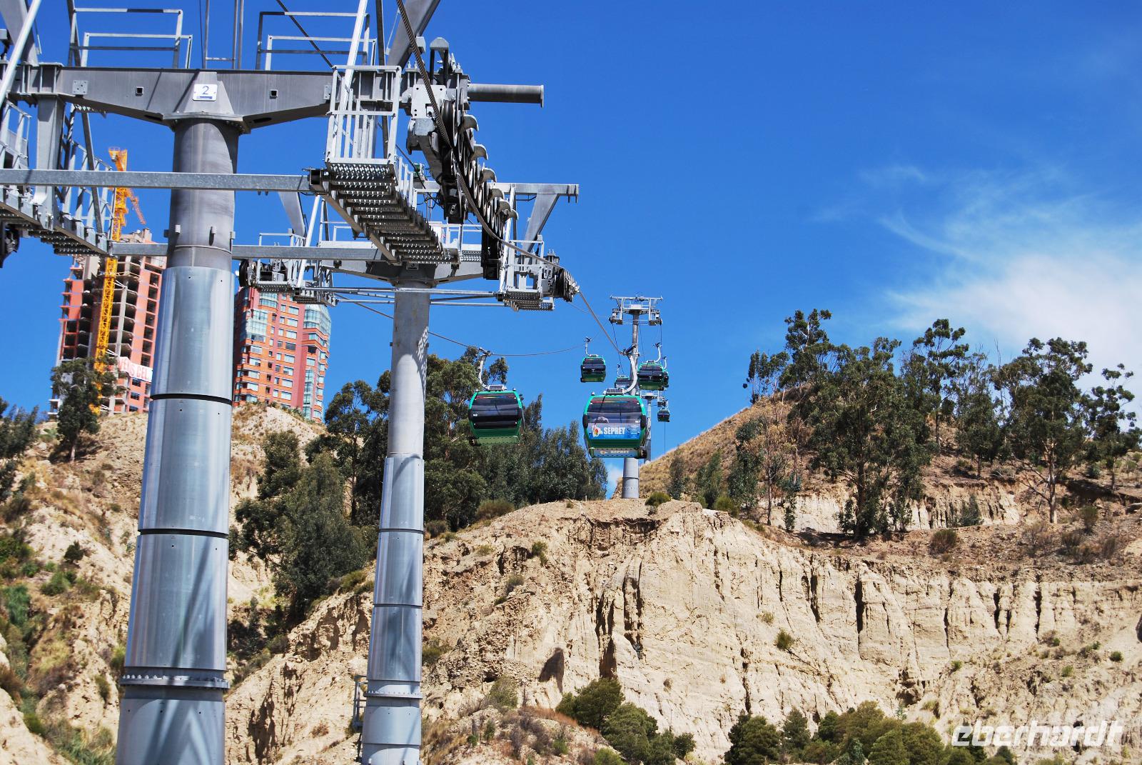 Die Straßen in La Paz, allgemein in Südamerika, sind nicht immer die Besten. Es kann schon sehr anstrengend sein, wenn man ständig im Bus hin und her geschüttelt wird. Der chaotische Verkehr ist dabei nicht förderlich. So entschlossen wir uns für den bequemeren Transportweg: eine Doppelmayr Seilbahn! Nun fragt man sich, wie kommt eine österreichische Seilbahn hier nach Bolivien in das Andenhochland? Ganz einfach! La Paz befindet sich auf einer Höhe von 3.200 bis 4.100 Metern über dem Meeresspiegel. Für eine U-Bahn wäre es nahezu unmöglich die Höhenunterschiede zu überwinden, außerdem ist der Boden nicht dafür geeignet - Mondlandschaft. So gibt es also keine bessere Lösung als eine Seilbahn. Und da der umstrittene Präsident Evo Morales ausnahmsweise spendabel ist, hat er seiner Bevölkerung das Beste vom Besten geschenkt, und die Österreicher beauftragt die Stadt mit Seilbahnen auszustatten. Ich kann mich noch erinnern, als ich vor zwei Jahren dort war, gab es zwei Linien, die unteranderem La Paz mit der angrenzenden Stadt El Alto, wo auch der internationale Flughafen ist, verbunden hat. Inzwischen sind es schon sagenhafte elf Linien, die die bergige Stadt verbindet. Hochmodern und für gerade einmal drei Bolivianos kommt man von A nach B.
