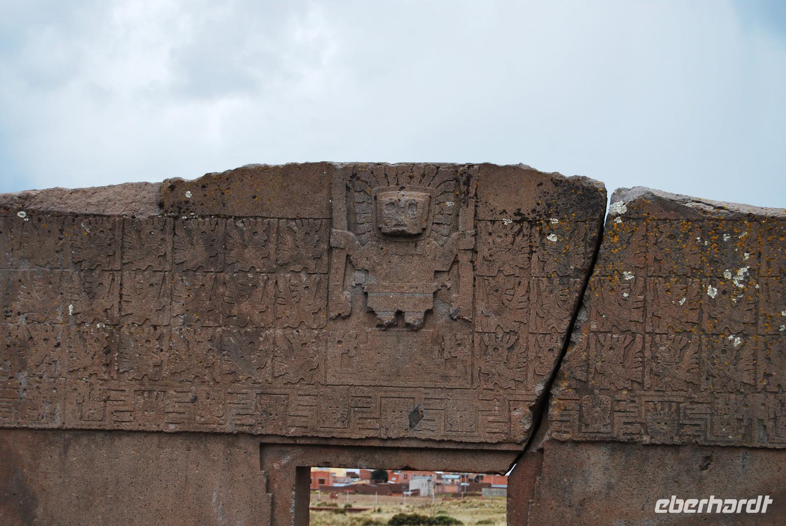 Dann verließen wir aber den Ort Huatajata und fuhren südlich nach Laja und gelangten so weiter nach Tiwanaku. Die Ruinenstätte Tiwanaku ist eine sehr bedeutende Tempelanlage der Inkas und liegt nahe am Titicaca-See. Rodrigo zeigte uns die Anlage und die beiden Museen. Leider zerstörten die Spanier und die Witterung die Anlage sehr. Auch die naheliegende Kirche des heutigen Dorfes wurde mit den Steinen der Tempelanlage errichtet. Aber trotzdem kann man die drei Bereiche gut erkennen. Wie in der gesamten Welt der Inkas spielt die Zahl Drei eine wichtige Rolle. So auch hier in Tiwanaku. Drei Tempel, einer befindet sich oben, wie eine Pyramide geht es in drei großen Sprüngen nach oben, jede Stufe ist mit sieben Treppen ausgestattet. Als Grundform der Pyramide ist das Andenkreuz, Chakana, zu erkennen. Auf dem Tempel der mittleren Ebene sind mehrere Monolithen und ein Sonnentor zu finden. Der dritte Tempel ist in den Boden eingelassen und hatte ebenfalls einen riesigen Monolithen in der Mitte. Am Rand zahlreiche Skulpturen von Gesichtern. - Drei Tempel, mit drei Ebenen, genauso wie beim Andenkreuz Chakana. Die Inkas hatten zudem drei tierische Gottheiten: den Condor, den Puma und die Schlange. Der Condor symbolisierte den Himmel, die Zukunft und Weisheit - der erhabene Tempel. Der Puma ist in der Gegenwart - der ebenerdige Tempel. Und die Schlange befindet sich in der Unterwelt, die Vergangenheit ist aber auch ein Symbol der Fruchtbarkeit - der untere Tempel. Diese drei Ebenen findet man auch im Chakana wieder. In der Mitte hat es einen Punkt - Hinweis auf den Nabel der Welt, das Zentrum der Inkas - Cusco!