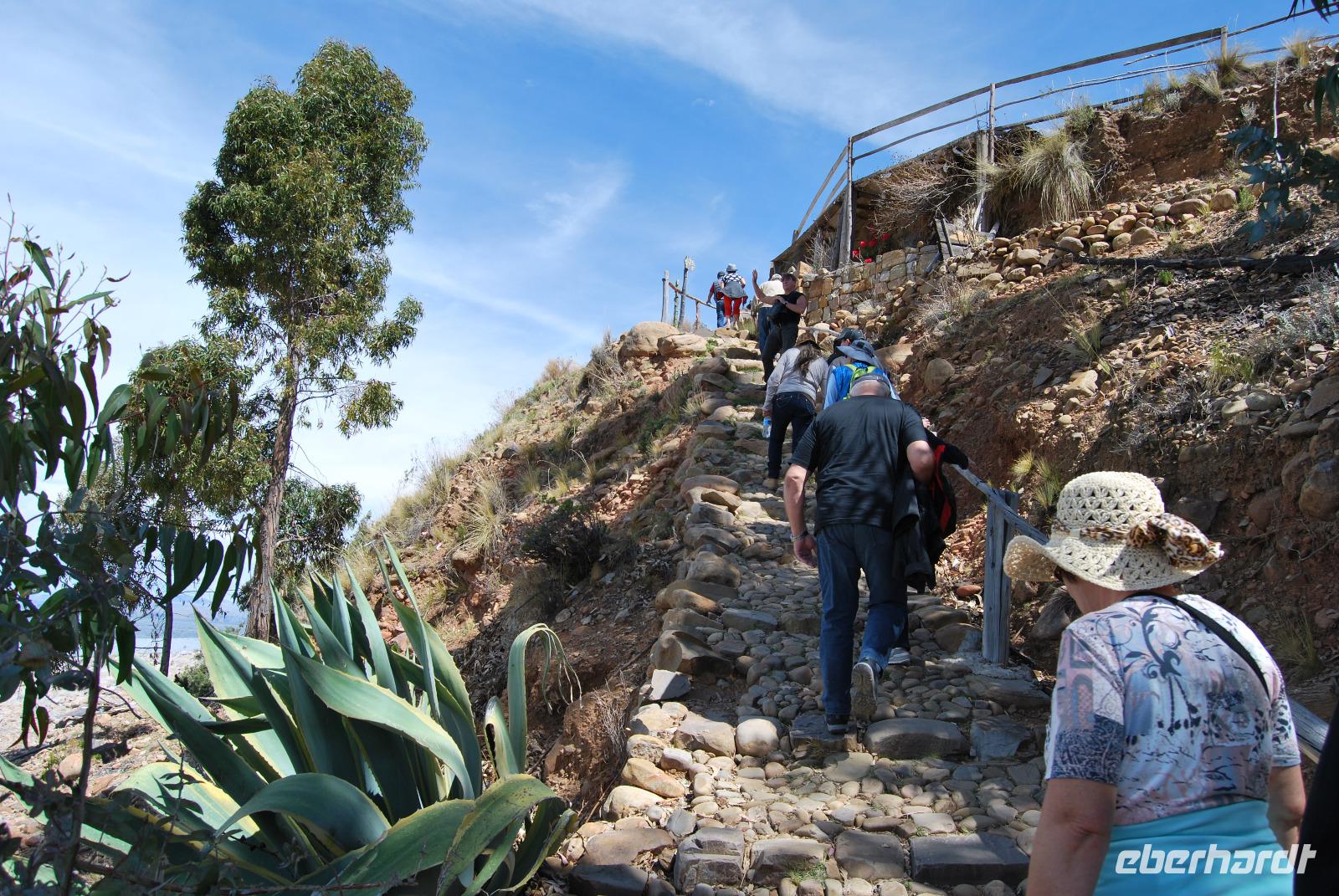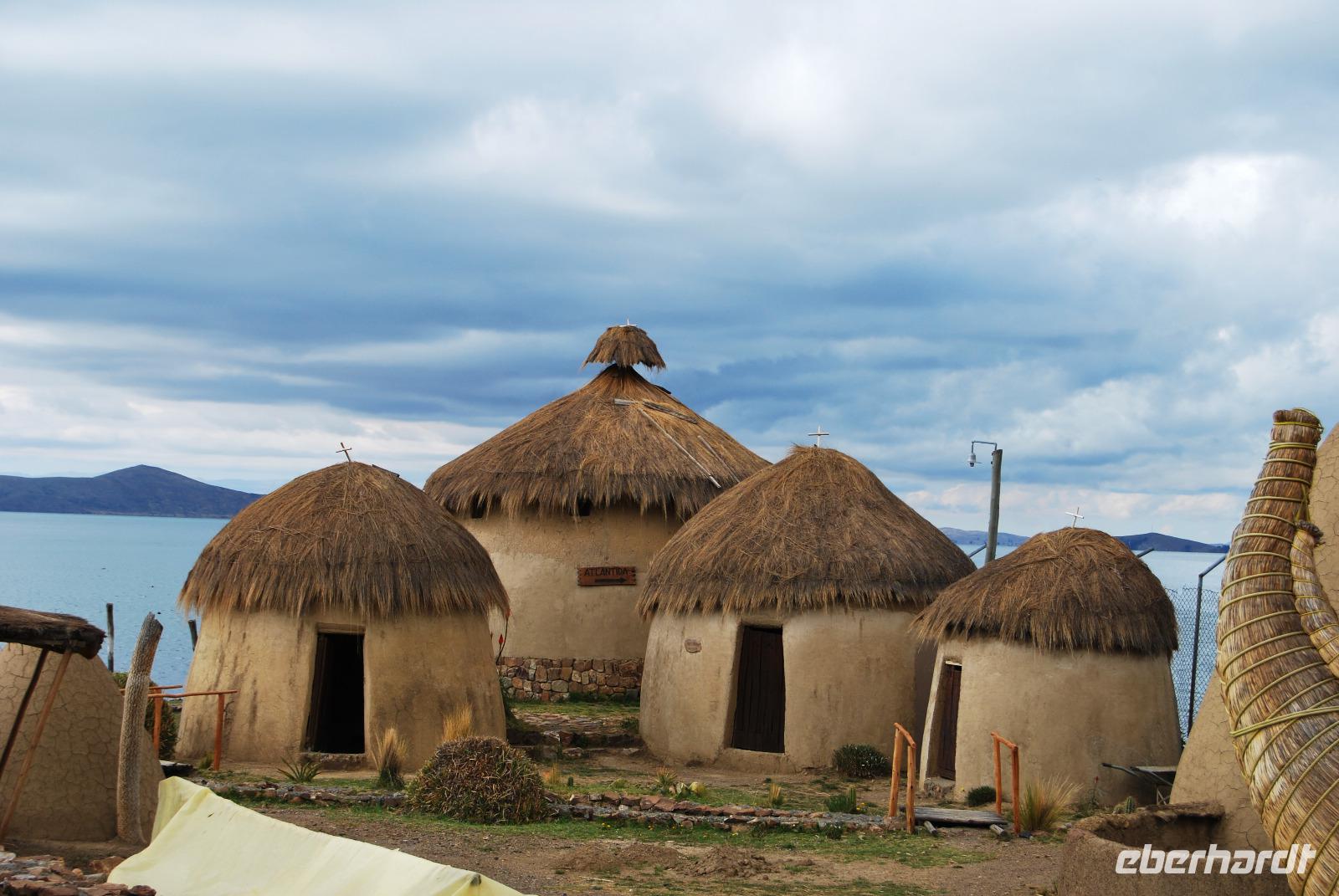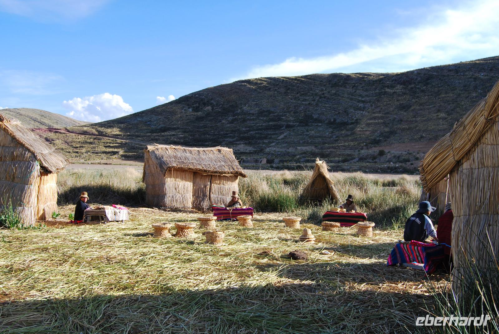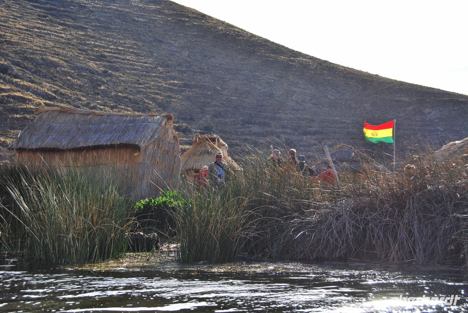 Von der Sonneninsel, die ihren Namen wegen des Inka-Tempels trägt, der sich darauf befindet, fahren wir weiter zur Mondinsel. Dort hat sich vor einiger Zeit mal ein Gefängnis befunden, von dem eine Flucht unmöglich war. Kein Material zum Bau eines Bootes, das Wasser viel zu kalt um es zu durchschwimmen. Auch die Inkas benutzen diese Insel als eine Art Gefängnis, doch war hier der Name Kloster zutreffender. Denn hier lebten einst die Jungfrauen, die einmal Großes vollbringen sollten. Entweder als Gemahlin eines Inka-Königs oder auch als wertvolle Opfergabe an die Götter. Wir verließen die Mondinsel wieder und fuhren mit dem Boot in süd-westlicher Richtung und passierten dabei die Straße von Tiquina. Von dort nahmen wir Kurs auf Huatajata, wo sich unser Hotel für die nächste Nacht befand. Zuvor hielten wir aber noch auf dem Wasser und wechselten das Boot. Denn um zu der schwimmenden Schilfinsel zu kommen, durfte das Boot nur geringen Seegang haben. Wir sahen uns die Schilfinsel und Behausungen der Schilf-Indianer, oder auch Uros genannt, an.