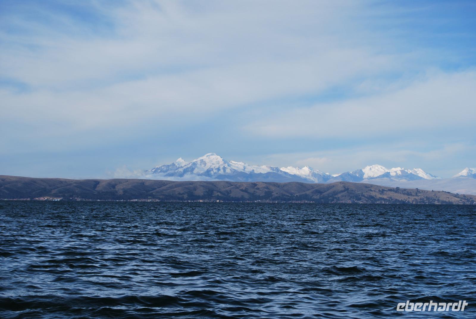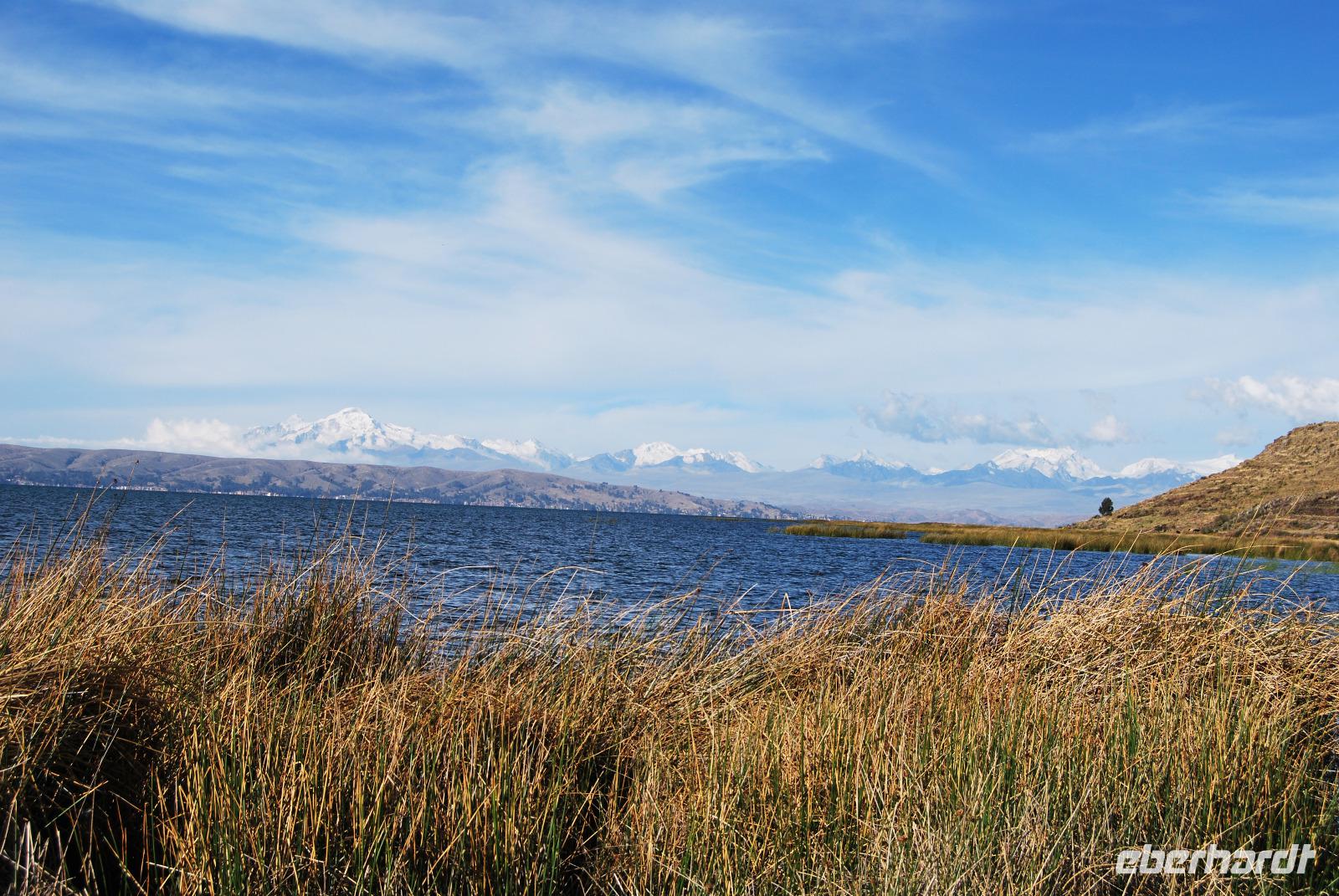 Der Himmel ist sehr klar. In der Ferne sieht man ein paar flauschige Wolken über den teilweise schneebedeckten Bergen. Das Wasser des Titicaca-Sees ist tiefblau, aber sehr rein. Problemlos kann man mehrere Meter auf den steinigen Grund sehen. Die Sonne scheint hell, da empfiehlt es sich Sonnencreme aufzutragen, auch wenn es nicht unbedingt warm ist, denn wir sind hier immer noch im Hochland.