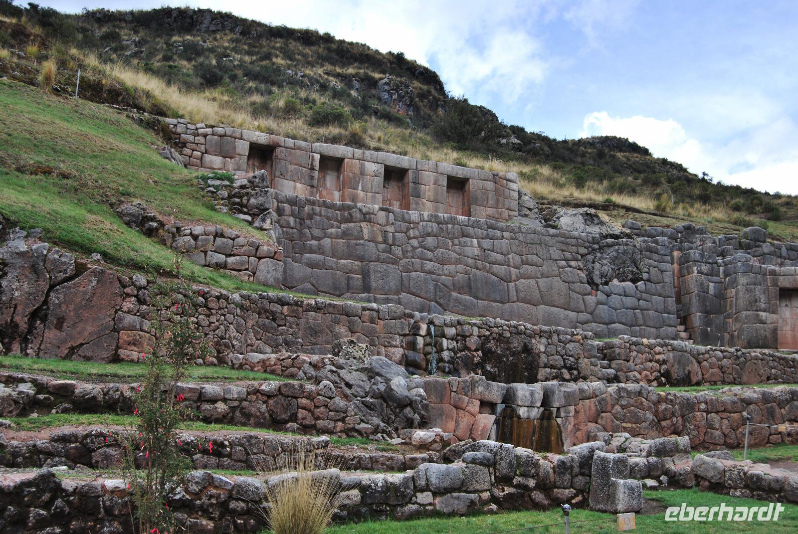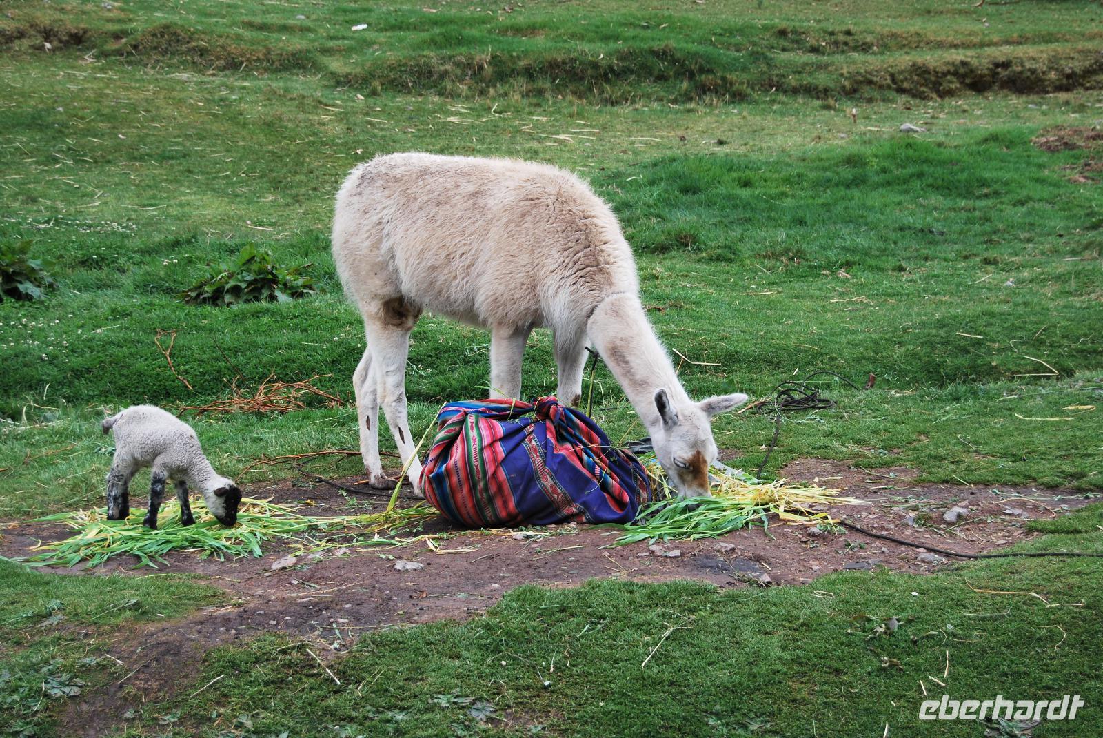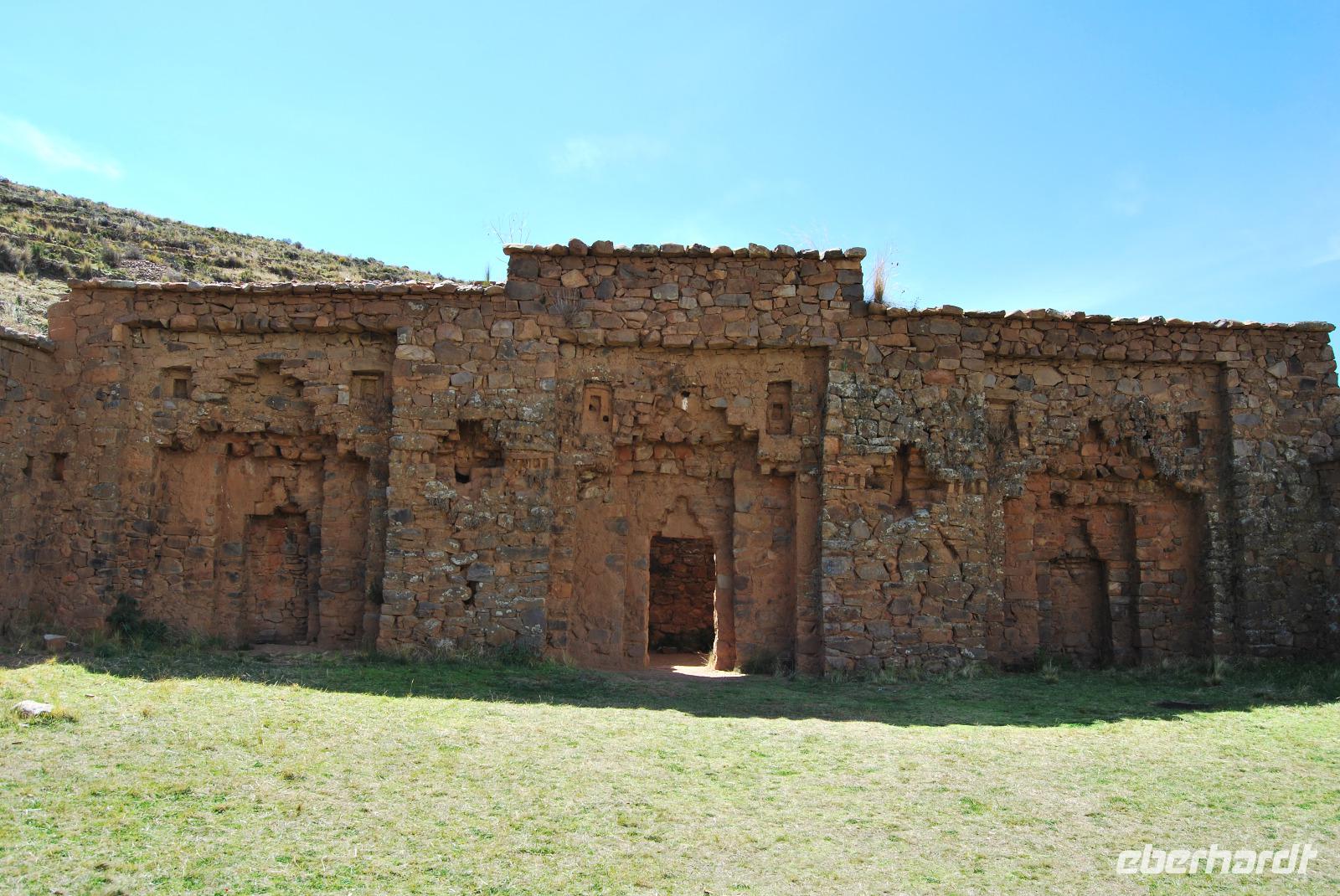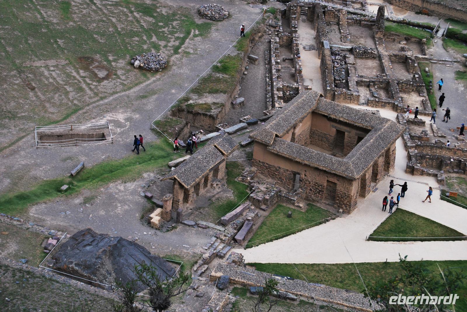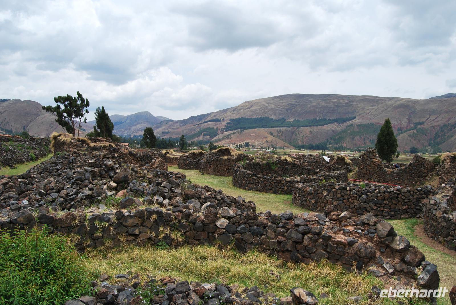 Wir fuhren weiter über die Hochebene, durch das Dorf Tinta hindurch und hielten an dem ehemaligen Inka-Lagerzentrum von Raqchi. Heute stehen nur Ruinen da, aber die Erhaltung, Restauration und Ausgrabungen sind im vollen Gange. Heute glaubt man dies sei einst ein großes Versorgungszentrum für die Ausweitung des Inka-Reiches in Richtung Süden gewesen. Man findet noch die Überreste einer riesigen Halle, die wohl als Versammlungszentrum diente. Des Weiteren ein paar Unterkünfte und Hunderte von runden Lagerhäusern die miteinander verbunden waren. Außerdem eine Mauer um die gesamte Anlage. Man geht davon aus, dass hier zahlreiche Inka-Krieger versorgt werden konnten, dies als Warenumschlagplatz diente oder auch als Versicherung für schwere Zeiten. Denn hier konnte jede Menge an Lebensmitteln eingelagert werden - und die Indianer waren wahre Meister in der Konservierung ihrer Nahrung. Die Versorgung von Raqchi genügte sicher für etliche Tausend Menschen. Und das hier, auf der Hochebene, wo Hunderte von Kilometern nur ein paar hundert Menschen leben.