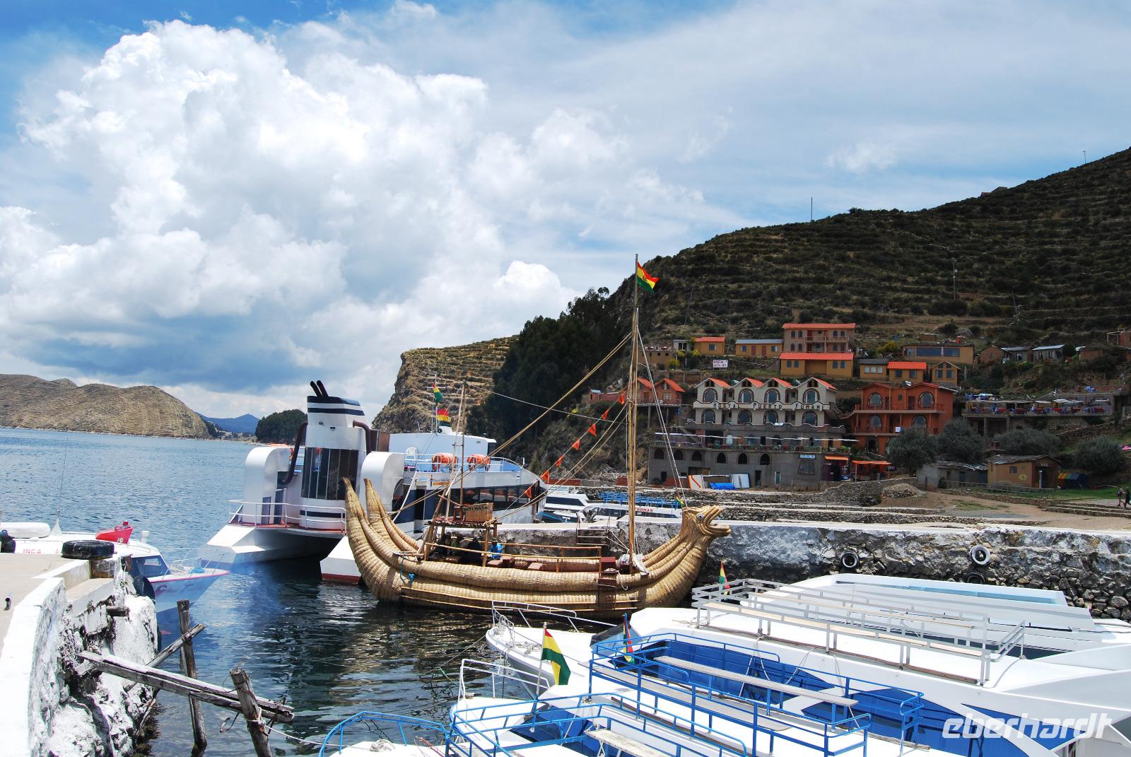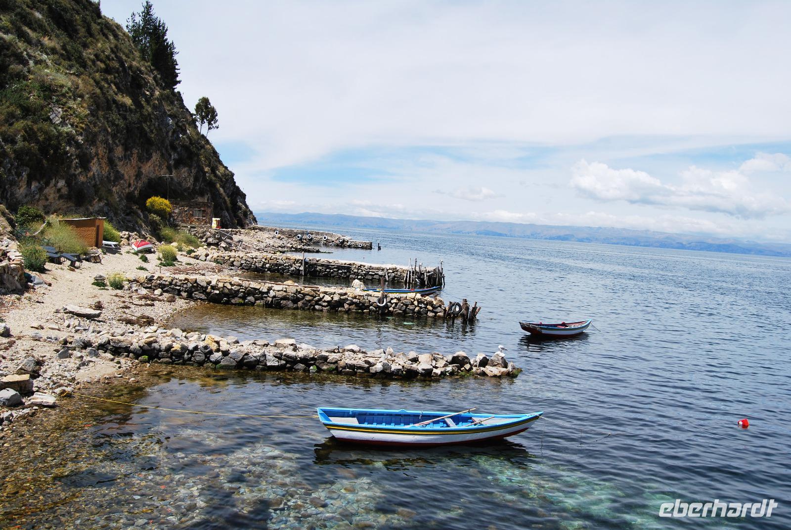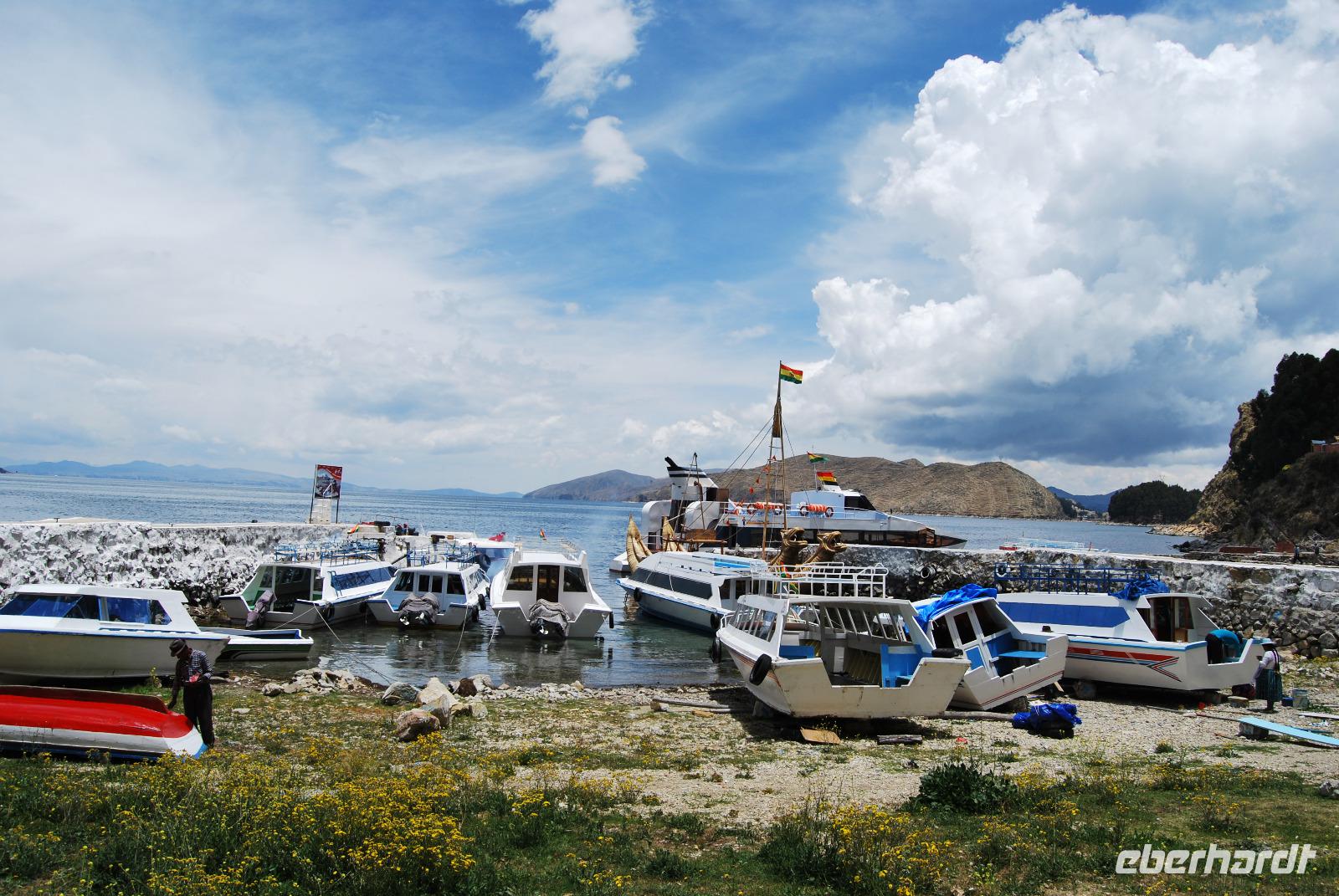 Nach der Besichtigung der Basilika fuhren wir die Straßen zum Hafen hinunter. Am Titicaca-See angekommen ging es zum Marine-Stützpunkt. Denn jede gute Armee hat ja auch eine Marine. Wenn aber das Land keinen Zugang zum Meer besitzt, da sie es in einem blutigen Krieg gegen Chile verloren hatten, muss sich die Marine eben an einem See in 3.812 Meter Höhe über dem Meeresspiegel stationieren. Wie auch immer, an dieser Stelle ankerte unser Boot. Denn nun wechselten wir unser Transportmittel und fuhren mit einem kleinen Boot zur Sonneninsel.