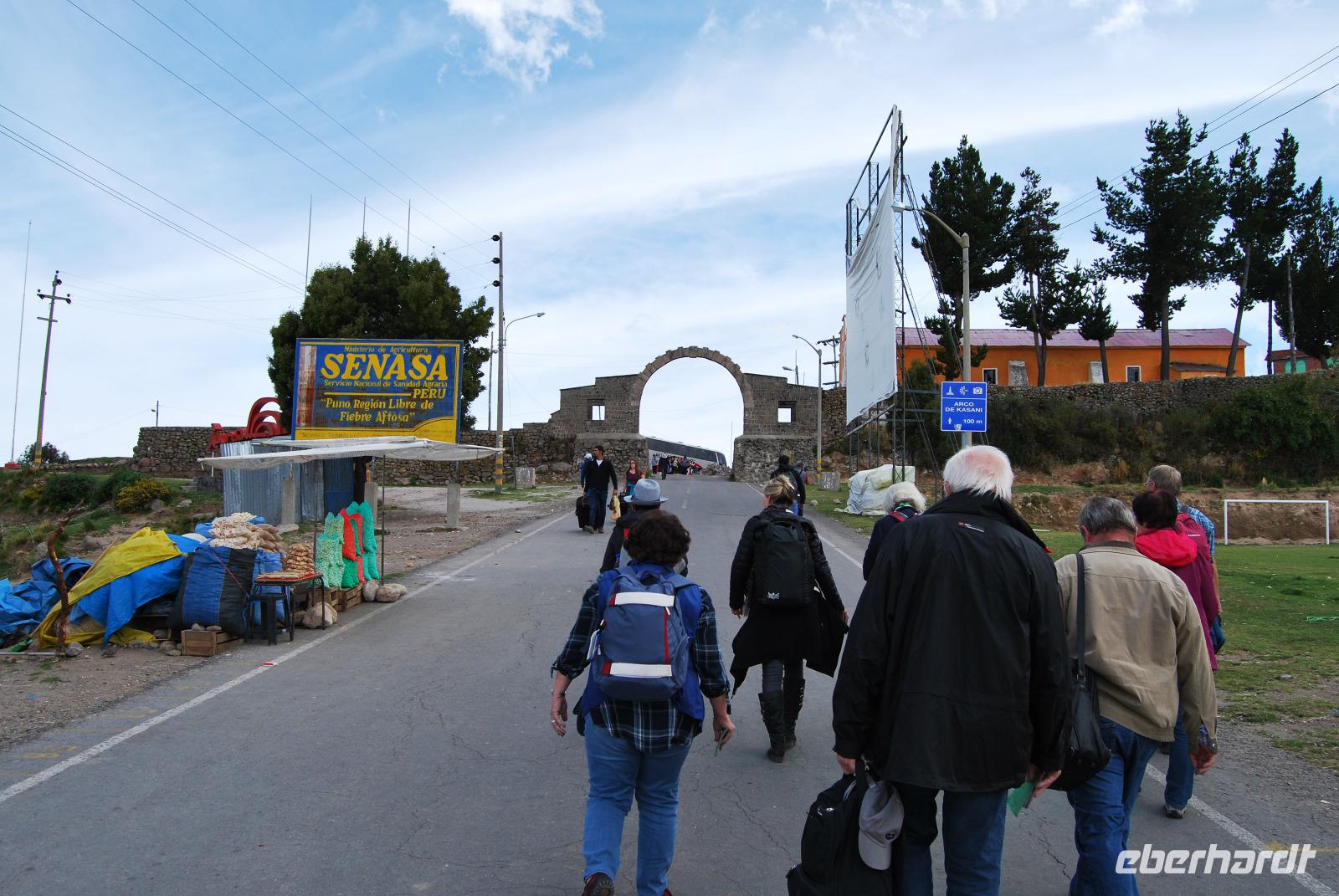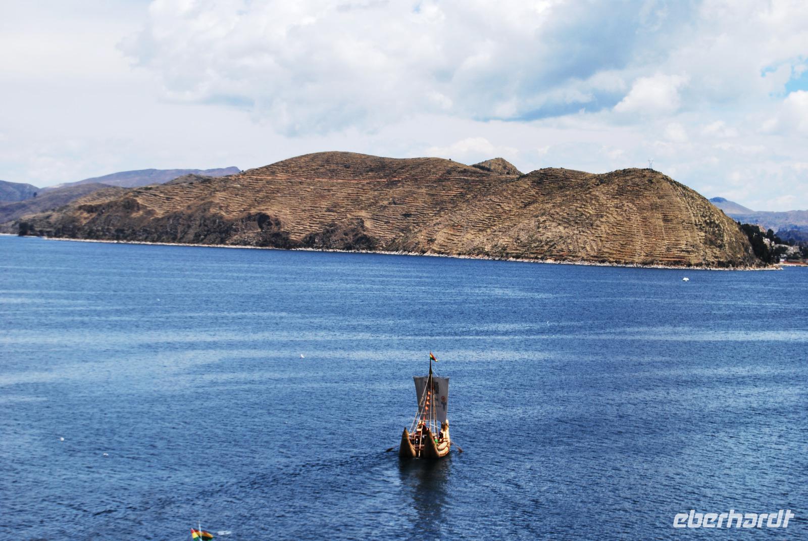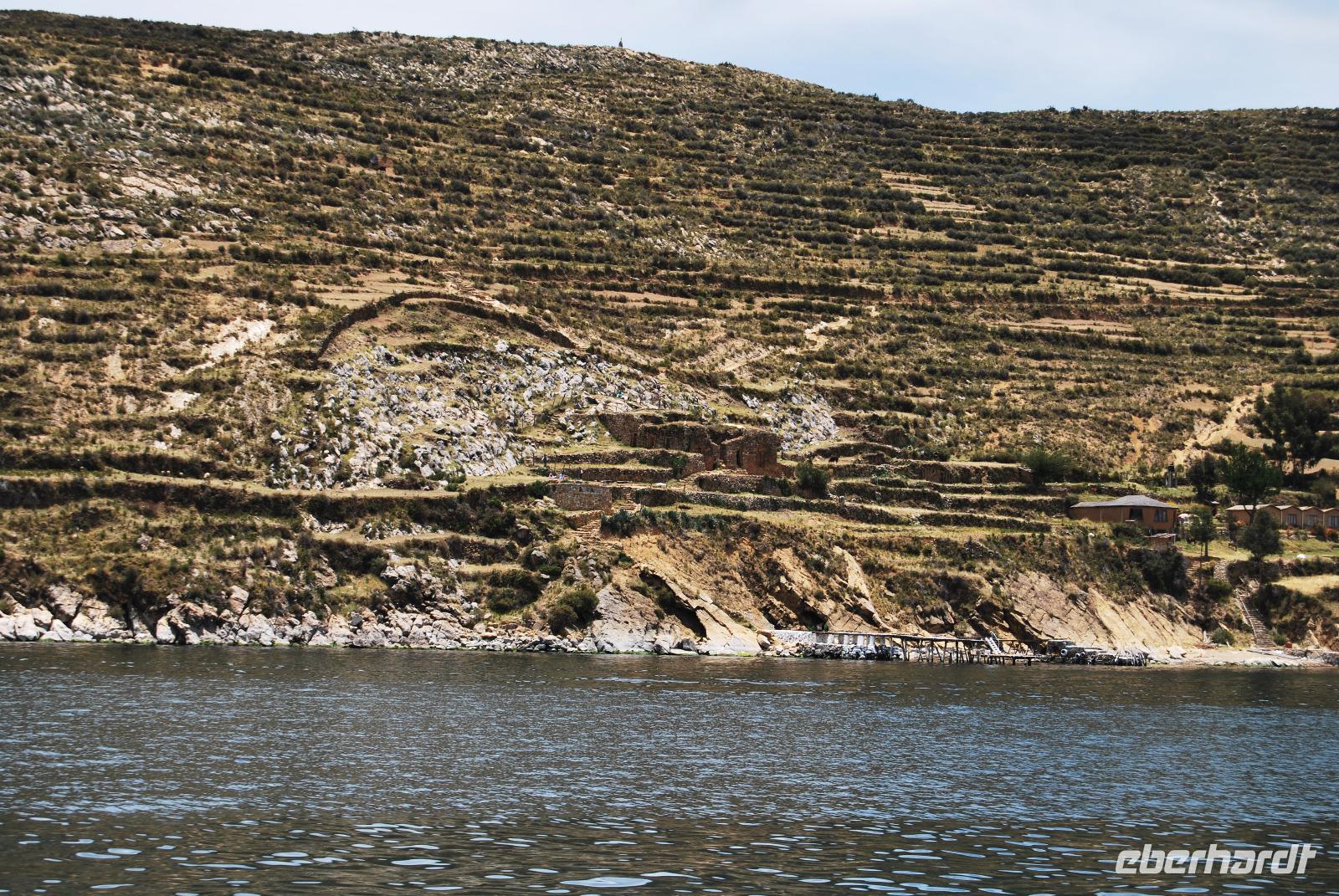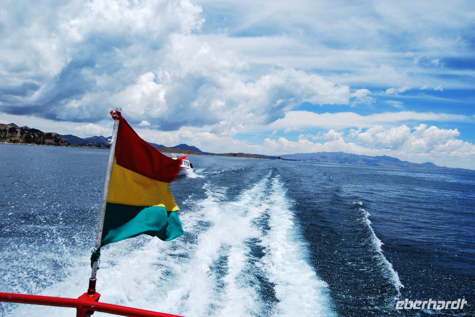 Nach der Besichtigung der Basilika fuhren wir die Straßen zum Hafen hinunter. Am Titicaca-See angekommen ging es zum Marine-Stützpunkt. Denn jede gute Armee hat ja auch eine Marine. Wenn aber das Land keinen Zugang zum Meer besitzt, da sie es in einem blutigen Krieg gegen Chile verloren hatten, muss sich die Marine eben an einem See in 3.812 Meter Höhe über dem Meeresspiegel stationieren. Wie auch immer, an dieser Stelle ankerte unser Boot. Denn nun wechselten wir unser Transportmittel und fuhren mit einem kleinen Boot zur Sonneninsel.