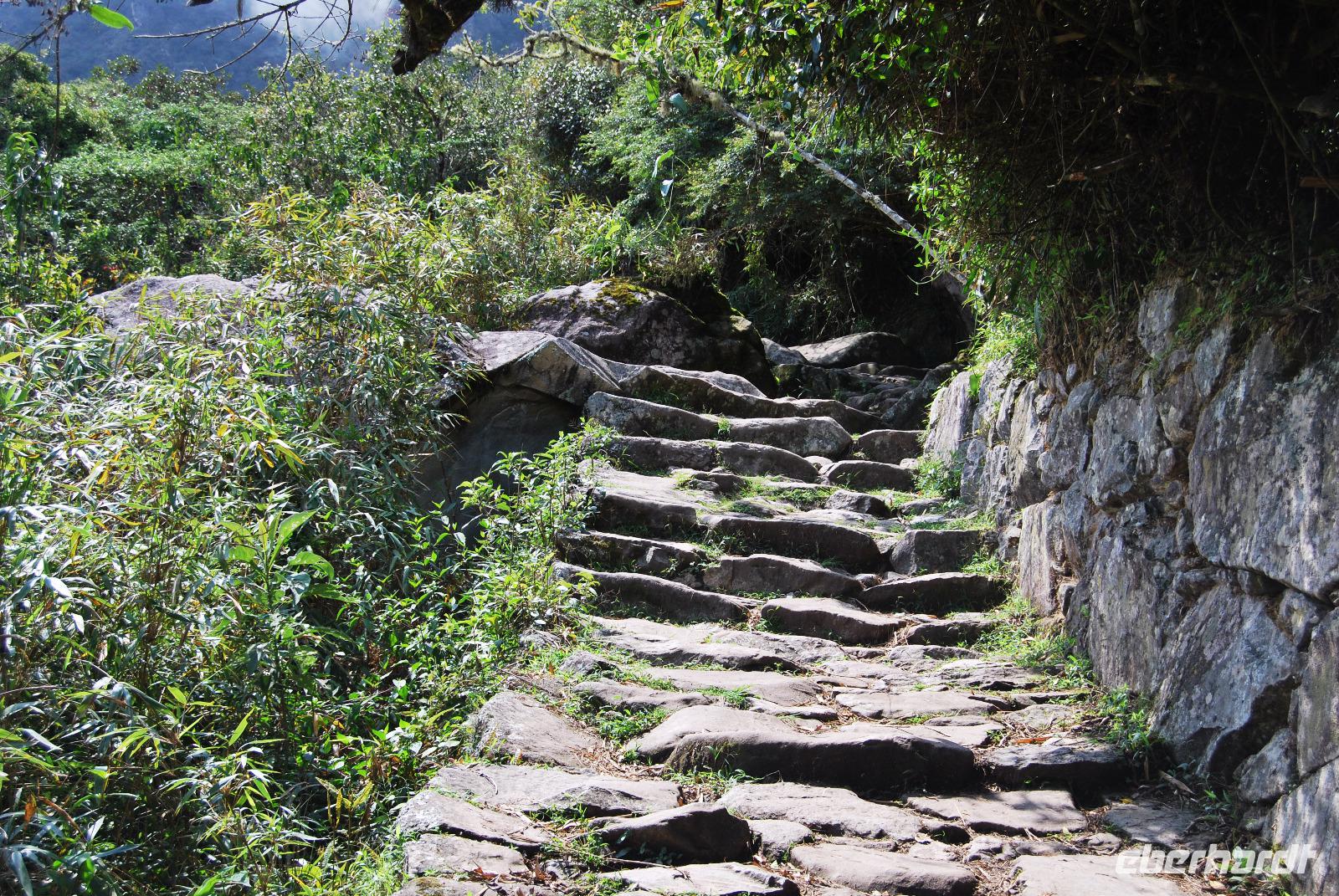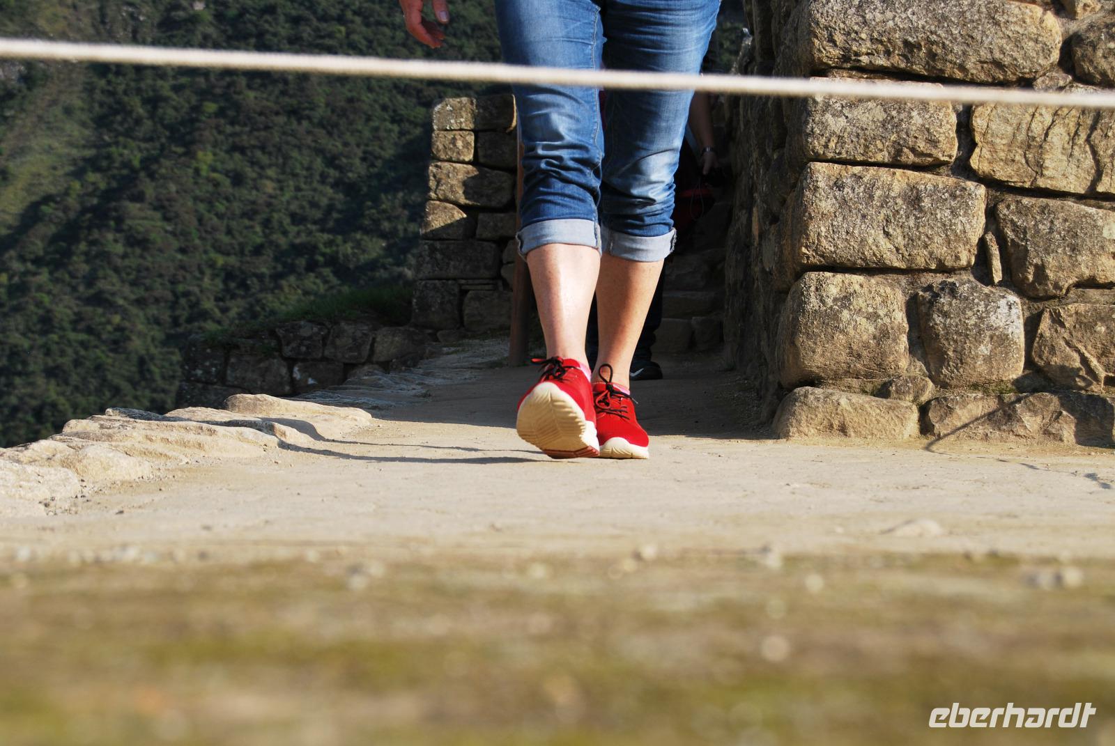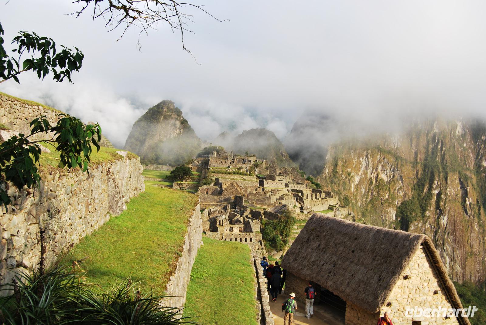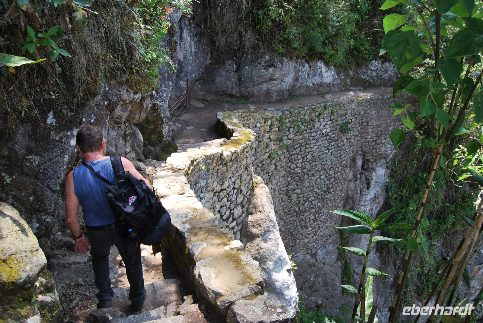 Heute hatten wir ein weiteres Mal die Möglichkeit den Machu Picchu zu besuchen. Aber nur René und ich wagen noch einmal den Aufstieg. Kurz vor halb sechs Uhr morgens reihen wir uns ein in die lange Schlange mit geschätzten 400 Leuten. Es geht aber einigermaßen schnell und wir gelangen zum Haupteingang. Wir hatten uns entschlossen weiter nach oben, bis zum Sonnentor, zu gehen. Leider war es an diesem Tag nicht so schön klar wie am Tage zu vor. Deshalb hatten wir leider nicht die beste Sicht. Nachdem wir eine Weile gewartet hatten, gingen wir wieder zur Hauptanlage zurück, da wir auf der anderen Seite noch die Inkabrücke besichtigen wollten. Der Legende nach soll dies ein alter Fluchtweg der Inkas gewesen sein.