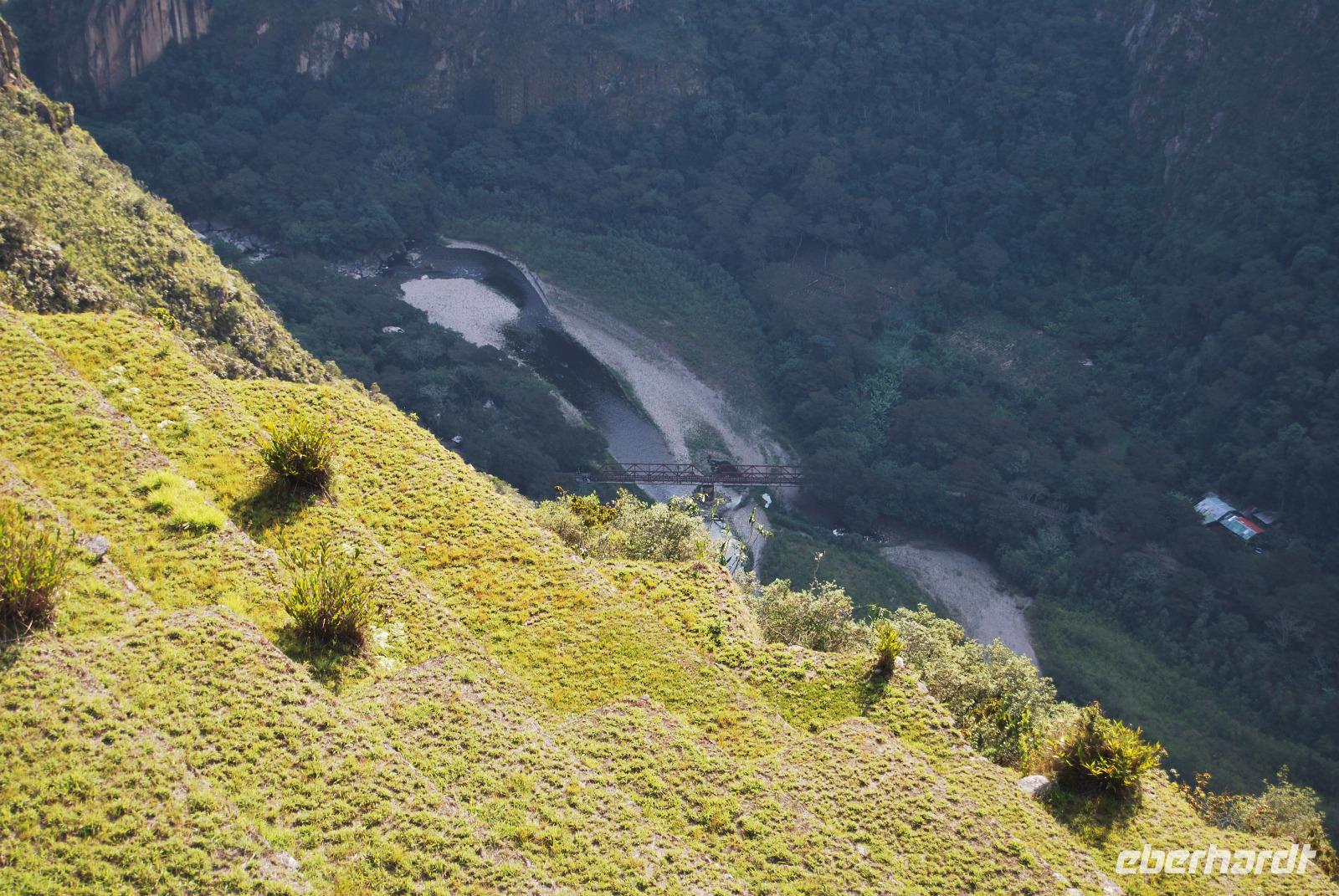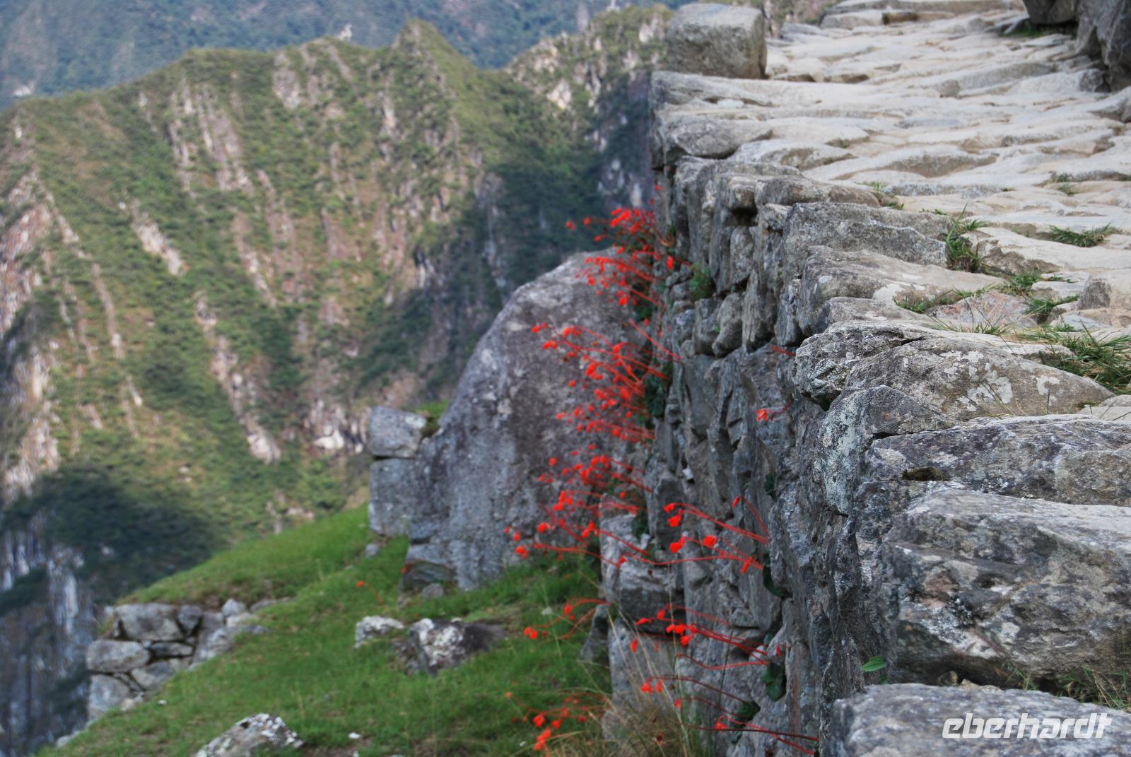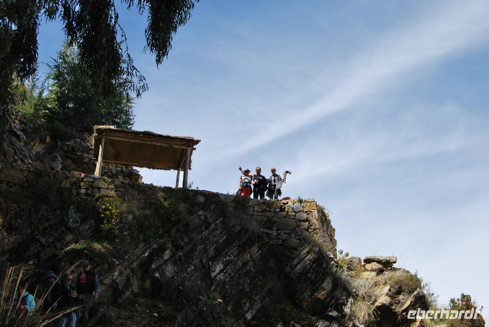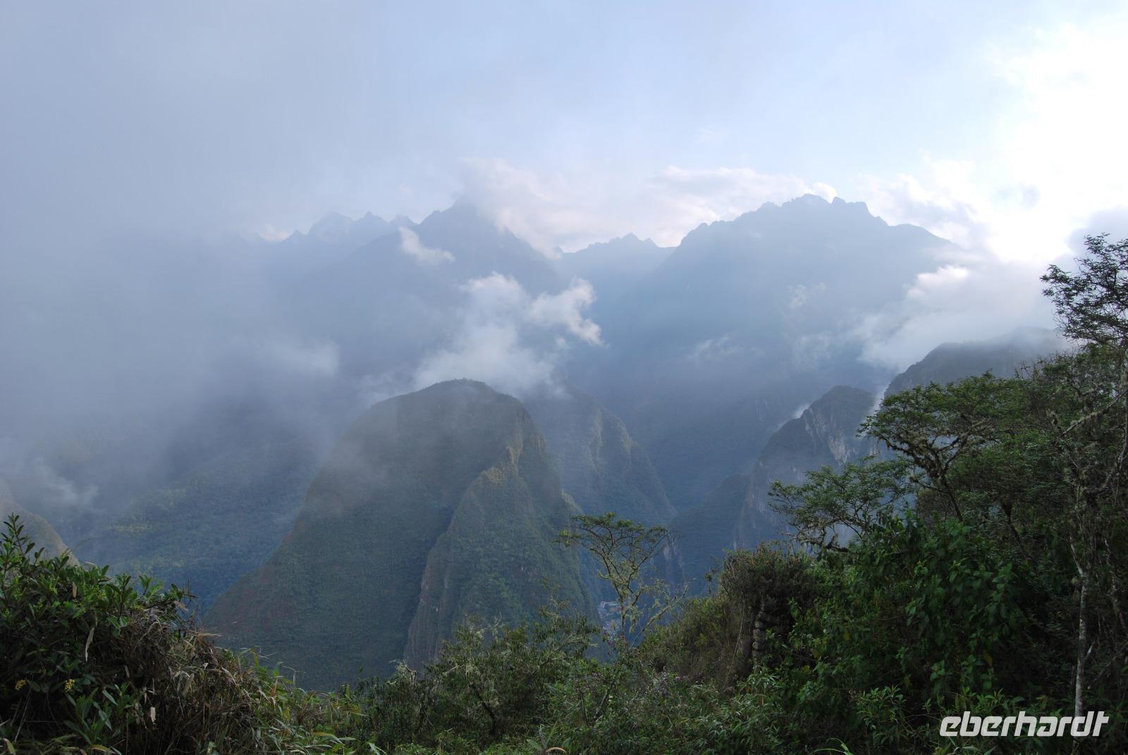 Heute hatten wir ein weiteres Mal die Möglichkeit den Machu Picchu zu besuchen. Aber nur René und ich wagen noch einmal den Aufstieg. Kurz vor halb sechs Uhr morgens reihen wir uns ein in die lange Schlange mit geschätzten 400 Leuten. Es geht aber einigermaßen schnell und wir gelangen zum Haupteingang. Wir hatten uns entschlossen weiter nach oben, bis zum Sonnentor, zu gehen. Leider war es an diesem Tag nicht so schön klar wie am Tage zu vor. Deshalb hatten wir leider nicht die beste Sicht. Nachdem wir eine Weile gewartet hatten, gingen wir wieder zur Hauptanlage zurück, da wir auf der anderen Seite noch die Inkabrücke besichtigen wollten. Der Legende nach soll dies ein alter Fluchtweg der Inkas gewesen sein.