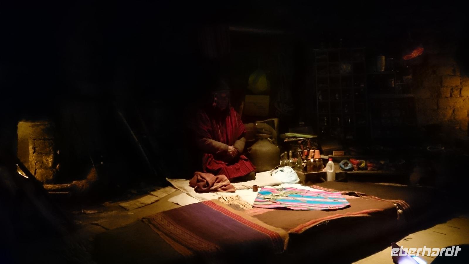 Todmüde kamen wir am Abend im Hotel an, es war schon fast dunkel. Vor dem Essen, es gab wieder frischen Fisch aus dem See, gingen wir noch in das anliegende Heilkunde-Museum der Indianer, wo zahlreiche Kräuter und Pflanzen mit ihrer Wirkung erläutert wurden. Am Ende des Rundgangs erwartete uns ein Schamane. In einem dunklen Raum, nur ein Feuer brannte in der Ecke, saß er da und erwartete uns. Rodrigo übersetzte seine Worte und er erzählte uns etwas über die Bräuche und Fähigkeiten der Schamanen. Am Ende konnten wir ihn nach einem Blick in die Zukunft fragen, wozu er die Geister und Coca-Blätter befragte. Jedoch hatte keiner den Mut ihn etwas zu fragen.