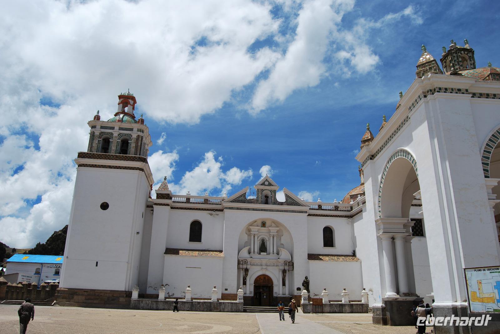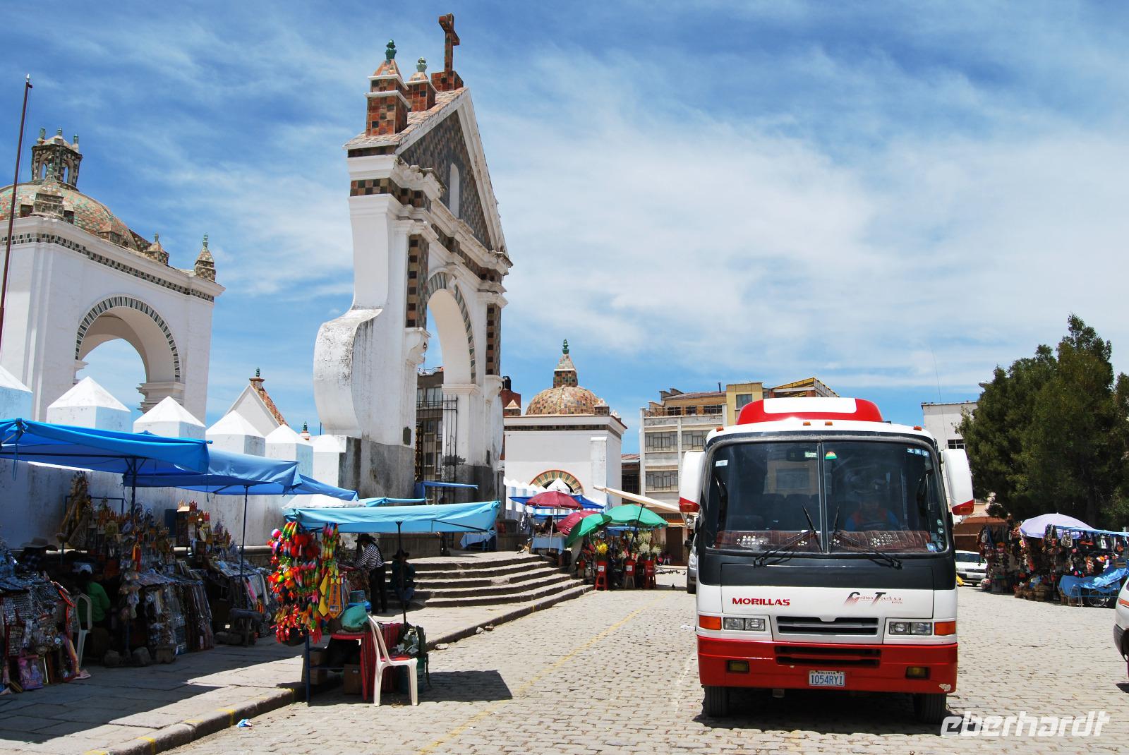 Früh ging es wieder los. Durch Puno hindurch ging es knapp zwei Stunden an der Küstenregion des Titicaca-Sees entlang. An der peruanisch-bolivianischen Grenze angekommen luden wir unser Gepäck auf Handkarren auf. Die nette Inka-Dame schleppte es für uns auf die andere Seite. Denn diese Grenze mussten wir zu Fuß überschreiten. Die Aus- und Einreise ging relativ schnell, zügig drückte der Beamte seinen Stempel in unsere Pässe. Bienvenido a Bolivia! Rodrigo, unser neuer Reiseleiter für die bolivianische Seite des Titicaca-Sees und den Norden Boliviens, begrüßte uns herzlich. Wenig später kamen wir in Copacabana an. Jedoch nicht in Brasilien! Hier in Bolivien, wo einst eine Madonna vom See nach Brasilien an den weltberühmten Strand gebracht wurde und der so seinen Namen erhielt, so erzählt man es sich hier in Bolivien zumindest. Dort angekommen besichtigten wir die berühmteste Wallfahrtskirche Boliviens, die im maurischen Stile errichtet wurde. Zahlreiche Pilger kommen hier zur Basilika um ihr Fahrzeug segnen zulassen. Tausende von Kilometern legen die Gläubigen zurück, teilweise ohne Kennzeichen, um schnellstmöglich die Segnung für ihr Fahrzeug zu erlangen. Die Segnung findet immer vor der Basilika statt und wird von einem Mönch und von einem Schamanen durchgeführt. So hat man alle Glaubensrichtungen abgedeckt und ist auf jeden Fall auf der sicheren Seite. Anschließend wird das Fahrzeug mit Blumen geschmückt.