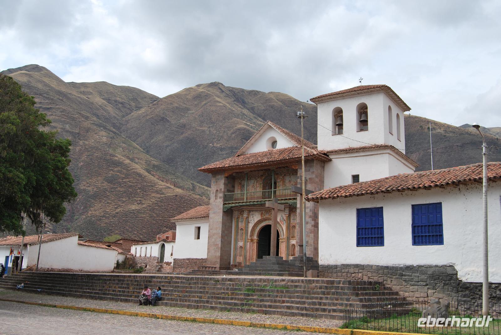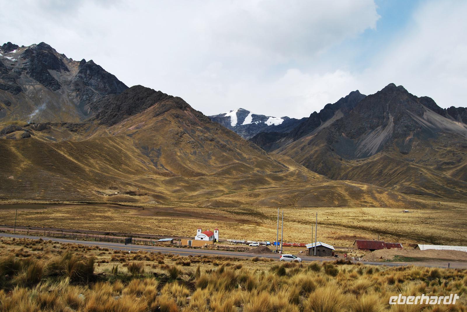 Am frühen Morgen hieß es wieder Sachen packen und aufsitzen. Wir hatten eine lange Fahrt über das Altiplano vor uns. Knapp 400 Kilometer von Cusco nach Puno, an den Titicaca-See, sollten uns gute elf Stunden beschäftigen. Nach gut einer Stunde Fahrtzeit machten wir aber unseren ersten Stopp. Jorge, der uns heute wieder führte, zeigte uns die Kirche von Andahuaylillas, nahe der Stadt Urcos. Von außen sah man, dass dies keine gewöhnliche Kirche ist. Denn über dem aufwendig gearbeiteten Eingangsportal, sah man einen Holzbalkon, was doch recht ungewöhnlich für eine Kirche ist. Wir betraten also die Kirche und sahen einen goldenen Altar im Anden-Barock, eine prunkvoll und filigran verzierte Holzdecke mit zahlreichen Balken und wunderbare Wandmalerei an den Seitenwänden. Hier kann man auch zahlreiche Inschriften erkennen. Da die Kirche damals alle Menschen erreichen wollte, und im Land viele Kulturen aufeinander trafen, sieht man in dieser Kirche Schriften in fünf Sprachen: Latein, Castillian, Aymara, Butina und Quechua. Die letzten drei zählen zu den Sprachen der Indianer. Quechua ist dabei die meist verbreitete Sprache und wird heute noch immer von rund zehn Millionen Menschen gesprochen und gehört auch zu den Amtssprachen in Bolivien, Peru und Ecuador. Bildliche Darstellungen sind hier oft einfach zu erkennen, oder mit entsprechender Beschreibung in allen fünf Sprachen. Wie zum Beispiel ein Bild am Haupteingang die tägliche Entscheidung des Lebens zeigt. Geht man den schweren und stacheligen Weg in den Himmel, der anfangs sehr schmal ist, oder den bequemen und angenehmen Weg in die Hölle, der sich immer weiter zuspitzt?