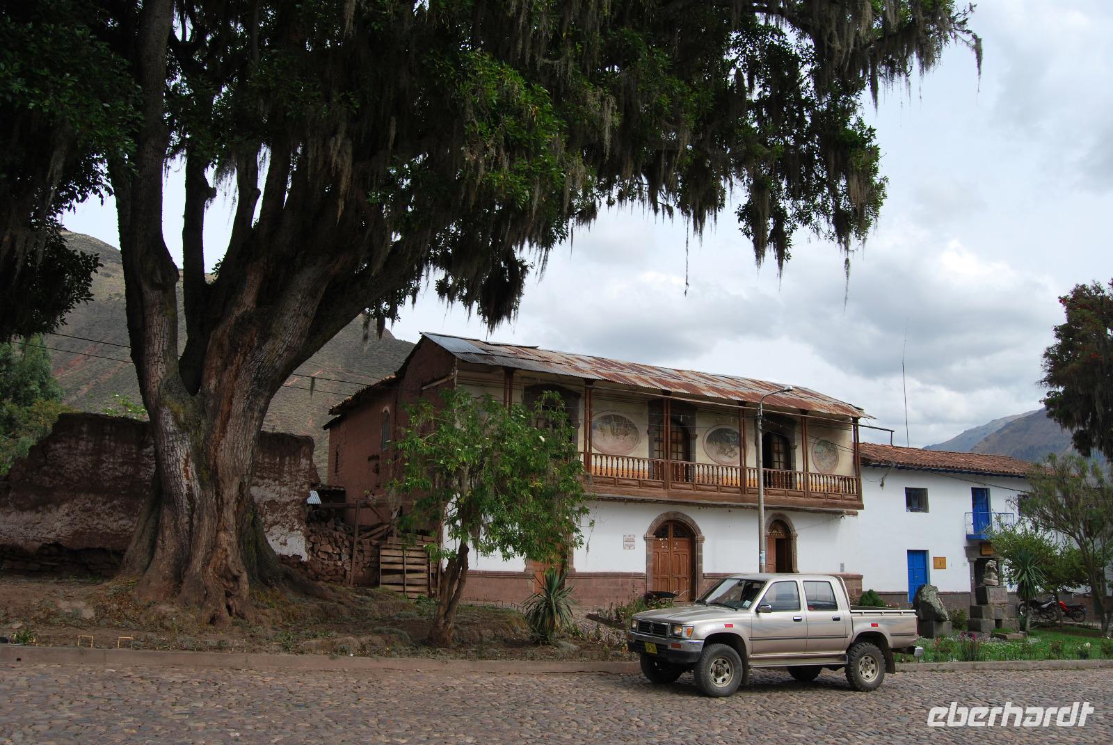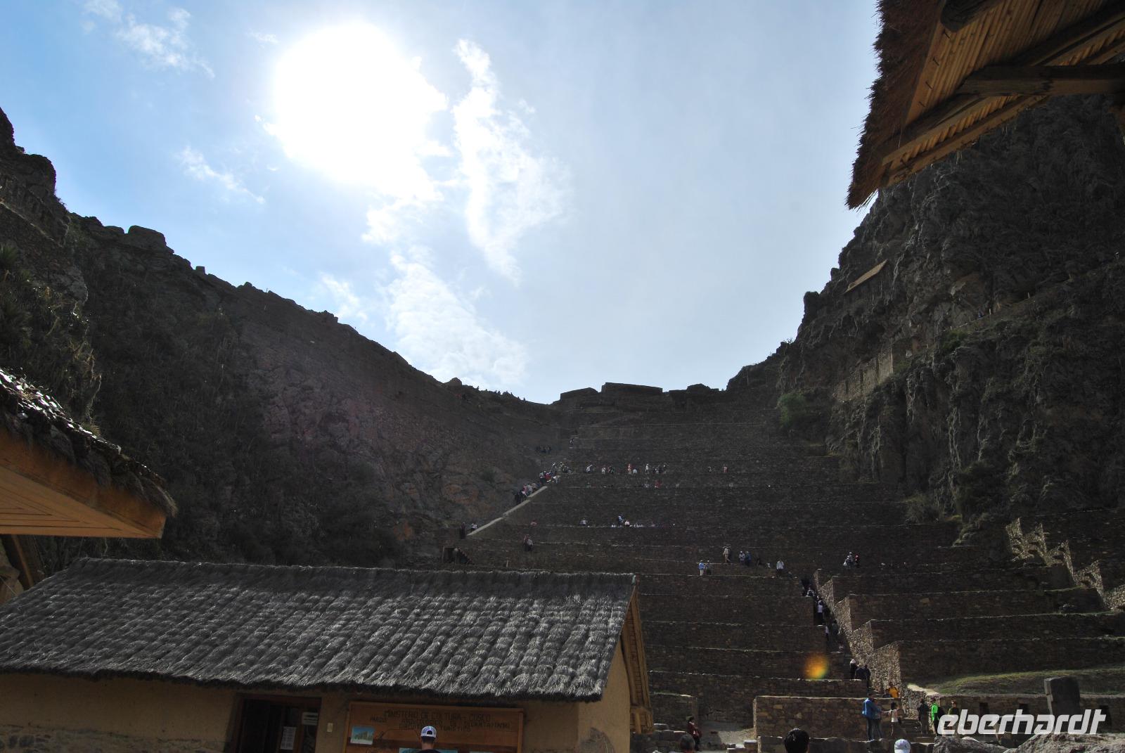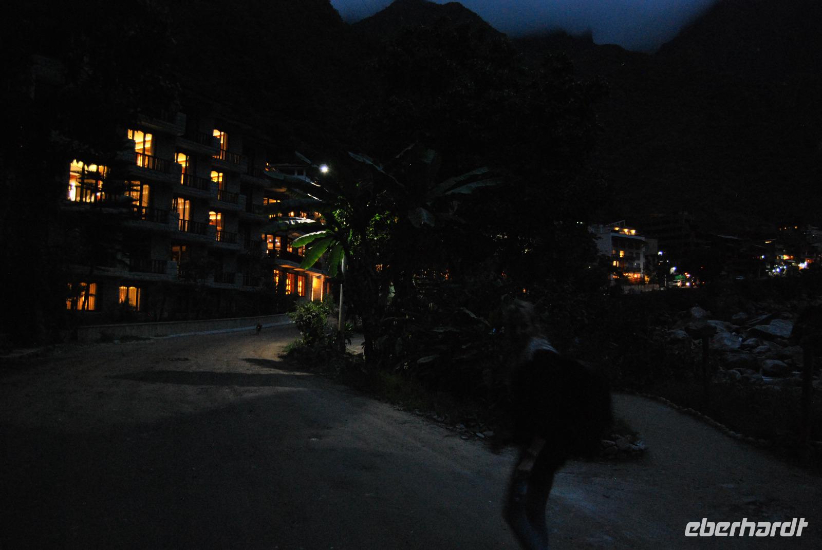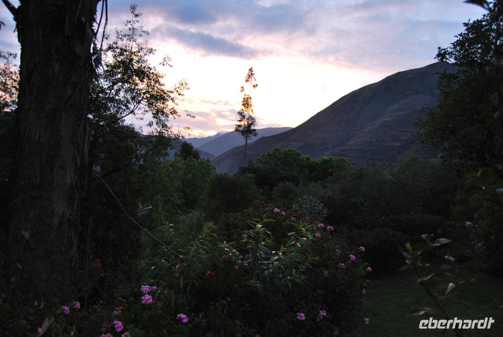 In Ollantaytambo angekommen ging es kurzer Hand eine schmale Gasse hinauf und über den Markt. Die Terrassen der Stätte waren weit in den Fels eingemeißelt und erschienen vielen sehr steil. Zahlreiche Treppen führten nach oben. Auch wenn man sich mit ein paar Coca-Blättern stärkte, kam man schnell außer Atem. Oben angekommen hatten sich aber der Ausblick auf das Tal und der Anblick des Sonnentempels gelohnt. Wir verließen nun Ollantaytambo wieder, die Sonne war schon hinter den Bergen verschwunden und die Dämmerung setzte langsam ein. Wir fuhren ein Stück zurück, bis wir in das Dorf Urubamba kamen, das den gleichen Namen wie der anliegende Fluss trägt. Dort ging es über eine buckelige Schotterpiste zum Hotel - sehr idyllisch in der Natur gelegen, mehrere kleine Hütten im Stile einer Hacienda.