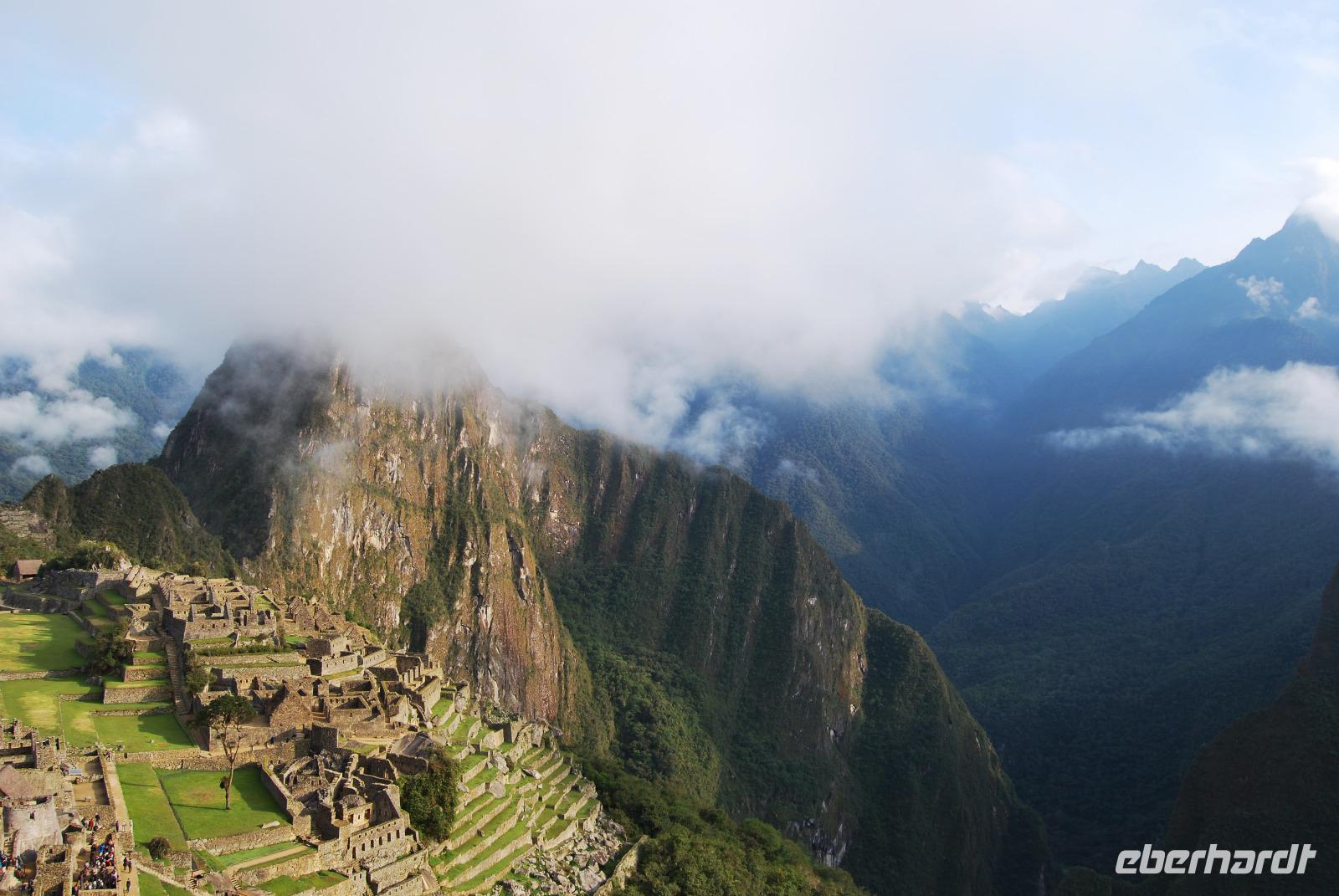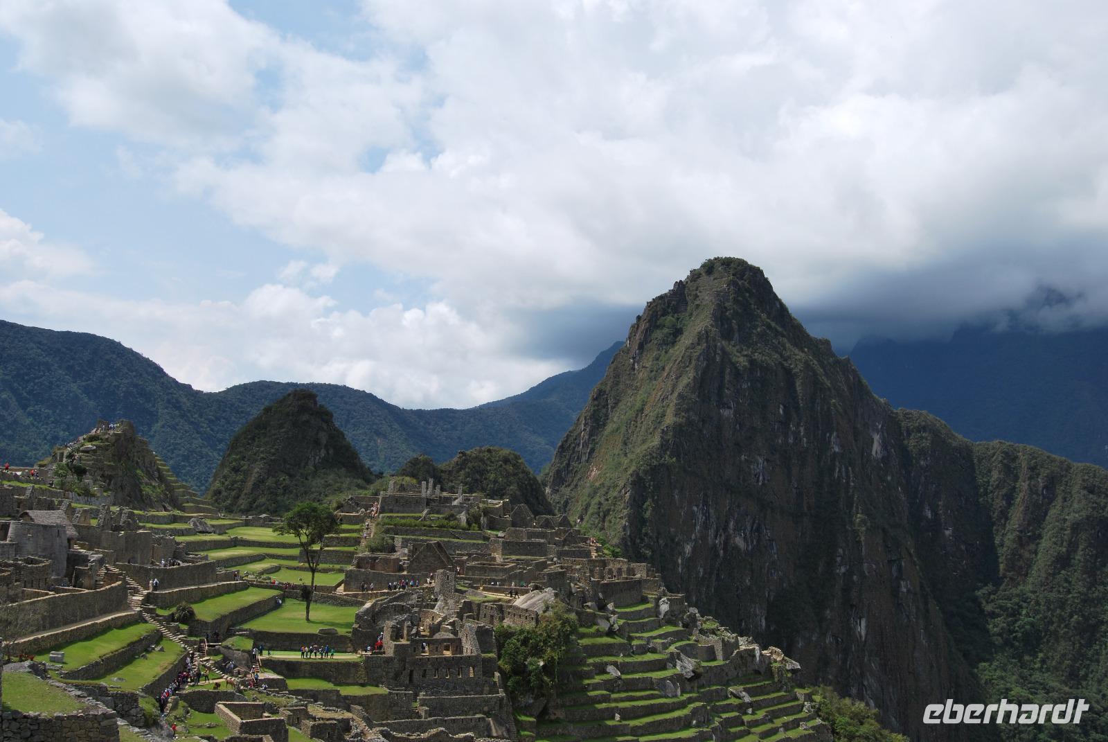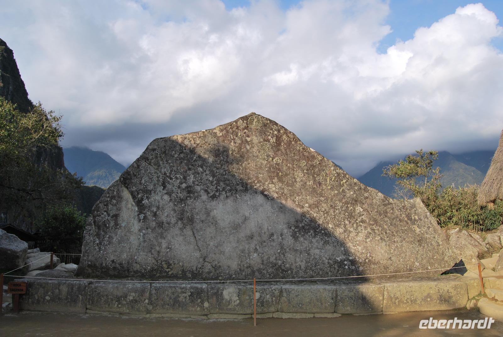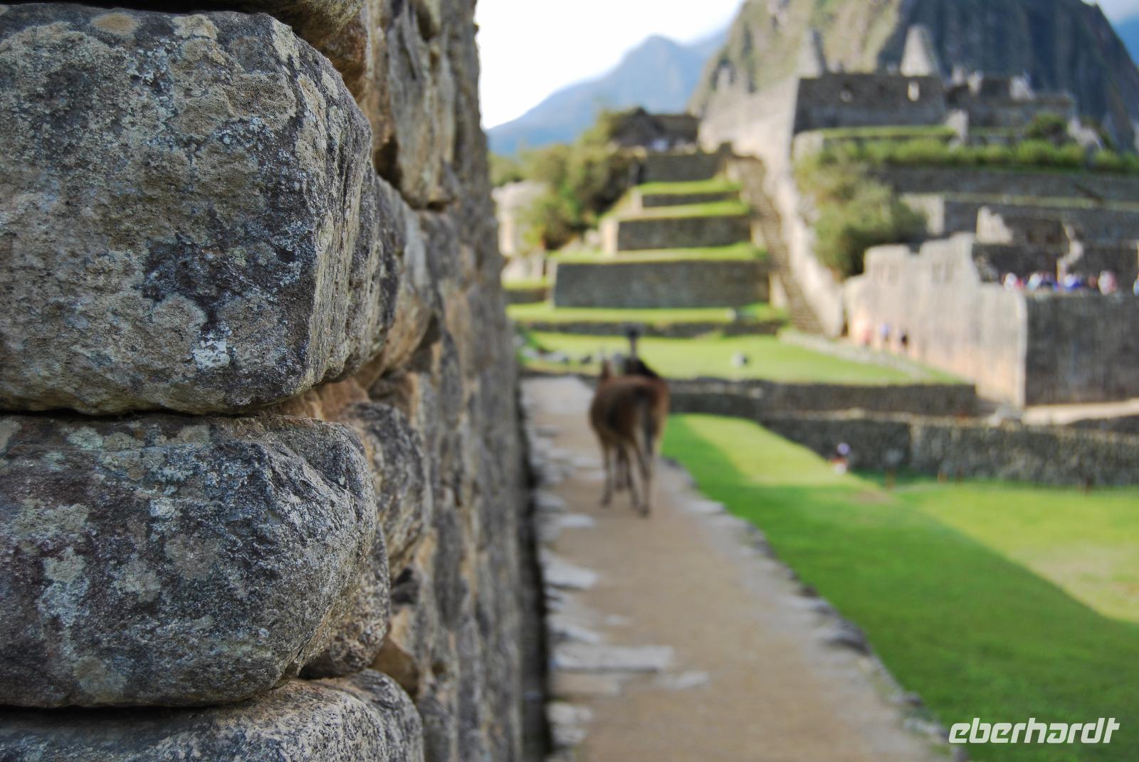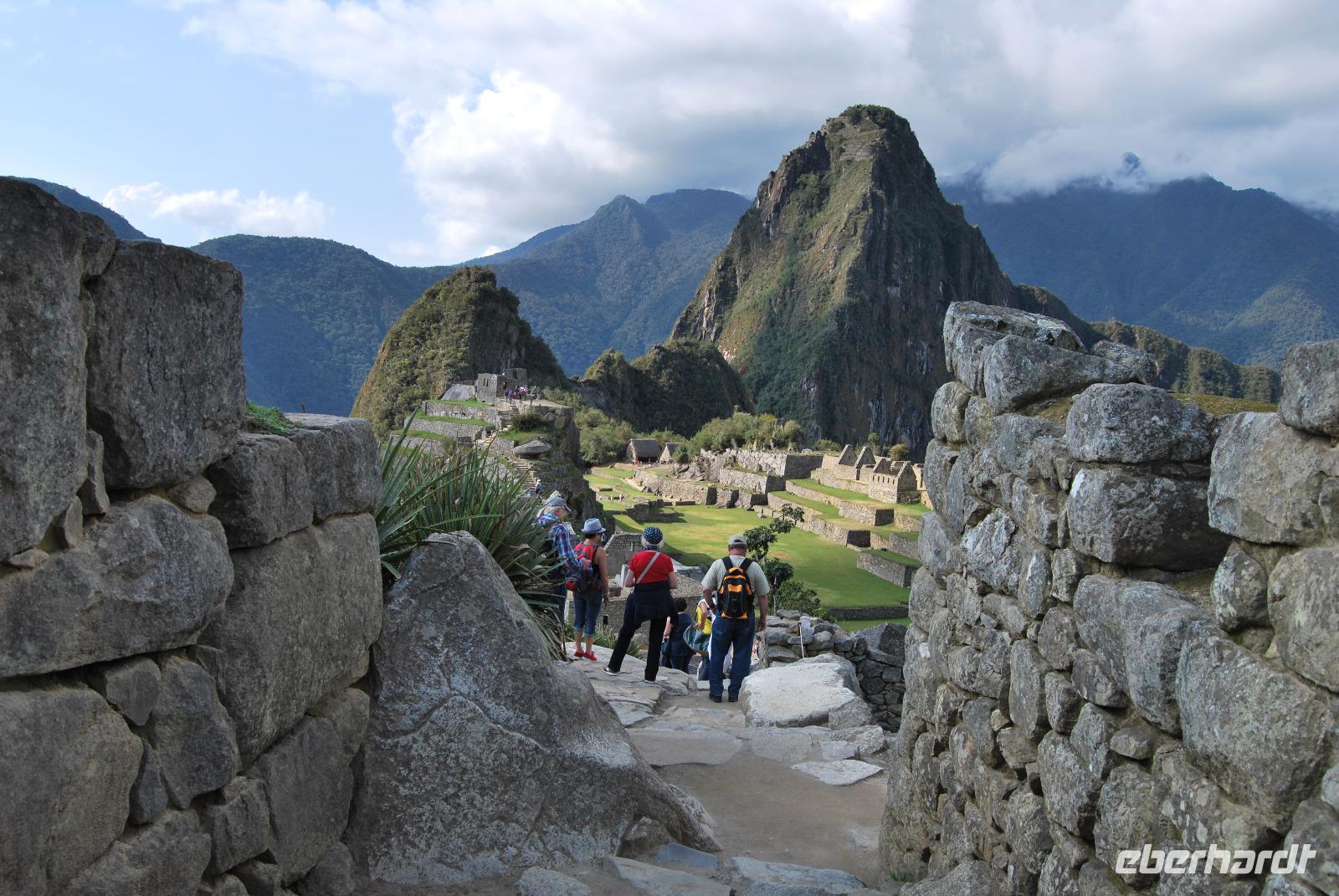 So! Nun konnte es endlich losgehen, der Augenblick war gekommen. Wir gingen durch das Eingangsportal, einen leichten Bogen, begleitet von einem gewaltigen Bergpanorama auf der rechten Seite. Zur Linken, ein relativ steiles Dickicht, was wir noch überwinden mussten. Zuerst sahen wir ein paar Lagerhäuser der Inkas, mit Stroh bedeckt. Dann mussten wir uns noch ein paar Höhenmeter nach oben kämpfen und dann war es endlich da! Eine langvergessene und gut erhaltene Ruinen-Stadt, die die Spanier nie gefunden hatten und die erst im Jahre 1911 wieder so richtig auftauchte. Die inzwischen wohl berühmteste und meistbesuchte Inka-Stadt wurde laut der Chronisten um 1450 auf Befehl des damaligen Herrschers Pachacútec Yupanqui errichtet. Die Stadt umfasst Hunderte steinerne Bauten, zahlreiche Terrassen, die die Inkas für die Landwirtschaft nutzten und auch als Berg-Befestigung, sowie Tausende und Abertausende von Stufen! Wunderbar gelegen zwischen den beiden Berggipfeln Huayna Picchu und den gleichnamigen Machu Picchu. Die Besichtigung der Anlage machte großen Spaß und ließ die Anstrengung der Höhe und der Treppenstufen fast vergessen. Jorge erläuterte uns wie gewohnte zahlreiche Dinge zur Lebensweise, Bauart und Kultur der Inkas. Eindrucksvoll auch die zahlreichen Tempel die dort zu finden sind. Was mich besonders fasziniert ist der Sonnentempel. Denn in ihm kommt es immer zur Sonnenwende zu einem besonderen Ereignis. Der Tempel wurde so ausgerichtet, dass am Tage der Sonnenwende das Licht der aufgehenden Sonne entweder über einen Bergkamm (Wintersonne) oder durch das Kilometer entfernte Sonnentor (Sommersonne) scheint und direkt durch eine Öffnung in den Tempel strahlt. Durch dieses besondere Ereignis, wussten die Inkas hervorragend ihre Landwirtschaft zu nutzen. In der Kultur der Inkas war es aber auch üblich dem Gott der Sonne - Inti oder auch der Muttererde - Pachamama etwas zu opfern. So geht zum Beispiel auch der erste Schluck Wasser den man trinkt oder das erste Stück Brot zur Pachamama. Den Sonnengott Inti zu huldigen war da nicht ganz so leicht. Die Inkas haben immer die kostbarsten Dinge ihren Göttern gegeben - so waren Opfer von Tieren keine Seltenheit. Aber das Jahr war lang und so opferte man zu bestimmten Feiertagen auch Menschen. Und was war wohl kostbarer als eine Jungfrau aus der Stadt, die Schönste die man Inti bieten konnte? Ja, war dies einst wirklich geschehen? Es ist in der heutigen Zeit kaum vorstellbar - jedoch sind die zahlreichen Opfersteine eindrucksvoll. Meisterlich hat man den Fels bearbeitet. Riesige Steine von Tempelanlagen über Terrassen, mehrere Tonnen schwer wurden sie filigran behauen, geschliffen und auf ein Zehntel genau bewegt.