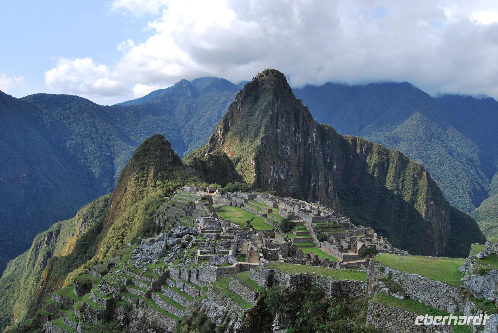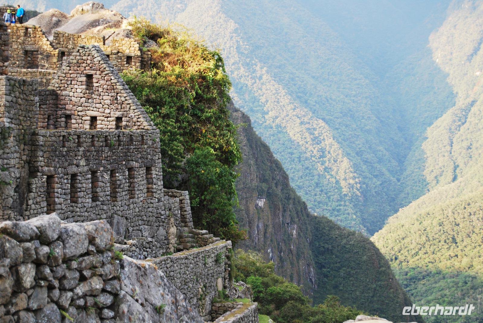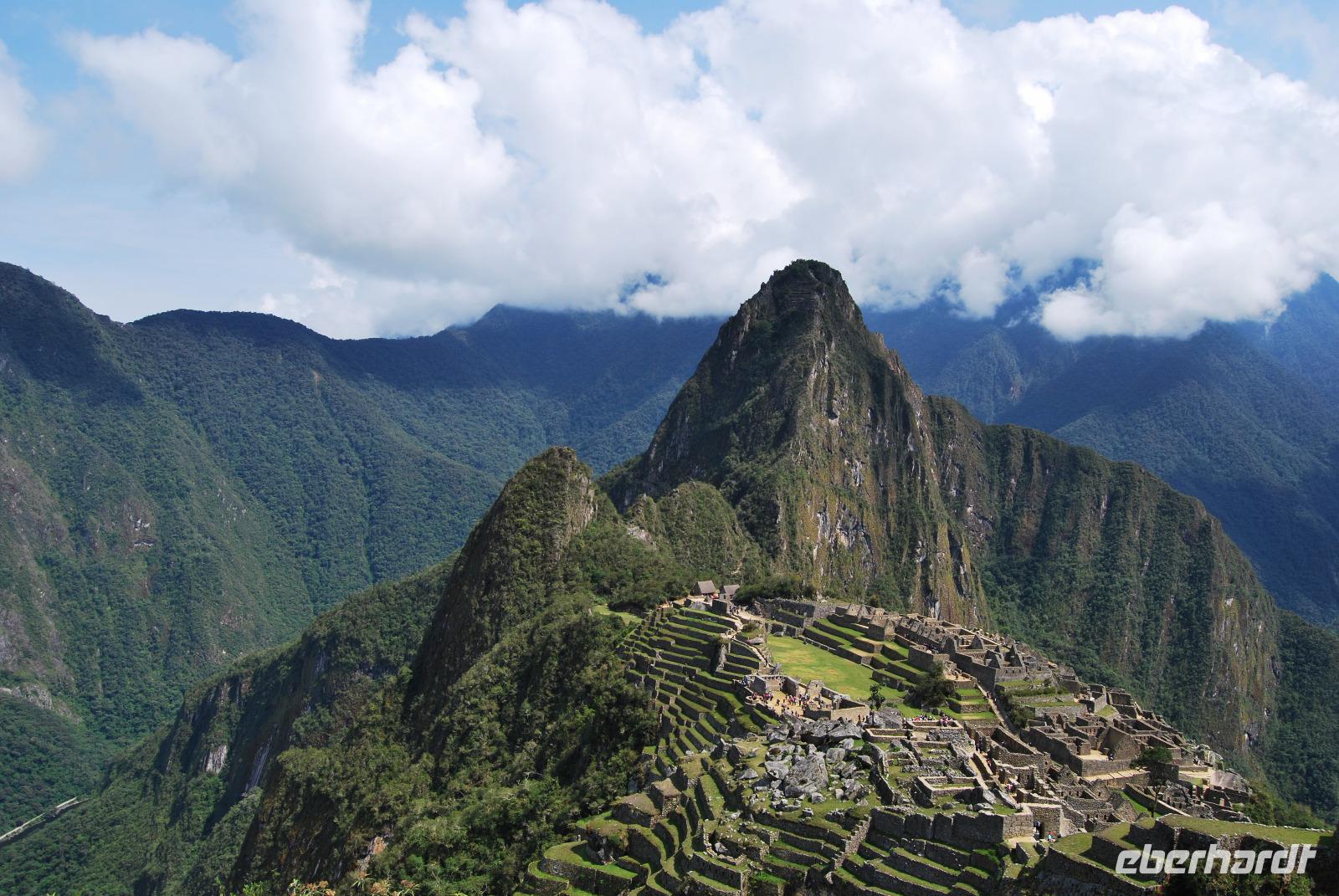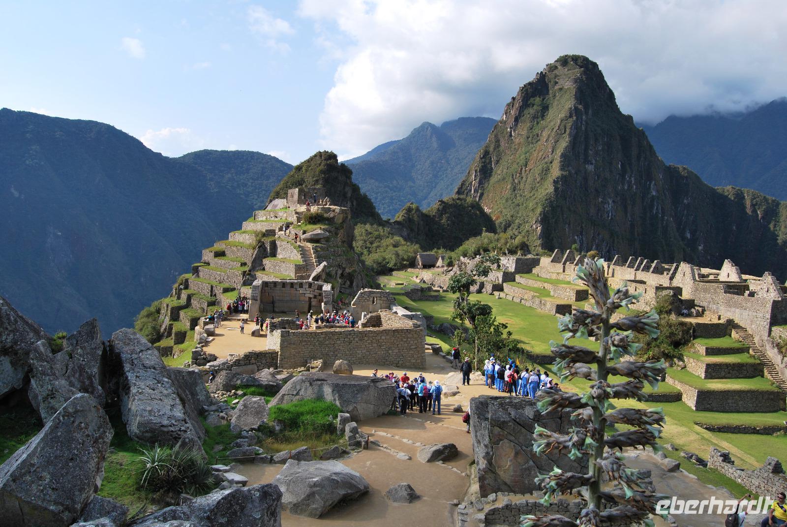 So! Nun konnte es endlich losgehen, der Augenblick war gekommen. Wir gingen durch das Eingangsportal, einen leichten Bogen, begleitet von einem gewaltigen Bergpanorama auf der rechten Seite. Zur Linken, ein relativ steiles Dickicht, was wir noch überwinden mussten. Zuerst sahen wir ein paar Lagerhäuser der Inkas, mit Stroh bedeckt. Dann mussten wir uns noch ein paar Höhenmeter nach oben kämpfen und dann war es endlich da! Eine langvergessene und gut erhaltene Ruinen-Stadt, die die Spanier nie gefunden hatten und die erst im Jahre 1911 wieder so richtig auftauchte. Die inzwischen wohl berühmteste und meistbesuchte Inka-Stadt wurde laut der Chronisten um 1450 auf Befehl des damaligen Herrschers Pachacútec Yupanqui errichtet. Die Stadt umfasst Hunderte steinerne Bauten, zahlreiche Terrassen, die die Inkas für die Landwirtschaft nutzten und auch als Berg-Befestigung, sowie Tausende und Abertausende von Stufen! Wunderbar gelegen zwischen den beiden Berggipfeln Huayna Picchu und den gleichnamigen Machu Picchu. Die Besichtigung der Anlage machte großen Spaß und ließ die Anstrengung der Höhe und der Treppenstufen fast vergessen. Jorge erläuterte uns wie gewohnte zahlreiche Dinge zur Lebensweise, Bauart und Kultur der Inkas. Eindrucksvoll auch die zahlreichen Tempel die dort zu finden sind. Was mich besonders fasziniert ist der Sonnentempel. Denn in ihm kommt es immer zur Sonnenwende zu einem besonderen Ereignis. Der Tempel wurde so ausgerichtet, dass am Tage der Sonnenwende das Licht der aufgehenden Sonne entweder über einen Bergkamm (Wintersonne) oder durch das Kilometer entfernte Sonnentor (Sommersonne) scheint und direkt durch eine Öffnung in den Tempel strahlt. Durch dieses besondere Ereignis, wussten die Inkas hervorragend ihre Landwirtschaft zu nutzen. In der Kultur der Inkas war es aber auch üblich dem Gott der Sonne - Inti oder auch der Muttererde - Pachamama etwas zu opfern. So geht zum Beispiel auch der erste Schluck Wasser den man trinkt oder das erste Stück Brot zur Pachamama. Den Sonnengott Inti zu huldigen war da nicht ganz so leicht. Die Inkas haben immer die kostbarsten Dinge ihren Göttern gegeben - so waren Opfer von Tieren keine Seltenheit. Aber das Jahr war lang und so opferte man zu bestimmten Feiertagen auch Menschen. Und was war wohl kostbarer als eine Jungfrau aus der Stadt, die Schönste die man Inti bieten konnte? Ja, war dies einst wirklich geschehen? Es ist in der heutigen Zeit kaum vorstellbar - jedoch sind die zahlreichen Opfersteine eindrucksvoll. Meisterlich hat man den Fels bearbeitet. Riesige Steine von Tempelanlagen über Terrassen, mehrere Tonnen schwer wurden sie filigran behauen, geschliffen und auf ein Zehntel genau bewegt.