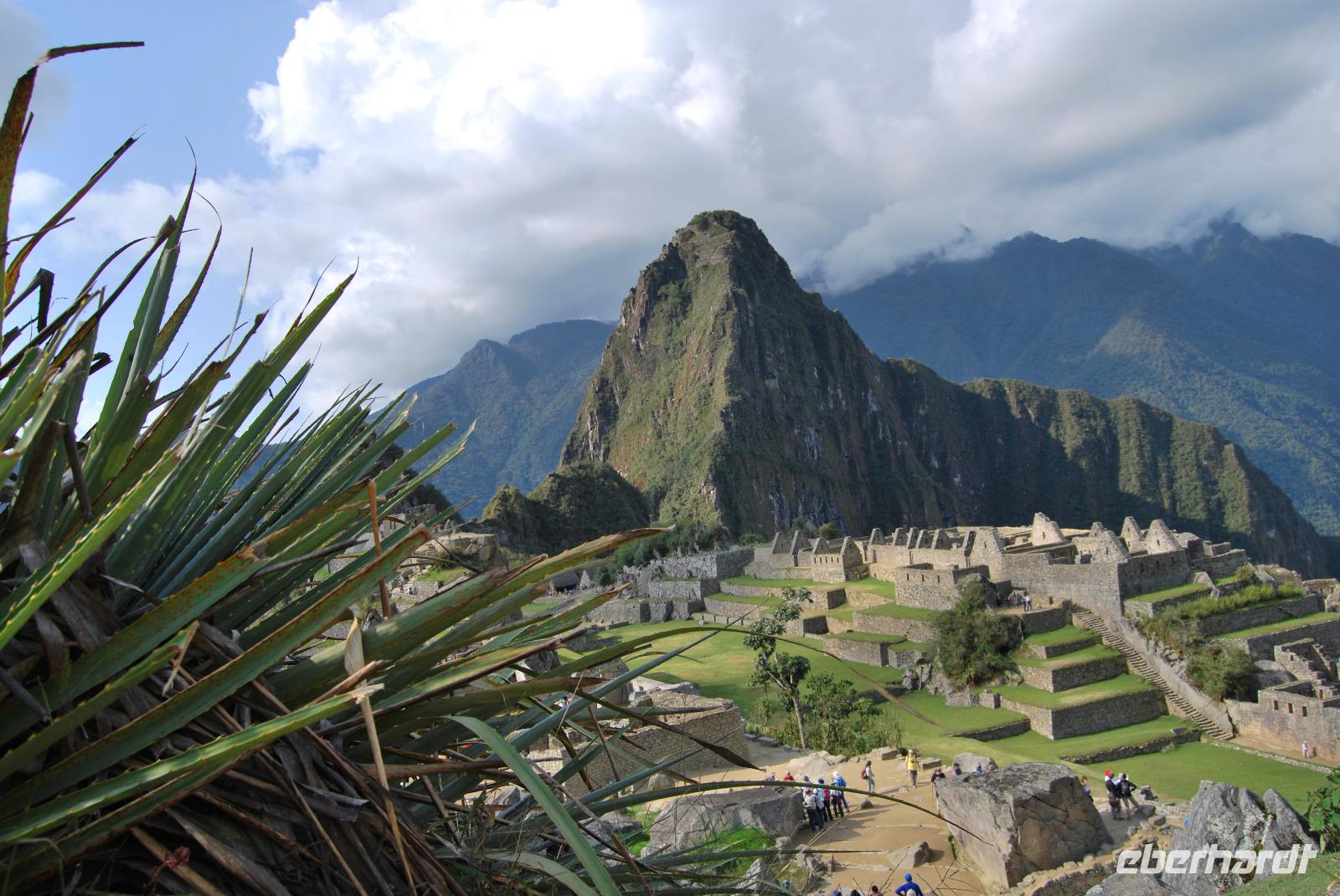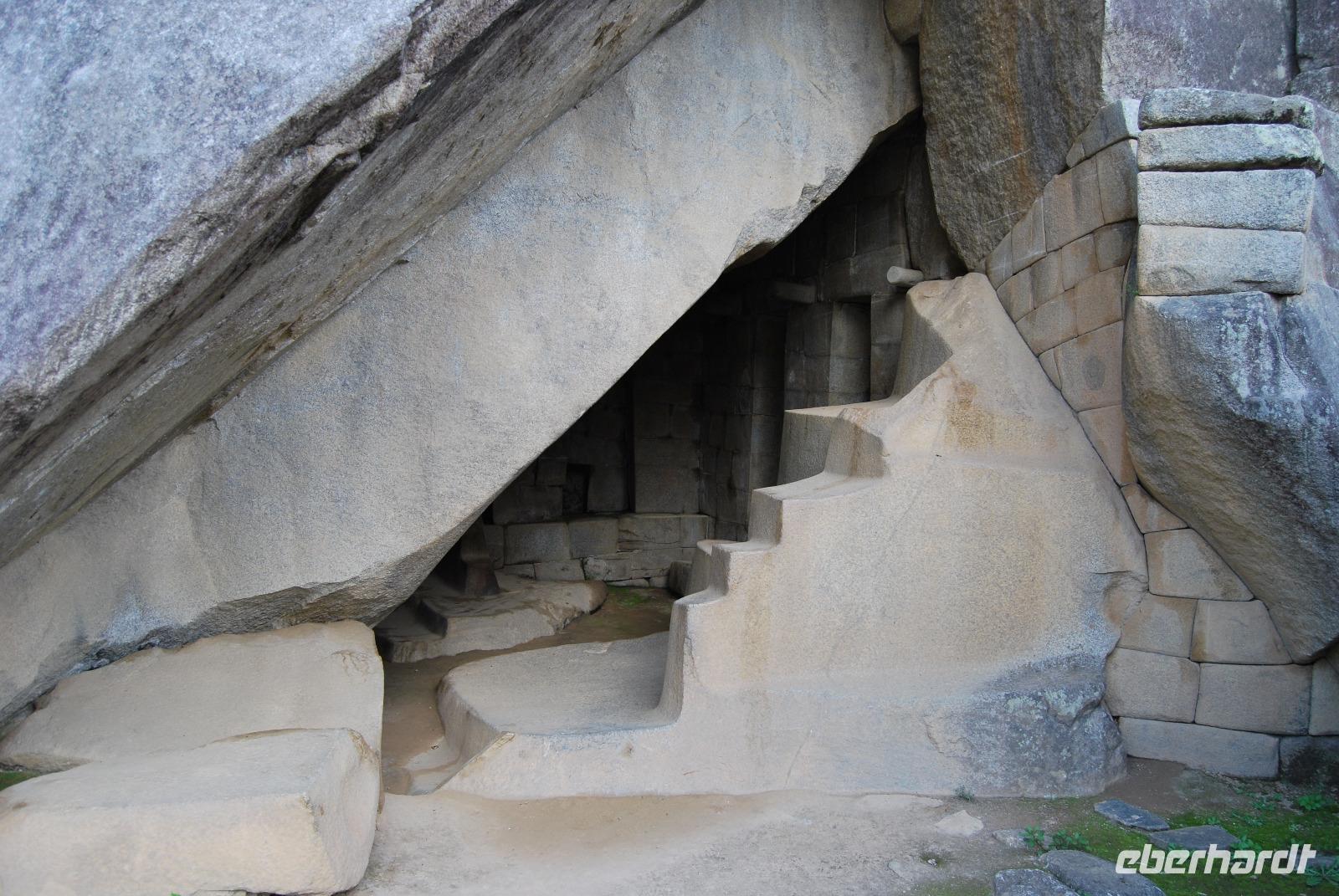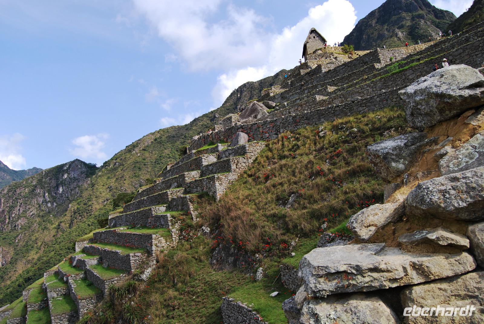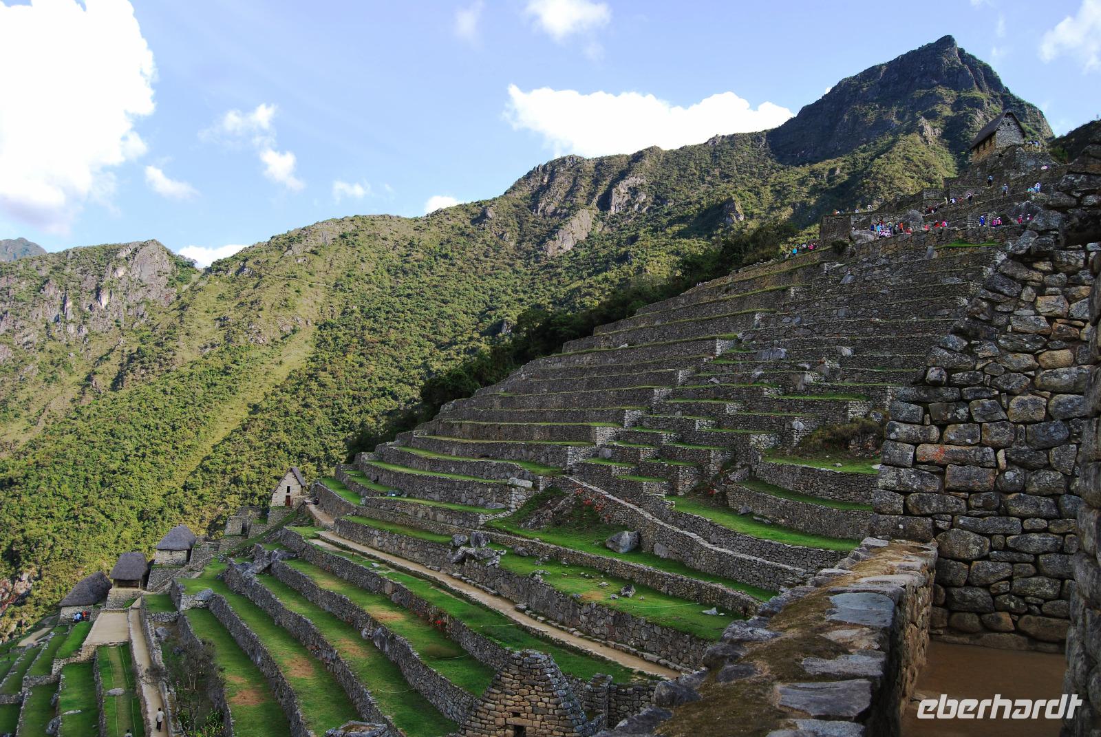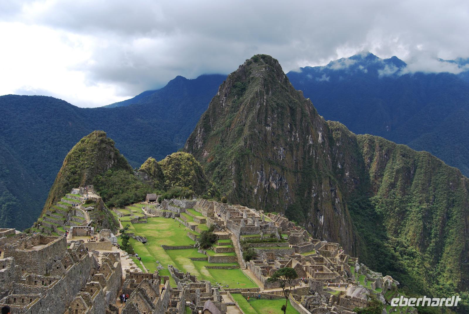 So! Nun konnte es endlich losgehen, der Augenblick war gekommen. Wir gingen durch das Eingangsportal, einen leichten Bogen, begleitet von einem gewaltigen Bergpanorama auf der rechten Seite. Zur Linken, ein relativ steiles Dickicht, was wir noch überwinden mussten. Zuerst sahen wir ein paar Lagerhäuser der Inkas, mit Stroh bedeckt. Dann mussten wir uns noch ein paar Höhenmeter nach oben kämpfen und dann war es endlich da! Eine langvergessene und gut erhaltene Ruinen-Stadt, die die Spanier nie gefunden hatten und die erst im Jahre 1911 wieder so richtig auftauchte. Die inzwischen wohl berühmteste und meistbesuchte Inka-Stadt wurde laut der Chronisten um 1450 auf Befehl des damaligen Herrschers Pachacútec Yupanqui errichtet. Die Stadt umfasst Hunderte steinerne Bauten, zahlreiche Terrassen, die die Inkas für die Landwirtschaft nutzten und auch als Berg-Befestigung, sowie Tausende und Abertausende von Stufen! Wunderbar gelegen zwischen den beiden Berggipfeln Huayna Picchu und den gleichnamigen Machu Picchu. Die Besichtigung der Anlage machte großen Spaß und ließ die Anstrengung der Höhe und der Treppenstufen fast vergessen. Jorge erläuterte uns wie gewohnte zahlreiche Dinge zur Lebensweise, Bauart und Kultur der Inkas. Eindrucksvoll auch die zahlreichen Tempel die dort zu finden sind. Was mich besonders fasziniert ist der Sonnentempel. Denn in ihm kommt es immer zur Sonnenwende zu einem besonderen Ereignis. Der Tempel wurde so ausgerichtet, dass am Tage der Sonnenwende das Licht der aufgehenden Sonne entweder über einen Bergkamm (Wintersonne) oder durch das Kilometer entfernte Sonnentor (Sommersonne) scheint und direkt durch eine Öffnung in den Tempel strahlt. Durch dieses besondere Ereignis, wussten die Inkas hervorragend ihre Landwirtschaft zu nutzen. In der Kultur der Inkas war es aber auch üblich dem Gott der Sonne - Inti oder auch der Muttererde - Pachamama etwas zu opfern. So geht zum Beispiel auch der erste Schluck Wasser den man trinkt oder das erste Stück Brot zur Pachamama. Den Sonnengott Inti zu huldigen war da nicht ganz so leicht. Die Inkas haben immer die kostbarsten Dinge ihren Göttern gegeben - so waren Opfer von Tieren keine Seltenheit. Aber das Jahr war lang und so opferte man zu bestimmten Feiertagen auch Menschen. Und was war wohl kostbarer als eine Jungfrau aus der Stadt, die Schönste die man Inti bieten konnte? Ja, war dies einst wirklich geschehen? Es ist in der heutigen Zeit kaum vorstellbar - jedoch sind die zahlreichen Opfersteine eindrucksvoll. Meisterlich hat man den Fels bearbeitet. Riesige Steine von Tempelanlagen über Terrassen, mehrere Tonnen schwer wurden sie filigran behauen, geschliffen und auf ein Zehntel genau bewegt.