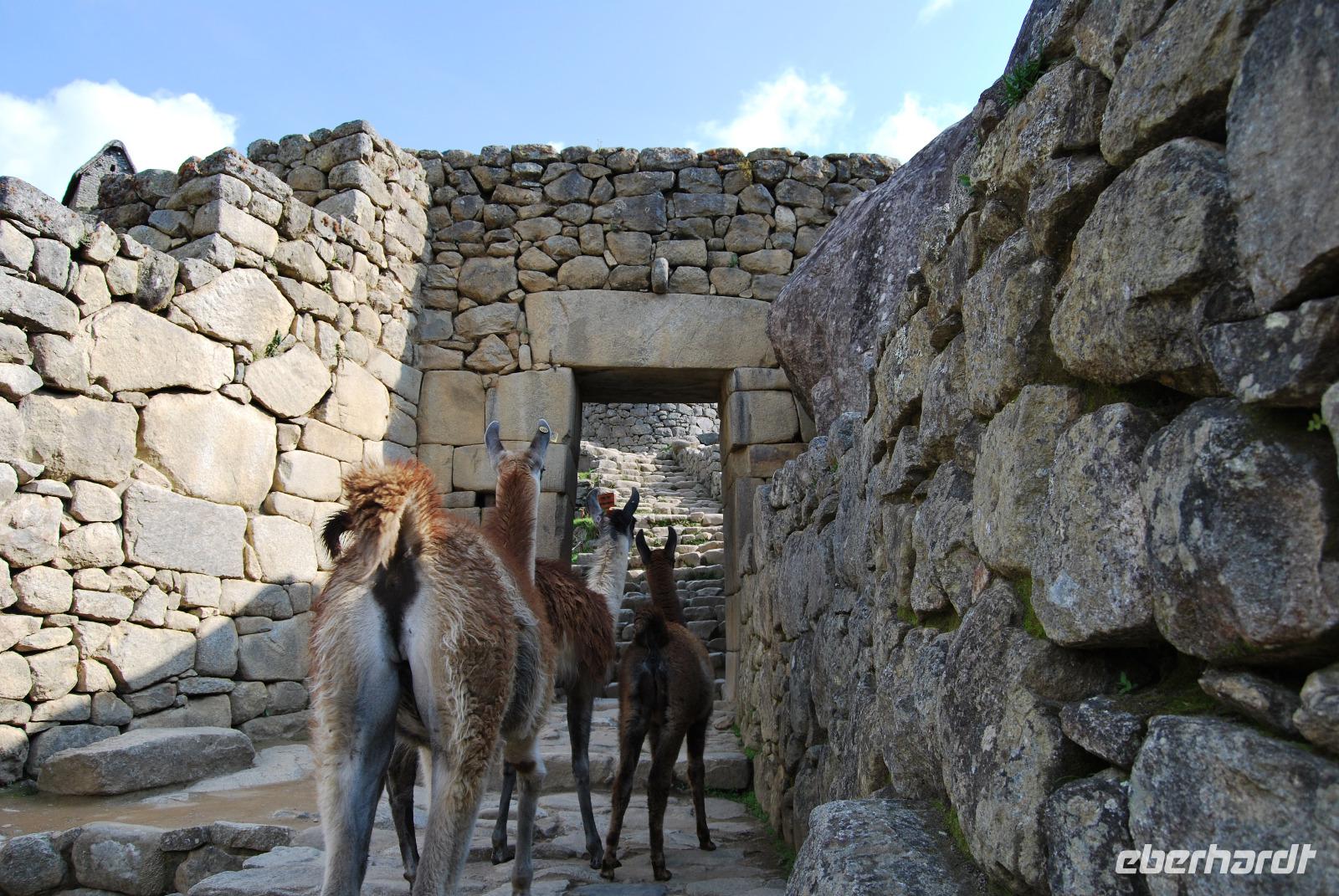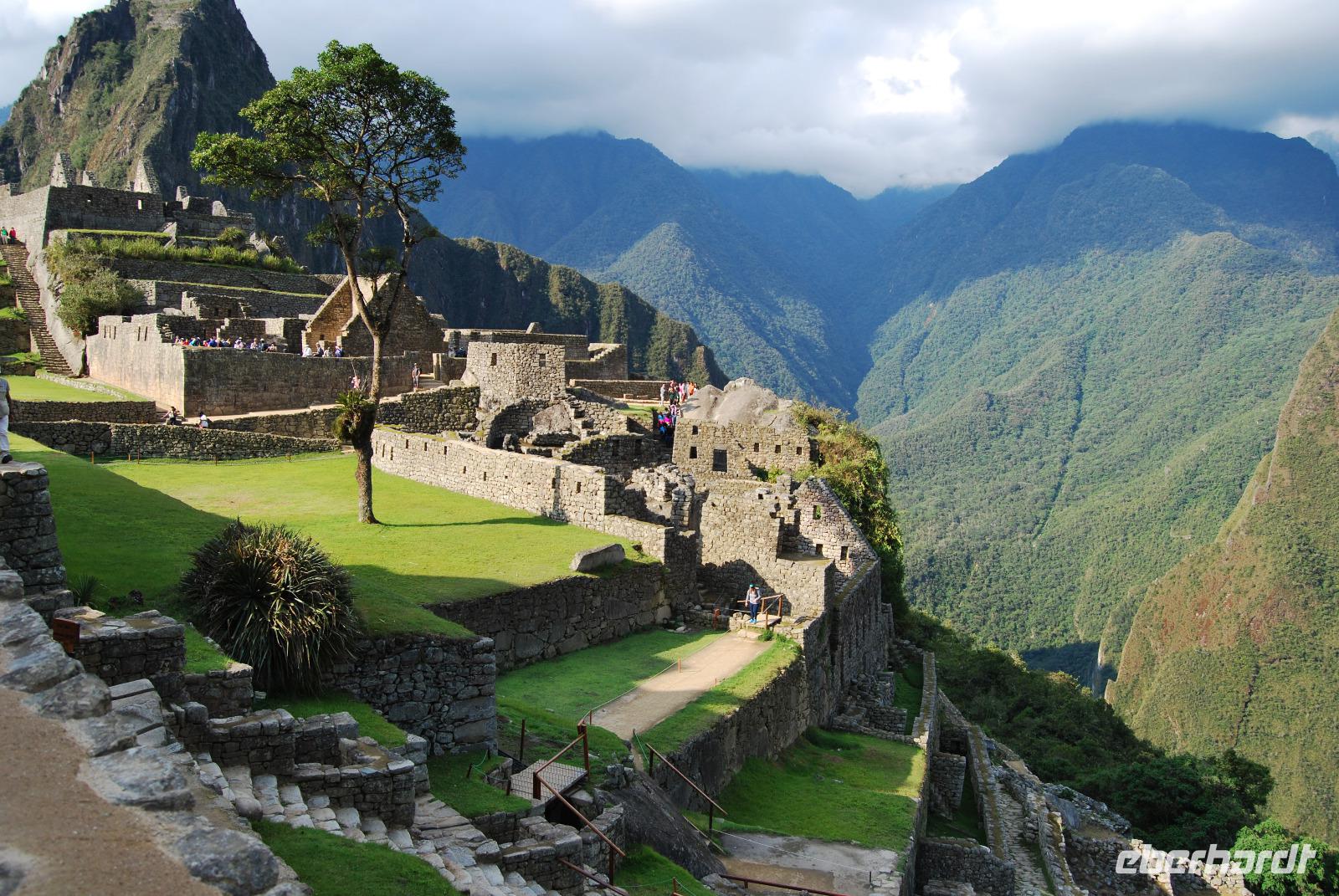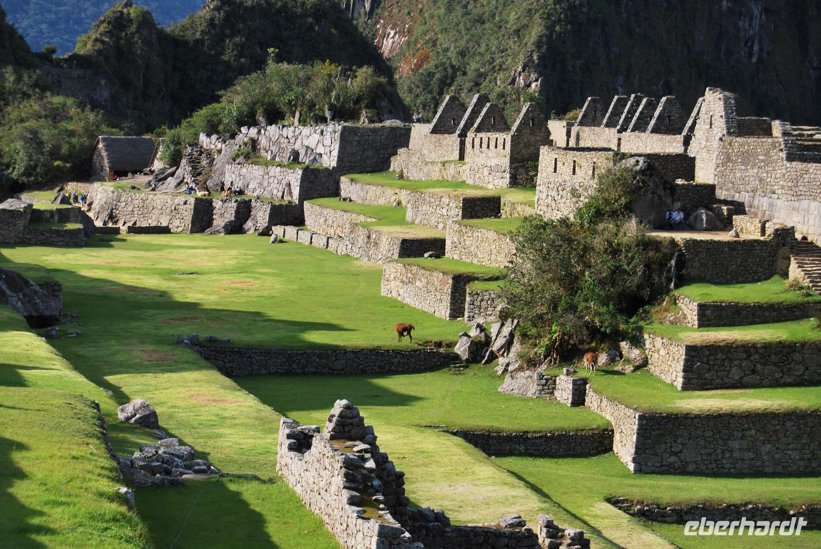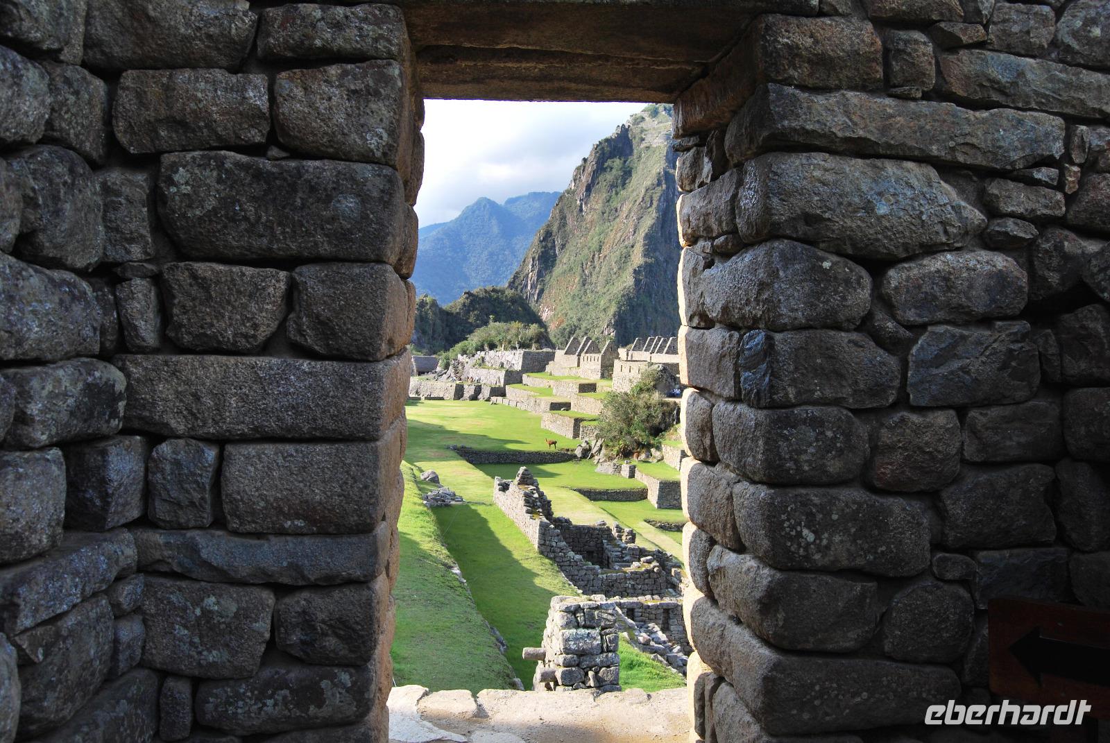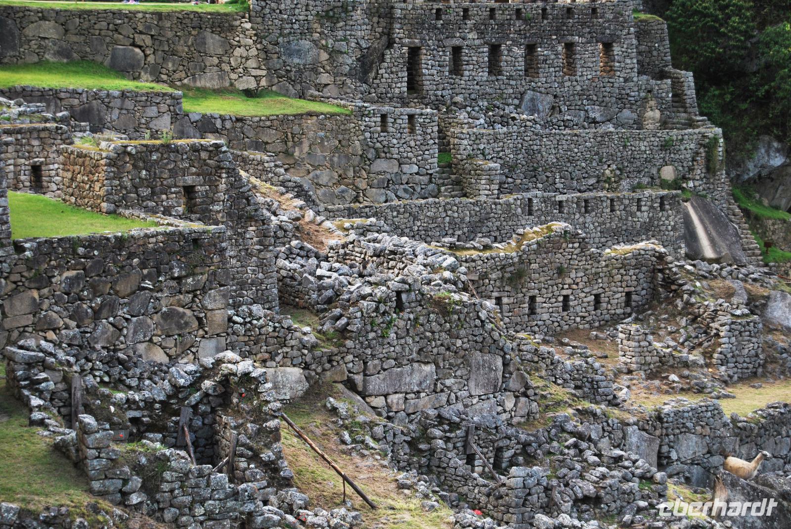 So! Nun konnte es endlich losgehen, der Augenblick war gekommen. Wir gingen durch das Eingangsportal, einen leichten Bogen, begleitet von einem gewaltigen Bergpanorama auf der rechten Seite. Zur Linken, ein relativ steiles Dickicht, was wir noch überwinden mussten. Zuerst sahen wir ein paar Lagerhäuser der Inkas, mit Stroh bedeckt. Dann mussten wir uns noch ein paar Höhenmeter nach oben kämpfen und dann war es endlich da! Eine langvergessene und gut erhaltene Ruinen-Stadt, die die Spanier nie gefunden hatten und die erst im Jahre 1911 wieder so richtig auftauchte. Die inzwischen wohl berühmteste und meistbesuchte Inka-Stadt wurde laut der Chronisten um 1450 auf Befehl des damaligen Herrschers Pachacútec Yupanqui errichtet. Die Stadt umfasst Hunderte steinerne Bauten, zahlreiche Terrassen, die die Inkas für die Landwirtschaft nutzten und auch als Berg-Befestigung, sowie Tausende und Abertausende von Stufen! Wunderbar gelegen zwischen den beiden Berggipfeln Huayna Picchu und den gleichnamigen Machu Picchu. Die Besichtigung der Anlage machte großen Spaß und ließ die Anstrengung der Höhe und der Treppenstufen fast vergessen. Jorge erläuterte uns wie gewohnte zahlreiche Dinge zur Lebensweise, Bauart und Kultur der Inkas. Eindrucksvoll auch die zahlreichen Tempel die dort zu finden sind. Was mich besonders fasziniert ist der Sonnentempel. Denn in ihm kommt es immer zur Sonnenwende zu einem besonderen Ereignis. Der Tempel wurde so ausgerichtet, dass am Tage der Sonnenwende das Licht der aufgehenden Sonne entweder über einen Bergkamm (Wintersonne) oder durch das Kilometer entfernte Sonnentor (Sommersonne) scheint und direkt durch eine Öffnung in den Tempel strahlt. Durch dieses besondere Ereignis, wussten die Inkas hervorragend ihre Landwirtschaft zu nutzen. In der Kultur der Inkas war es aber auch üblich dem Gott der Sonne - Inti oder auch der Muttererde - Pachamama etwas zu opfern. So geht zum Beispiel auch der erste Schluck Wasser den man trinkt oder das erste Stück Brot zur Pachamama. Den Sonnengott Inti zu huldigen war da nicht ganz so leicht. Die Inkas haben immer die kostbarsten Dinge ihren Göttern gegeben - so waren Opfer von Tieren keine Seltenheit. Aber das Jahr war lang und so opferte man zu bestimmten Feiertagen auch Menschen. Und was war wohl kostbarer als eine Jungfrau aus der Stadt, die Schönste die man Inti bieten konnte? Ja, war dies einst wirklich geschehen? Es ist in der heutigen Zeit kaum vorstellbar - jedoch sind die zahlreichen Opfersteine eindrucksvoll. Meisterlich hat man den Fels bearbeitet. Riesige Steine von Tempelanlagen über Terrassen, mehrere Tonnen schwer wurden sie filigran behauen, geschliffen und auf ein Zehntel genau bewegt.
