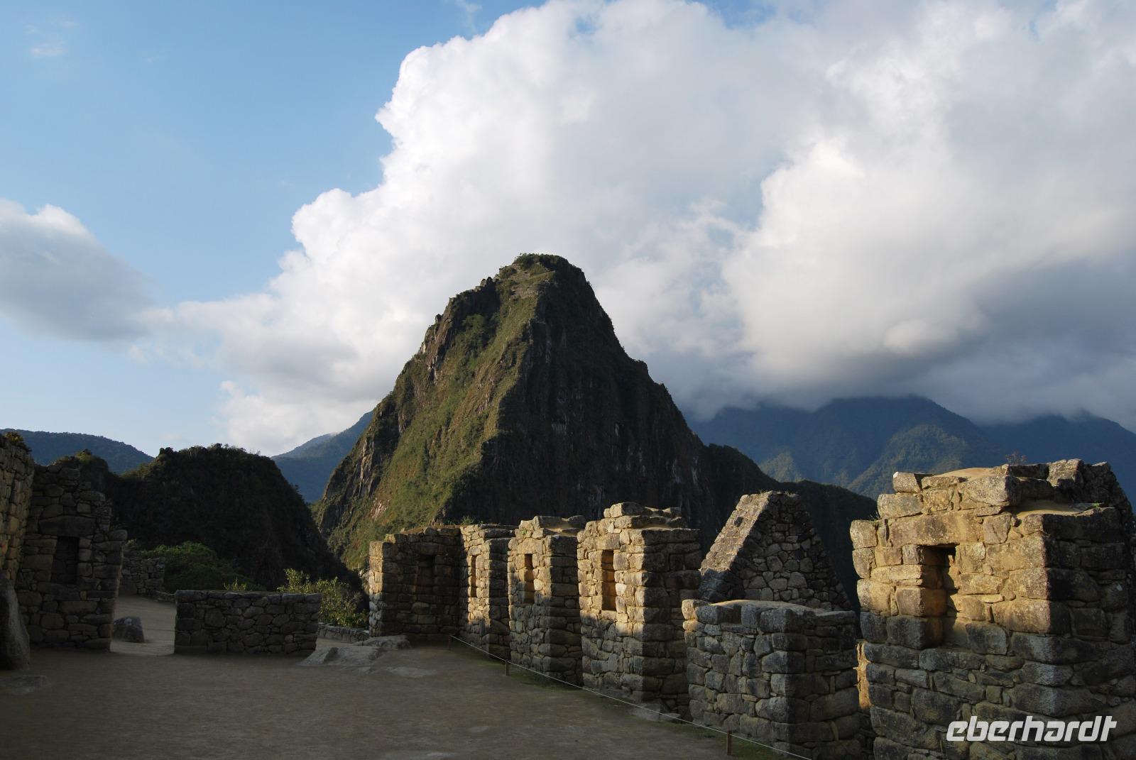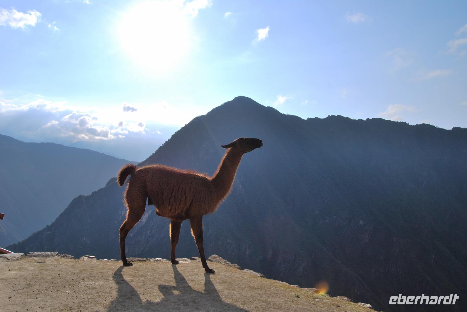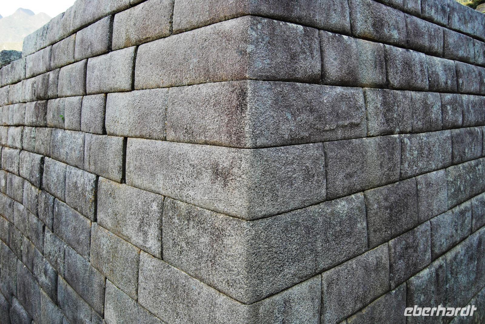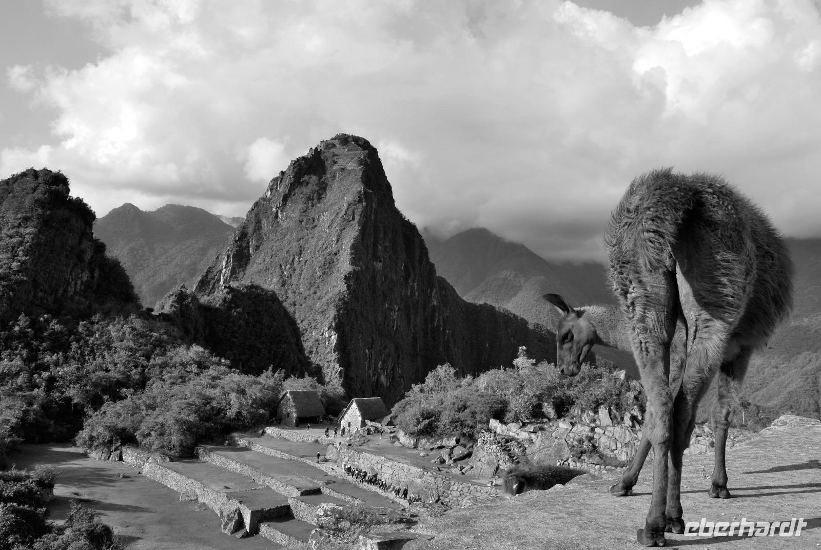 So! Nun konnte es endlich losgehen, der Augenblick war gekommen. Wir gingen durch das Eingangsportal, einen leichten Bogen, begleitet von einem gewaltigen Bergpanorama auf der rechten Seite. Zur Linken, ein relativ steiles Dickicht, was wir noch überwinden mussten. Zuerst sahen wir ein paar Lagerhäuser der Inkas, mit Stroh bedeckt. Dann mussten wir uns noch ein paar Höhenmeter nach oben kämpfen und dann war es endlich da! Eine langvergessene und gut erhaltene Ruinen-Stadt, die die Spanier nie gefunden hatten und die erst im Jahre 1911 wieder so richtig auftauchte. Die inzwischen wohl berühmteste und meistbesuchte Inka-Stadt wurde laut der Chronisten um 1450 auf Befehl des damaligen Herrschers Pachacútec Yupanqui errichtet. Die Stadt umfasst Hunderte steinerne Bauten, zahlreiche Terrassen, die die Inkas für die Landwirtschaft nutzten und auch als Berg-Befestigung, sowie Tausende und Abertausende von Stufen! Wunderbar gelegen zwischen den beiden Berggipfeln Huayna Picchu und den gleichnamigen Machu Picchu. Die Besichtigung der Anlage machte großen Spaß und ließ die Anstrengung der Höhe und der Treppenstufen fast vergessen. Jorge erläuterte uns wie gewohnte zahlreiche Dinge zur Lebensweise, Bauart und Kultur der Inkas. Eindrucksvoll auch die zahlreichen Tempel die dort zu finden sind. Was mich besonders fasziniert ist der Sonnentempel. Denn in ihm kommt es immer zur Sonnenwende zu einem besonderen Ereignis. Der Tempel wurde so ausgerichtet, dass am Tage der Sonnenwende das Licht der aufgehenden Sonne entweder über einen Bergkamm (Wintersonne) oder durch das Kilometer entfernte Sonnentor (Sommersonne) scheint und direkt durch eine Öffnung in den Tempel strahlt. Durch dieses besondere Ereignis, wussten die Inkas hervorragend ihre Landwirtschaft zu nutzen. In der Kultur der Inkas war es aber auch üblich dem Gott der Sonne - Inti oder auch der Muttererde - Pachamama etwas zu opfern. So geht zum Beispiel auch der erste Schluck Wasser den man trinkt oder das erste Stück Brot zur Pachamama. Den Sonnengott Inti zu huldigen war da nicht ganz so leicht. Die Inkas haben immer die kostbarsten Dinge ihren Göttern gegeben - so waren Opfer von Tieren keine Seltenheit. Aber das Jahr war lang und so opferte man zu bestimmten Feiertagen auch Menschen. Und was war wohl kostbarer als eine Jungfrau aus der Stadt, die Schönste die man Inti bieten konnte? Ja, war dies einst wirklich geschehen? Es ist in der heutigen Zeit kaum vorstellbar - jedoch sind die zahlreichen Opfersteine eindrucksvoll. Meisterlich hat man den Fels bearbeitet. Riesige Steine von Tempelanlagen über Terrassen, mehrere Tonnen schwer wurden sie filigran behauen, geschliffen und auf ein Zehntel genau bewegt.