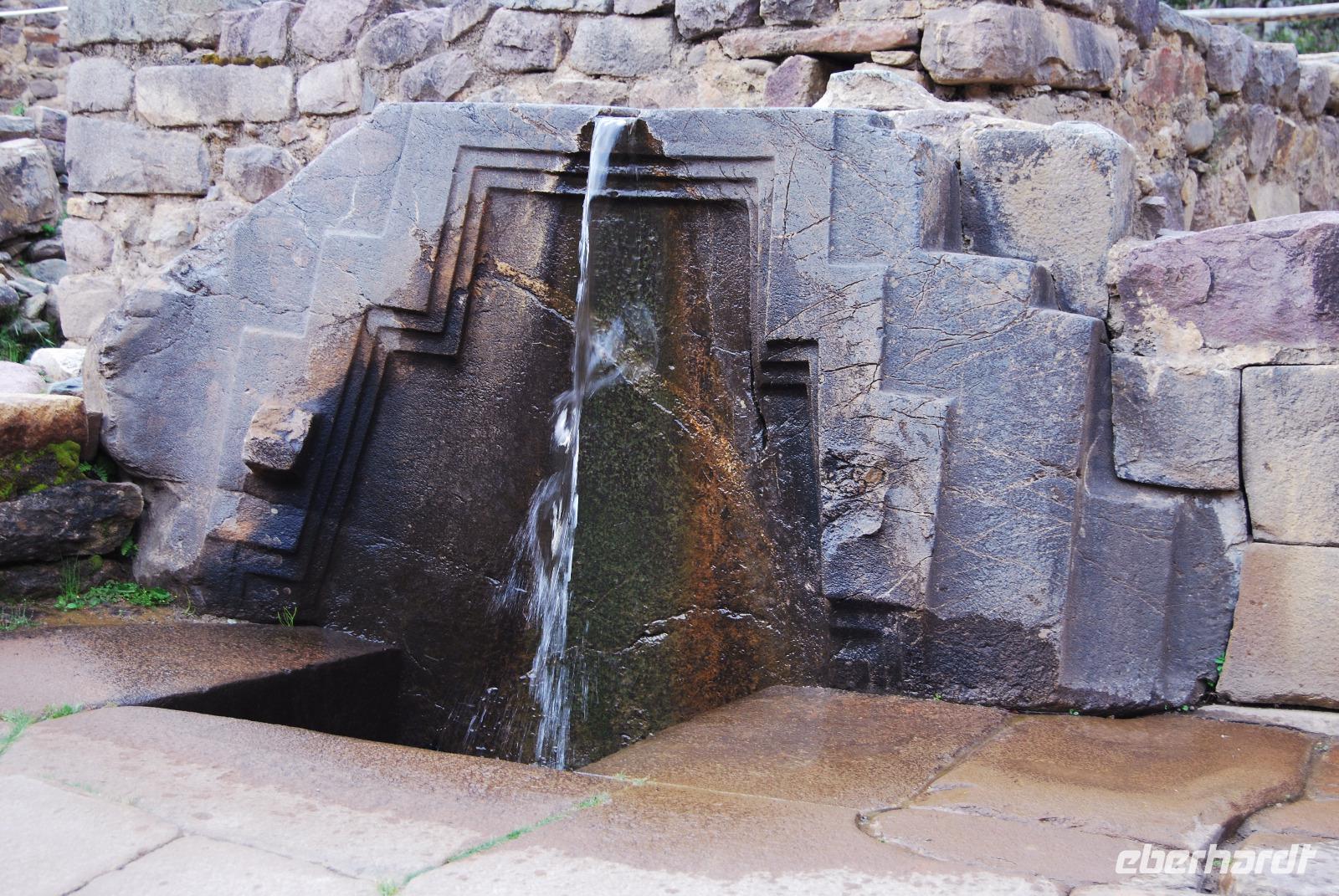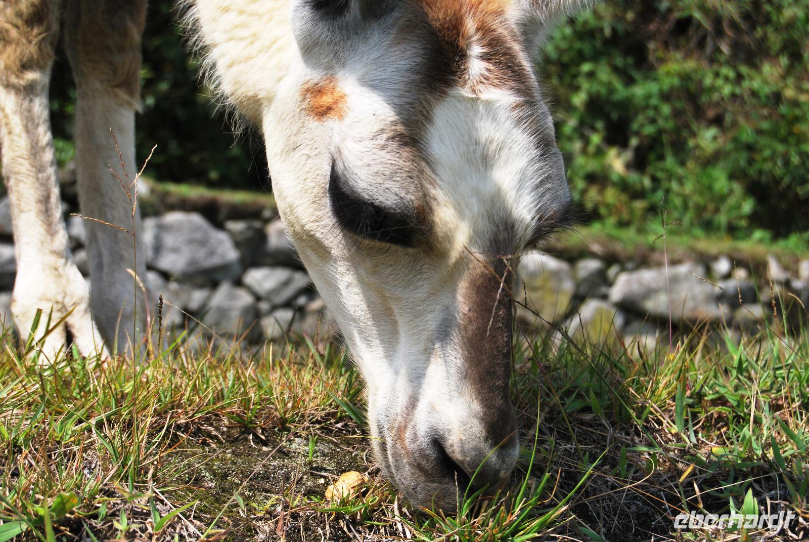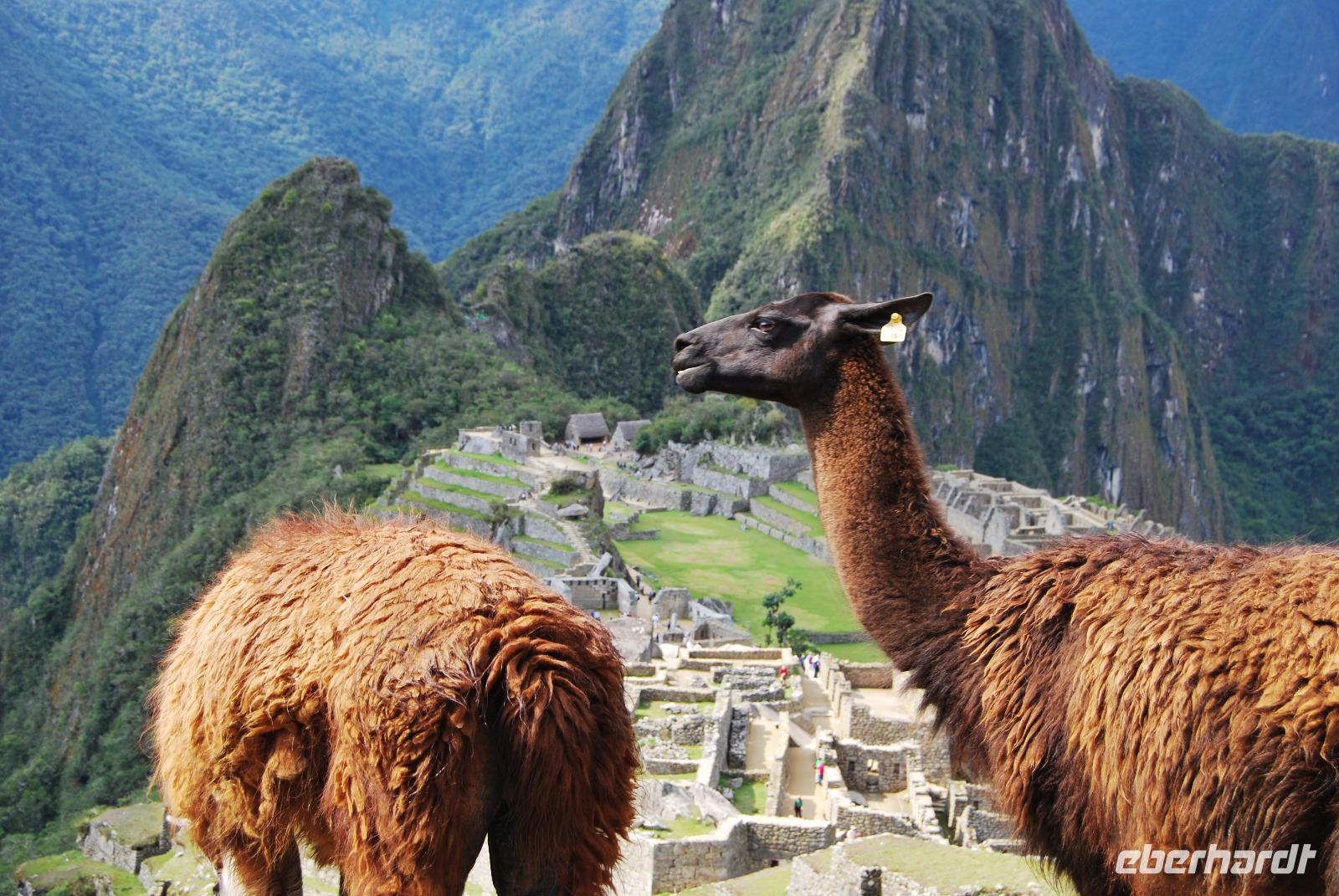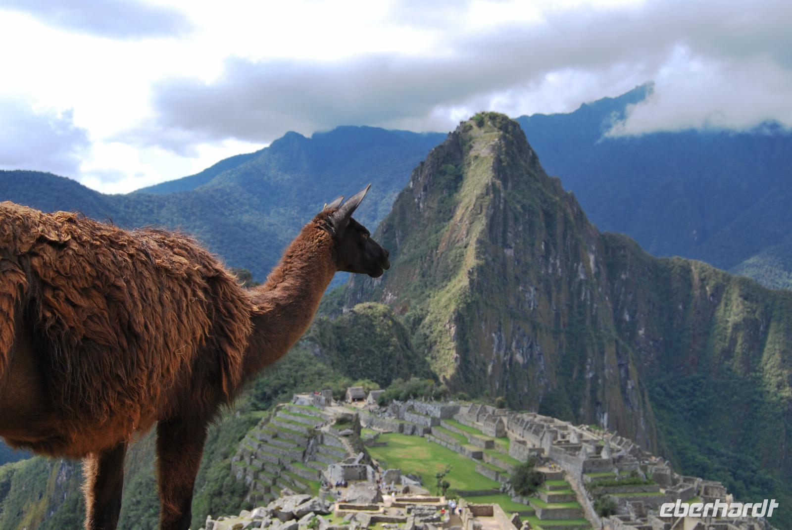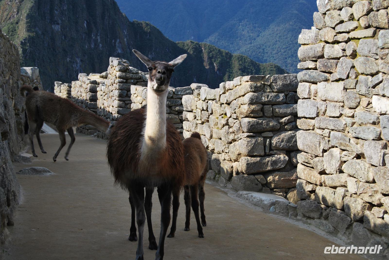 So! Nun konnte es endlich losgehen, der Augenblick war gekommen. Wir gingen durch das Eingangsportal, einen leichten Bogen, begleitet von einem gewaltigen Bergpanorama auf der rechten Seite. Zur Linken, ein relativ steiles Dickicht, was wir noch überwinden mussten. Zuerst sahen wir ein paar Lagerhäuser der Inkas, mit Stroh bedeckt. Dann mussten wir uns noch ein paar Höhenmeter nach oben kämpfen und dann war es endlich da! Eine langvergessene und gut erhaltene Ruinen-Stadt, die die Spanier nie gefunden hatten und die erst im Jahre 1911 wieder so richtig auftauchte. Die inzwischen wohl berühmteste und meistbesuchte Inka-Stadt wurde laut der Chronisten um 1450 auf Befehl des damaligen Herrschers Pachacútec Yupanqui errichtet. Die Stadt umfasst Hunderte steinerne Bauten, zahlreiche Terrassen, die die Inkas für die Landwirtschaft nutzten und auch als Berg-Befestigung, sowie Tausende und Abertausende von Stufen! Wunderbar gelegen zwischen den beiden Berggipfeln Huayna Picchu und den gleichnamigen Machu Picchu. Die Besichtigung der Anlage machte großen Spaß und ließ die Anstrengung der Höhe und der Treppenstufen fast vergessen. Jorge erläuterte uns wie gewohnte zahlreiche Dinge zur Lebensweise, Bauart und Kultur der Inkas. Eindrucksvoll auch die zahlreichen Tempel die dort zu finden sind. Was mich besonders fasziniert ist der Sonnentempel. Denn in ihm kommt es immer zur Sonnenwende zu einem besonderen Ereignis. Der Tempel wurde so ausgerichtet, dass am Tage der Sonnenwende das Licht der aufgehenden Sonne entweder über einen Bergkamm (Wintersonne) oder durch das Kilometer entfernte Sonnentor (Sommersonne) scheint und direkt durch eine Öffnung in den Tempel strahlt. Durch dieses besondere Ereignis, wussten die Inkas hervorragend ihre Landwirtschaft zu nutzen. In der Kultur der Inkas war es aber auch üblich dem Gott der Sonne - Inti oder auch der Muttererde - Pachamama etwas zu opfern. So geht zum Beispiel auch der erste Schluck Wasser den man trinkt oder das erste Stück Brot zur Pachamama. Den Sonnengott Inti zu huldigen war da nicht ganz so leicht. Die Inkas haben immer die kostbarsten Dinge ihren Göttern gegeben - so waren Opfer von Tieren keine Seltenheit. Aber das Jahr war lang und so opferte man zu bestimmten Feiertagen auch Menschen. Und was war wohl kostbarer als eine Jungfrau aus der Stadt, die Schönste die man Inti bieten konnte? Ja, war dies einst wirklich geschehen? Es ist in der heutigen Zeit kaum vorstellbar - jedoch sind die zahlreichen Opfersteine eindrucksvoll. Meisterlich hat man den Fels bearbeitet. Riesige Steine von Tempelanlagen über Terrassen, mehrere Tonnen schwer wurden sie filigran behauen, geschliffen und auf ein Zehntel genau bewegt.