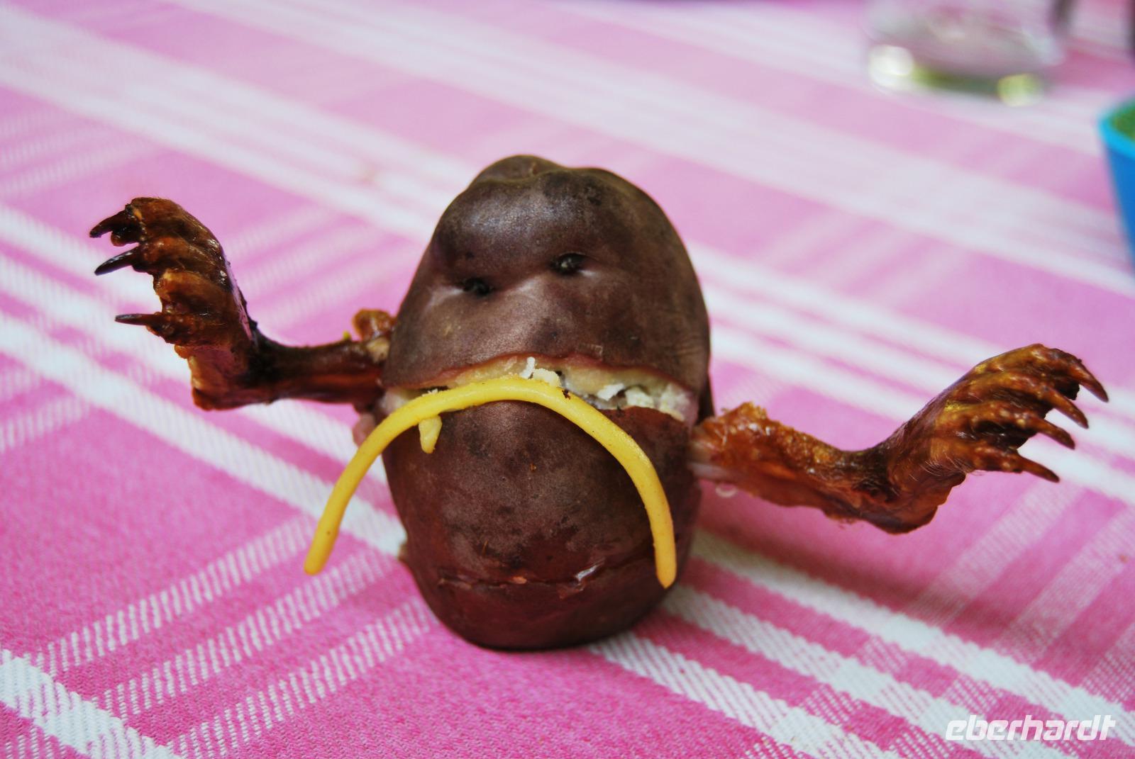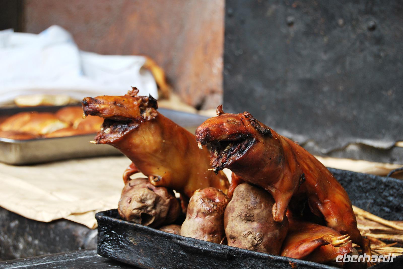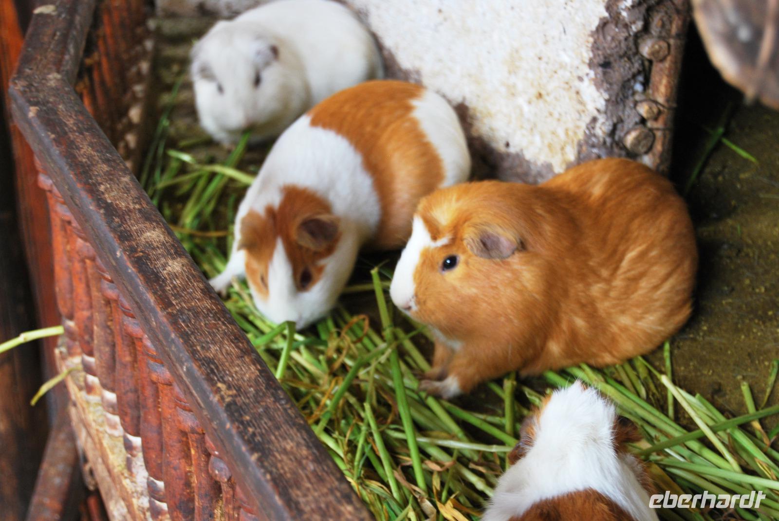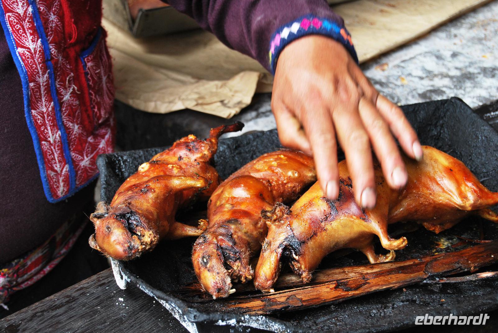 Als letzten Tagespunkt hatten wir heute noch eine weitere Inkaanlage im Programm - Ollantaytambo. Auf dem Weg dorthin mussten wir noch fast 60 Kilometer im heiligen Tal fahren, immer am Fluss Urubamaba entlang. Nur wenige Ortschaften von Pisac entfernt, jede Ortschaft hält hier ihre Spezialitäten bereit, hielten wir in Lamay. Diese Ortschaft war auf Meerscheinwein spezialisiert. So kehrten wir in das Restaurant Cuyeria Into ein, dessen Name so viel wie Meerschweinchen-Sonne bedeutet. Am Eingang begrüßte uns auch gleich eine fröhlich lachende Meerschweinchen-Skulptur. Anfangs waren alle schon etwas skeptisch. Meerschweinchen, so frisch gebacken, sieht es schon ein wenig gruselig aus und ist ja auch nicht gerade typisch für uns Europäer, die diese Tiere wohl lieber als Haustiere haben als auf der Speisekarte. Aber dennoch, nachdem alle Ängste und Skepsis überwunden war schmeckte es doch tatsächlich. Und jede Menge Spaß hatten wir auch noch dabei, als plötzlich das Kartoffel-Monster auf dem Tisch stand...