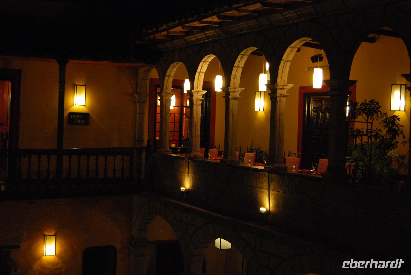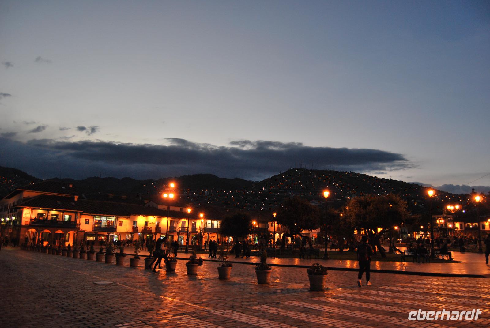 Nach dem Abendessen im naheliegenden Restaurant spazierten wir noch an der Hauptplaza in Cusco vorbei und kraxelten die steile Pflasterstraße zum Künstlerviertel San Blas hinauf, wo wir uns ein Abschluss-Getränk gönnten.
