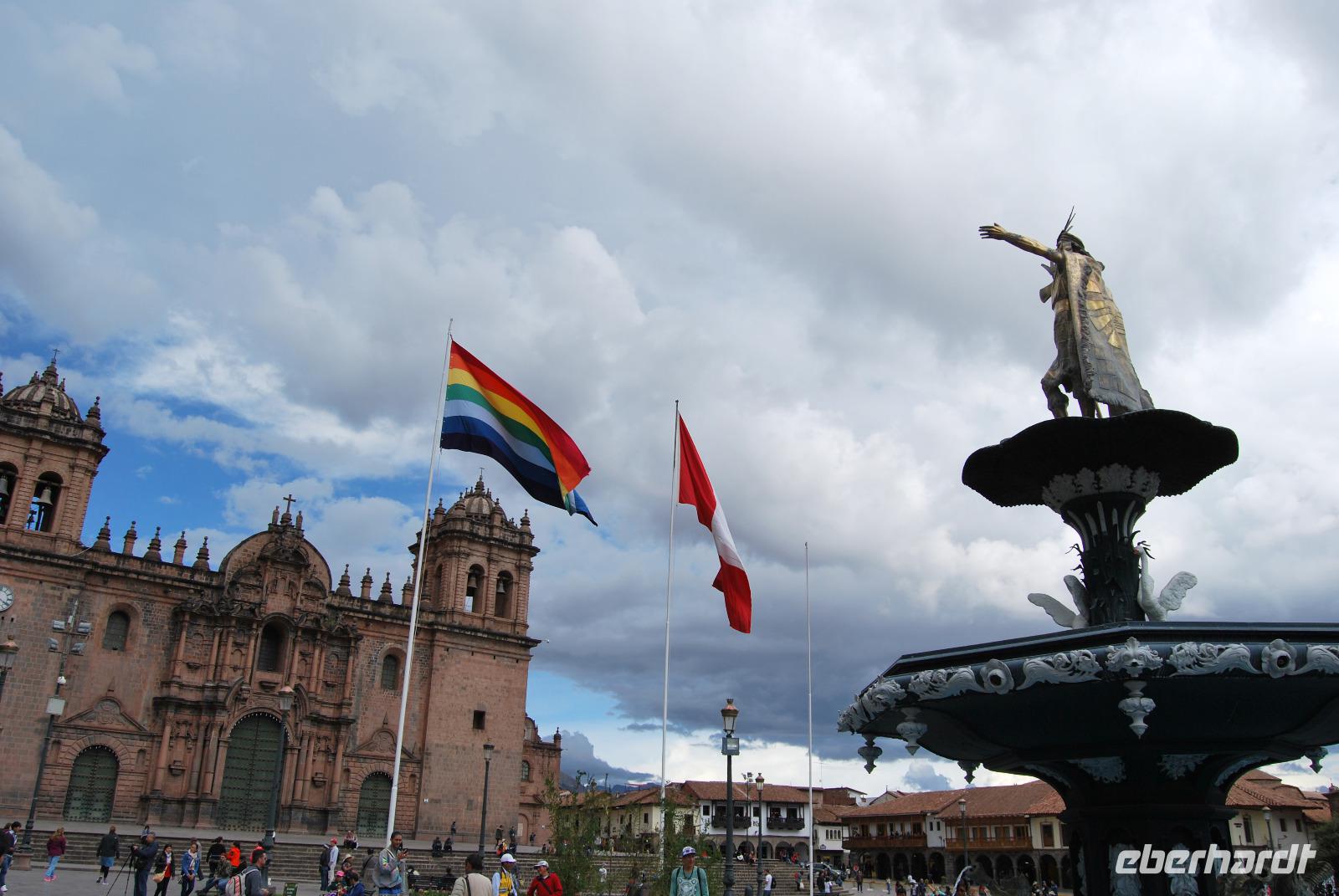 Mit Rául ging es dann erst einmal in unser Hotel, welches einen wunderbaren, glasüberdachten Innenhof hat, um das Gepäck zu verstauen. Auf dem Weg dorthin konnte man schon die eindrucksvollen historischen Gebäude bestaunen. Immer wieder sieht man Denkmäler und Fresken die an die Zeit der Inkas erinnern sowie alte Mauern, wo später die Spanier ihre Bauwerke im Kolonialstil aufsetzten. Als wir das Hotel über die schmalen Kopfsteinpflaster erreicht hatten, kam wenig später unser örtlicher Reiseleiter Jorge hinzu. Wir gingen in ein nahegelegenes Restaurant um uns zu stärken. Eine der köstlichen peruanischen Suppen stand auf dem Speiseplan sowie ein saftiges Lama-Steak. Frisch gestärkt ging es eine Straße weiter auf den Hauptplatz der historischen Altstadt, oder auch Plaza de Armas genannt - Waffenplatz, wie viele der wichtigsten Plätze in Südamerika genannt werden. In der Mitte, ein wunderschöner Brunnen mit einer goldenen Statue eines Priesters. Die linke Hand nach oben gerichtet und das Haupt erhoben. Mit dem Symbol der Sonne auf der Brust und an seiner Kopfbedeckung. Daran drei goldene Federn. Die Zahl drei - auf die wir noch oft treffen werden.