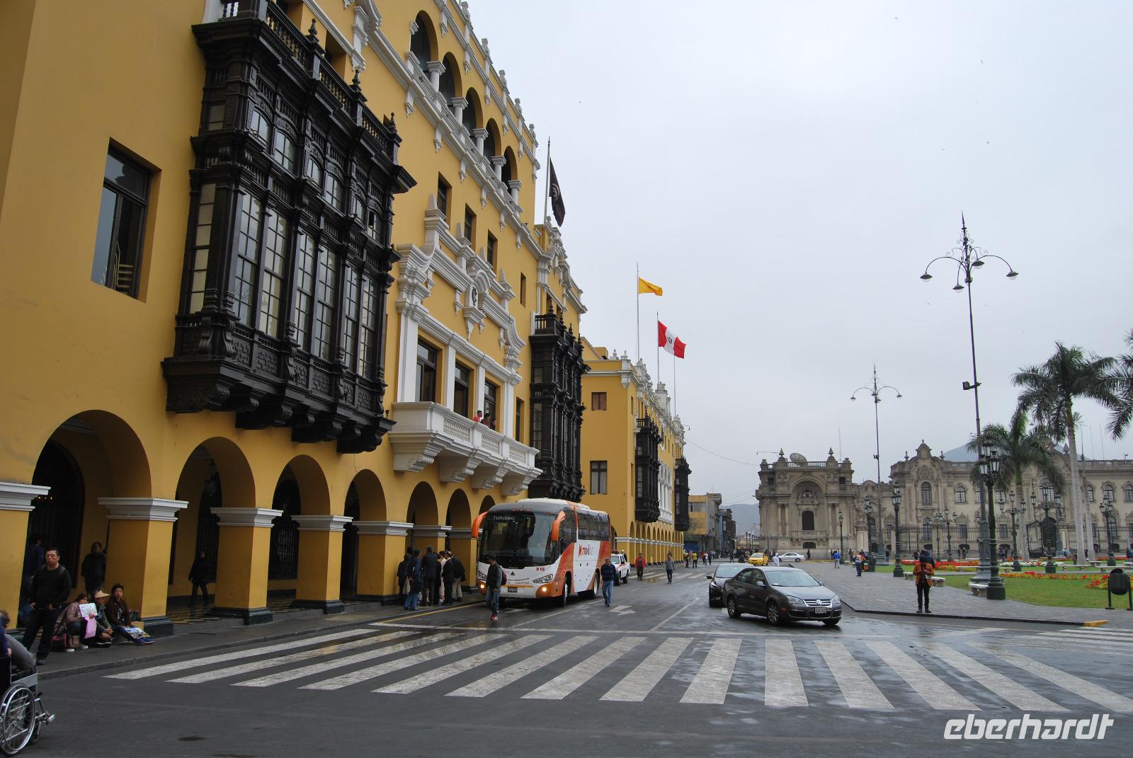 Unser erster Tag in Südamerika. Unser Hotel liegt in der peruanischen Hauptstadt Lima, im Stadtteil San Isidro. Nicht weit davon hat sich auch der aktuelle Präsident niedergelassen. Deshalb wurden wir gleich am Anfang unserer City-Tour von einer kleinen Polizei-Kolonne und schwarzen Vans überrascht. Schnell waren wir aber in der Altstadt von Lima. Dort haben wir erst einmal unsere mitgebrachten Euros und amerikanische Dollar in peruanische Sonnentaler, also Sol, umgetauscht. An dem historischen Hauptlatz angekommen, der Plaza de Armas, bestaunten wir die umliegenden Bauwerke. Wie zum Beispiel die Kathedrale von Lima aus dem frühen 16. Jahrhundert, die Elemente gotischer und neoklassizistischer Architektur bereit hält sowie Teile der Renaissance. Des Weiteren konnten wir den Palast des Erzbischofes sehen, den Regierungspalast von Lima und einige historische Gebäude mit gelber Fassade und dunkelbraunen Holzbalkonen. Im Anschluss gingen wir in die Pasaje Santa Rosa und kamen an der alten Post- und Telegrafenzentrale „Casa de Correos y Telegrafos" vorbei, das heute als „Haus der peruanischen Küche" genutzt wird.
