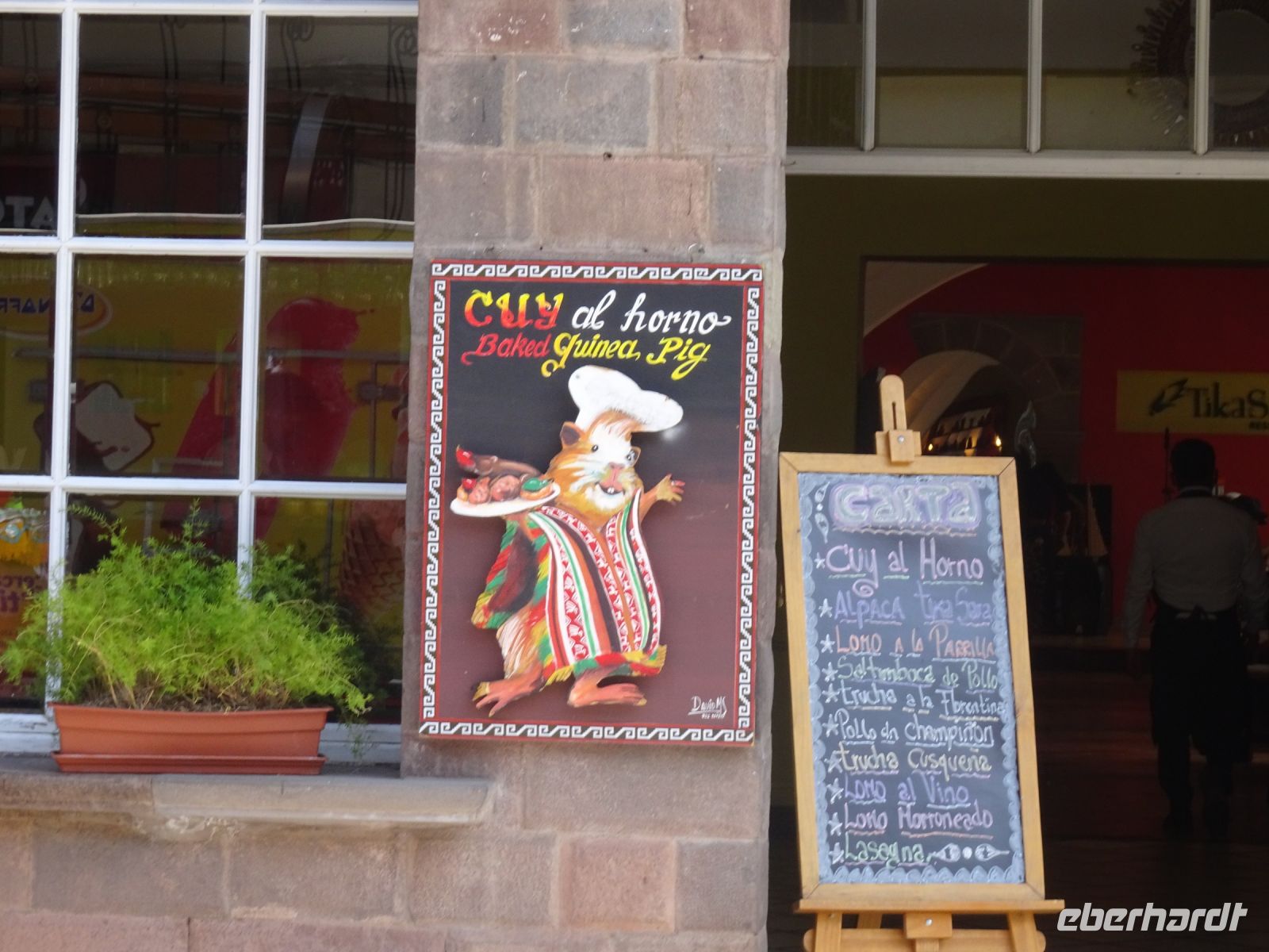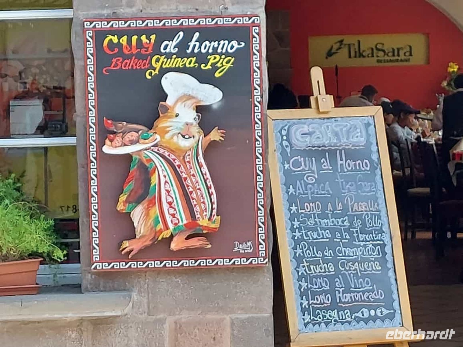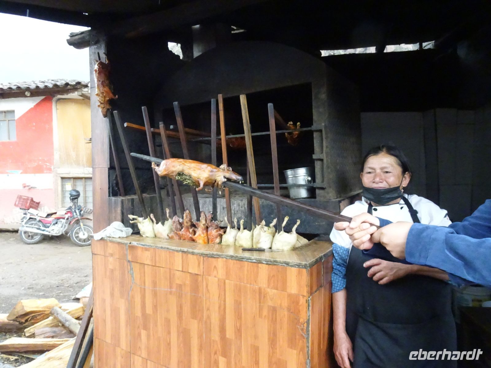 Unseren nächsten Stopp legen wir im Meerschweinchen-Dorf ein. Im Heiligen Tal haben sich die Dörfer auf verschiedene Spezialitäten eingestellt. Nicht in jedem Dorf gibt es alles und hier gibt es eben die Meerschweinchen Restaurants. Da wir nicht speisen, sondern uns nur gruseln und fotografieren wollen, hält Alex an einem Schnellimbiss. Die bei uns beliebten Haustiere braten am Spieß und die Dame des Hauses ist gegen einen kleinen Obulus bereit, uns alles fotografieren zu lassen.