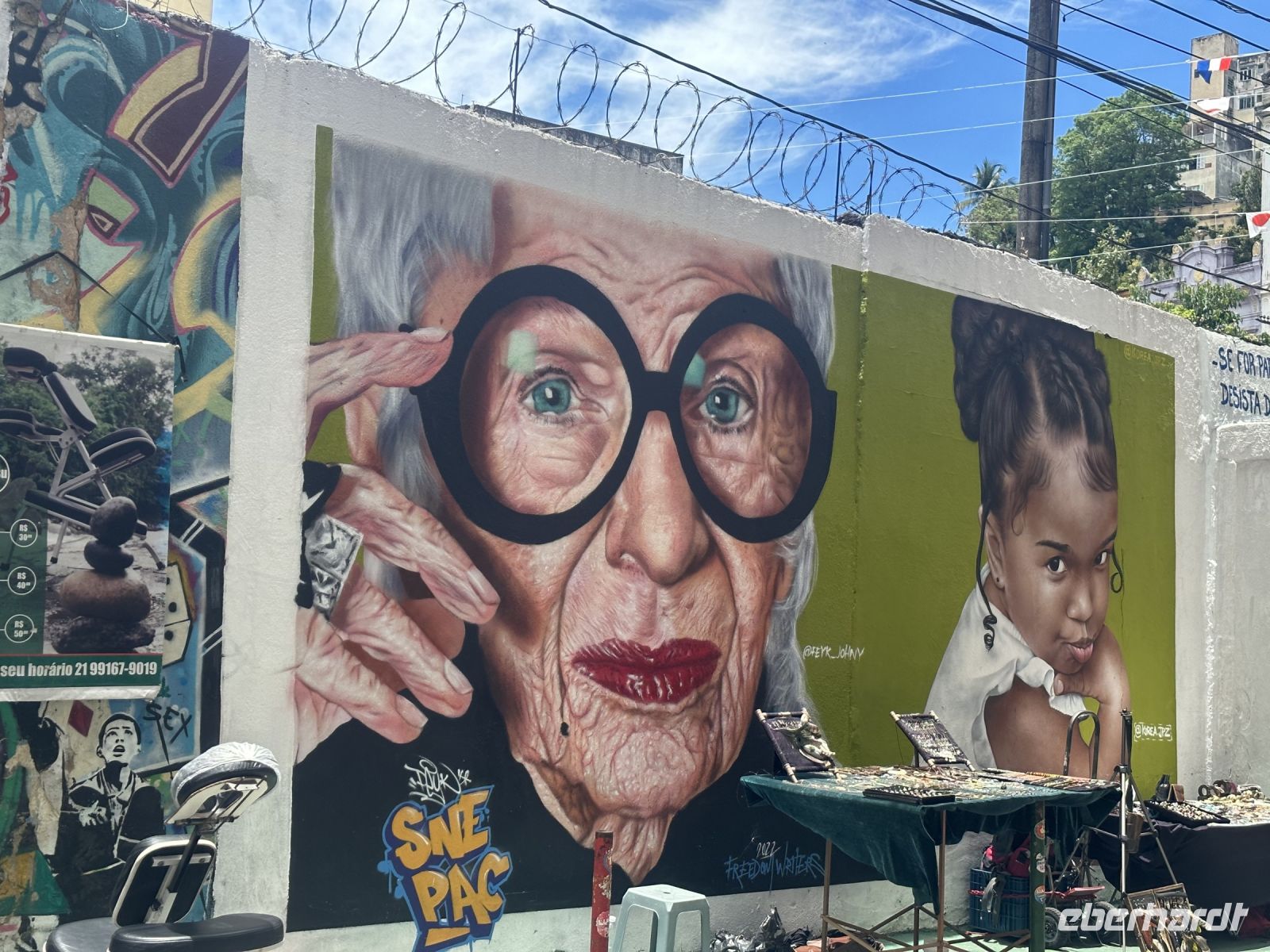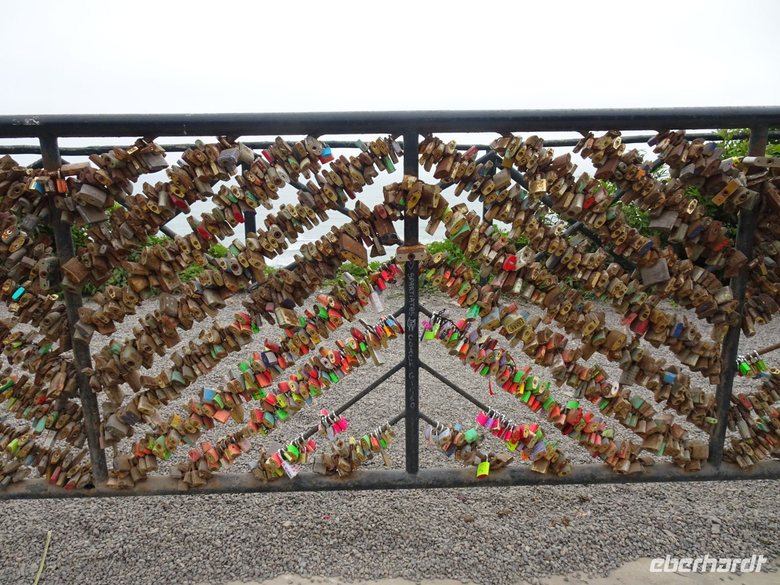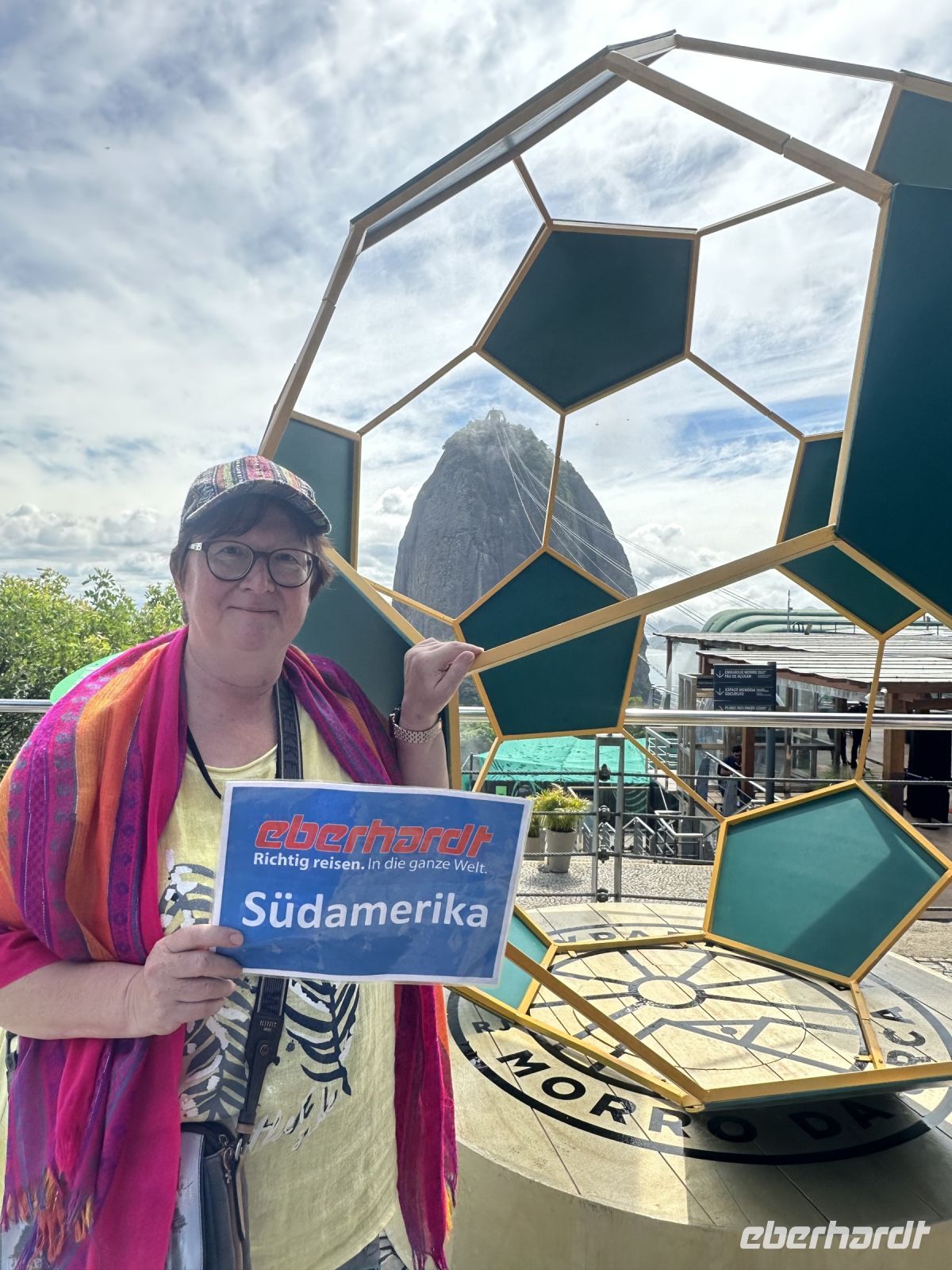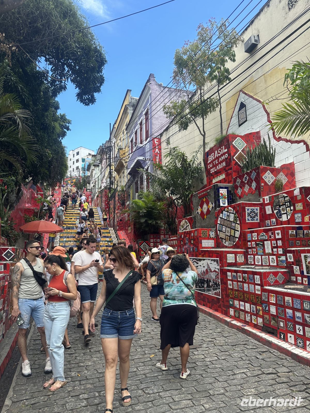 und es ist immer noch nicht vorbei. Ein ganzer Vormittag steht noch zur Verfügung. Mit der Seilbahn, die hier Sugar Loaf Cable Car heißt, fahren wir auf den Zuckerhut. Von hier aus hat man einen tollen Blick auf den Corcovado mit der Christusstatue. Na gut, diesmal trifft es uns: Christus verhüllt sich im Nebel. Das hält uns aber nicht davon ab, die Aussicht auf die Copacabana und andere Strände zu genießen und ein letztes Mal die Souvenirläden zu besuchen. Beim Spaziergang durch den kleinen Dschungelpark auf dem Rückweg begegnet uns noch ein wahrhaft possierliches Weißbüscheläffchen. So klein und so niedlich. Und es hatte mindestens ein Junges dabei. Ein schöner Abschied. Aber es geht noch weiter. Wir besuchen die berühmte Fliesentreppe namens Escadaria Selaron. Escadaria heißt auf Deutsch Treppe und Selaron ist der Name des Künstlers, der sie gestaltet hat. Jorge Selaron musste seine Heimat Chile aus politischen Gründen verlassen und kam deshalb nach Rio de Janeiro. Ganz in der Nähe seines Hauses befand sich eine verwahrloste Treppe. Irgendwann hatte er die Idee, die Stufen der Treppe zu verschönern und er besorgte sich Kacheln und Fliesen, die er entweder kaufte oder von verlassenen Baustellen mitbrachte. Nach und nach sprach sich das herum und er bekam Fliesen geschenkt, viele in den Farben der brasilianischen Flagge in blau, gelb und grün. Später kamen dann Fliesen aus mehr als sechzig Ländern der Welt dazu und die Treppe wurde zu einer bekannten und beliebten Sehenswürdigkeit in Rio. Und so kommt es, dass außer uns, noch viele andere Touristen heute hier sind und es ist richtig voll ist. Trotzdem gelingt das eine oder andere Foto von über zweitausend Fliesen, die die 215 Stufen der 125 Meter langen Treppe zieren.