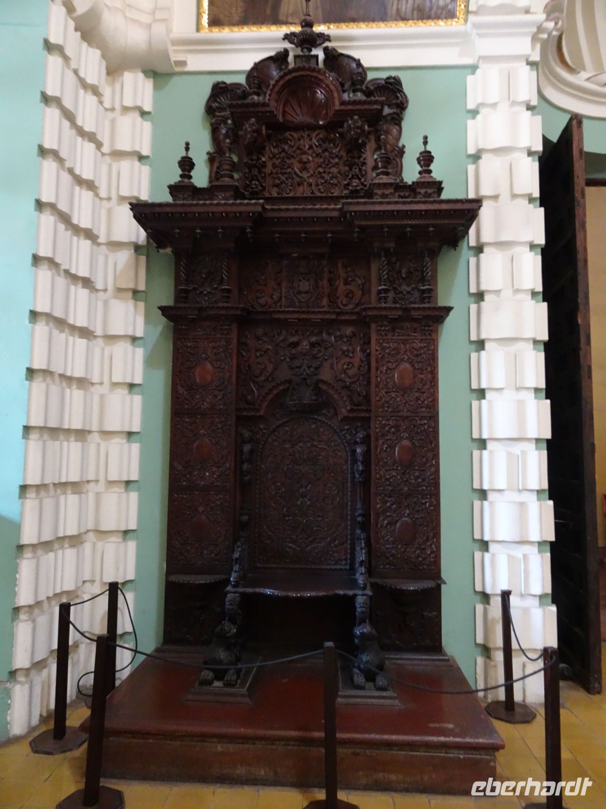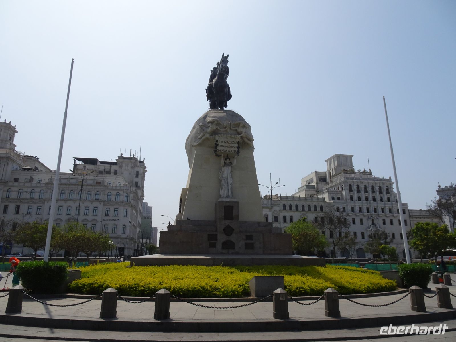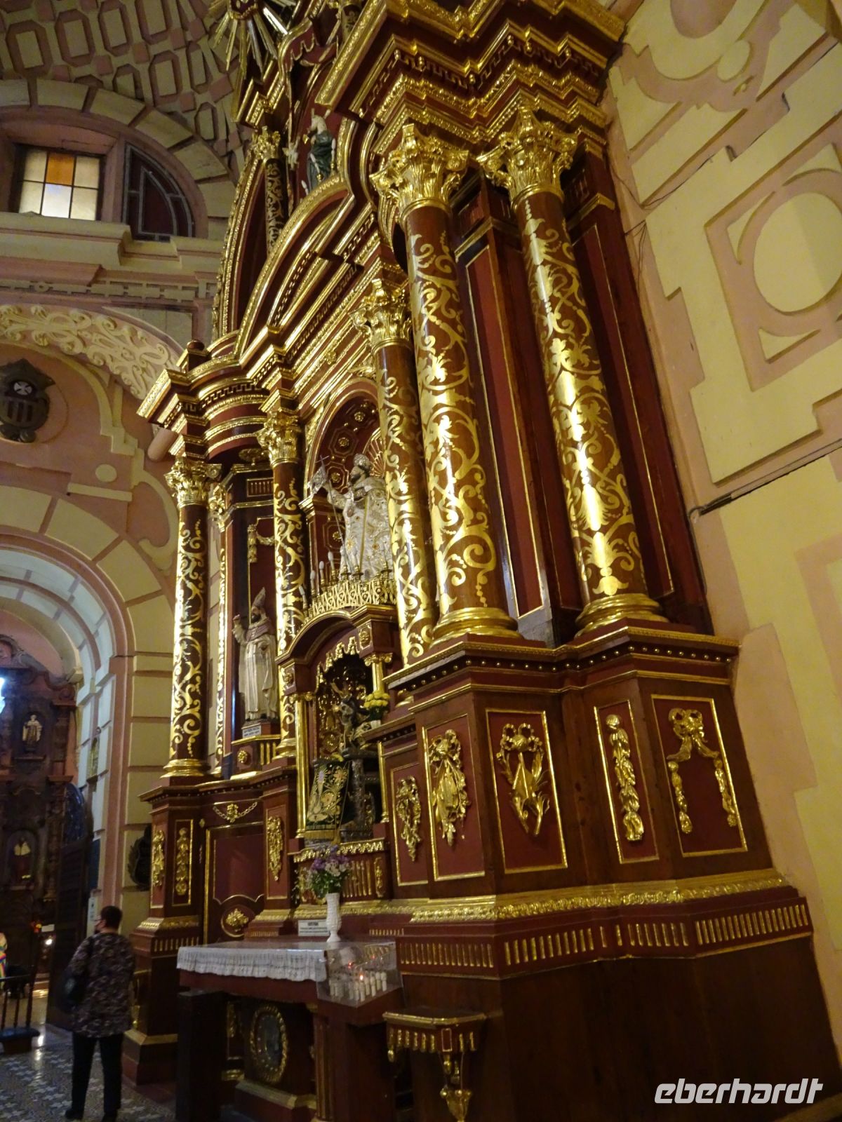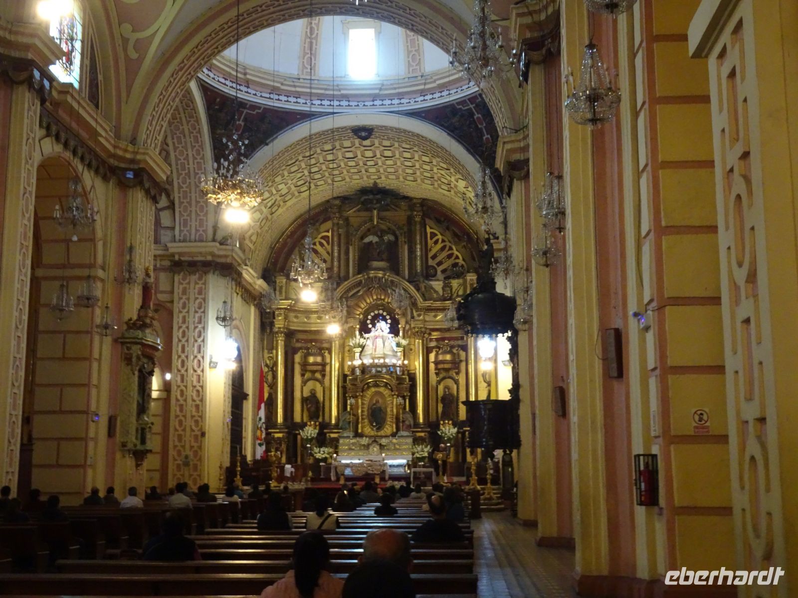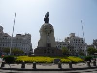 Am Plaza San Martin steigen wir aus und gehen zu Fuß weiter. Unser erstes Ziel ist eine Wechselstube, wo wir uns mit der einheimischen Währung Sol ausstatten. Wir spazieren über den Plaza San Martin, der zu Ehren des Freiheitskämpfers José de San Martin benannt wurde und für den es hier ein Denkmal gibt. Kurios ist die Geschichte um die Tafel, die sich am Denkmal befindet. Statt einer lodernden Flamme trägt die Madre Patria, eine Statue der Petrusmutter am Sockel des Denkmals, ein Lama auf dem Kopf, ein Missverständnis, das bei der Bestellung des Denkmals in Spanien entstand, denn der Begriff llama bedeutet sowohl Flamme als auch Lama. Nun, das Lama ist eben auch ein lateinamerikanisches Symbol und so gibt es hier immer etwas Besonderes zu erzählen. Wir flanieren weiter durch die großzügig angelegten Straßen der Stadt und bewundern die schönen Balkone an den Gebäuden mit wunderschönen barocken und neukolonialen Fassaden. Dazu zählt auch die Prachtfassade der Basilica Nuestra Senora de La Merced, die inzwischen fast fünfhundert Jahre Erdbeben und Brände überstand. Wir nehmen uns Zeit, die Kirche von Innen zu besichtigen. Hier ist es etwas dunkel, was an den riesigen Pfeilern und den wuchtigen Gewölben liegt. Dennoch sind wir vom goldverzierten Altar beeindruckt. Der Bau der Kirche begann 1535, im gleichen Jahr, in dem Lima von Francisco Pizarro gegründet wurde.