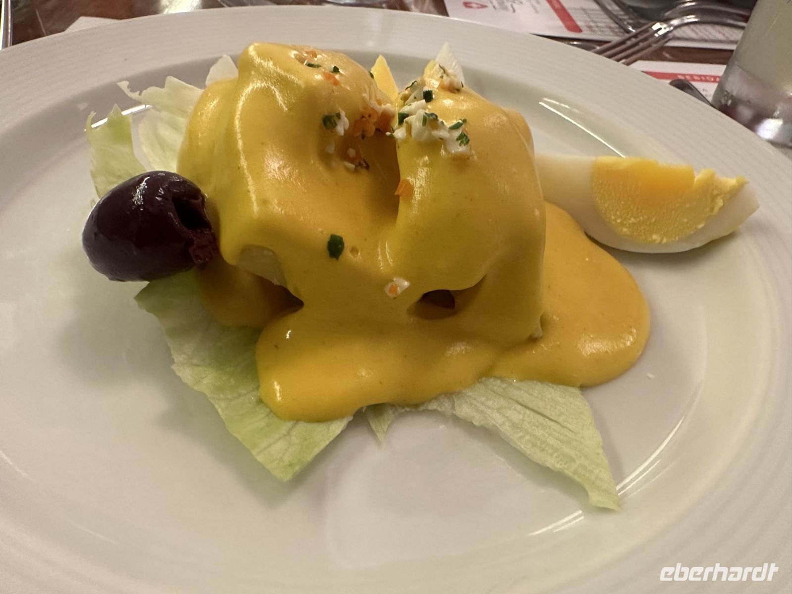 Vorspeise: Papa Huancaina (gekochte Kartoffeln in einer würzigen cremigen Soße - typisch peruanisch) oder Salat