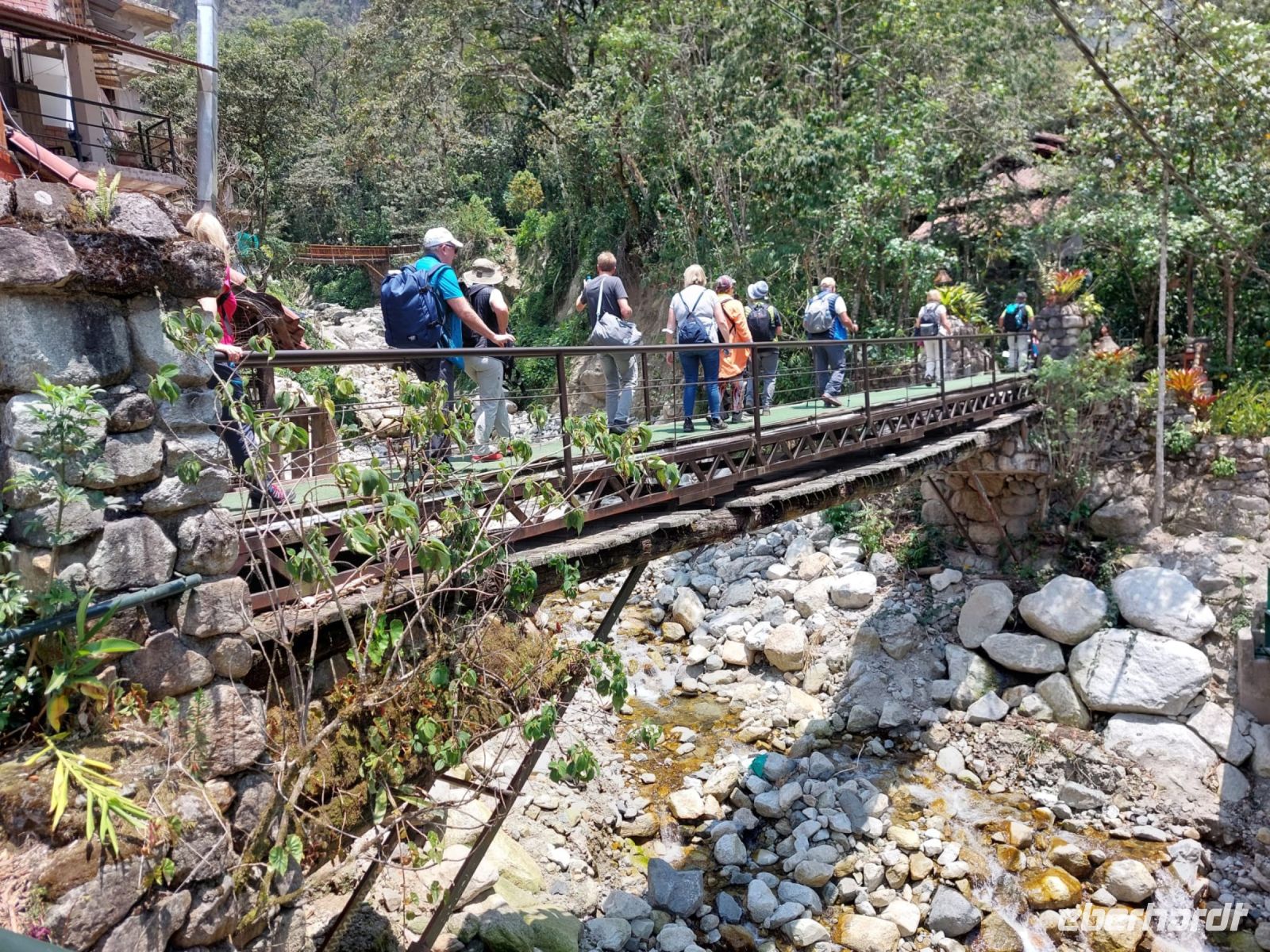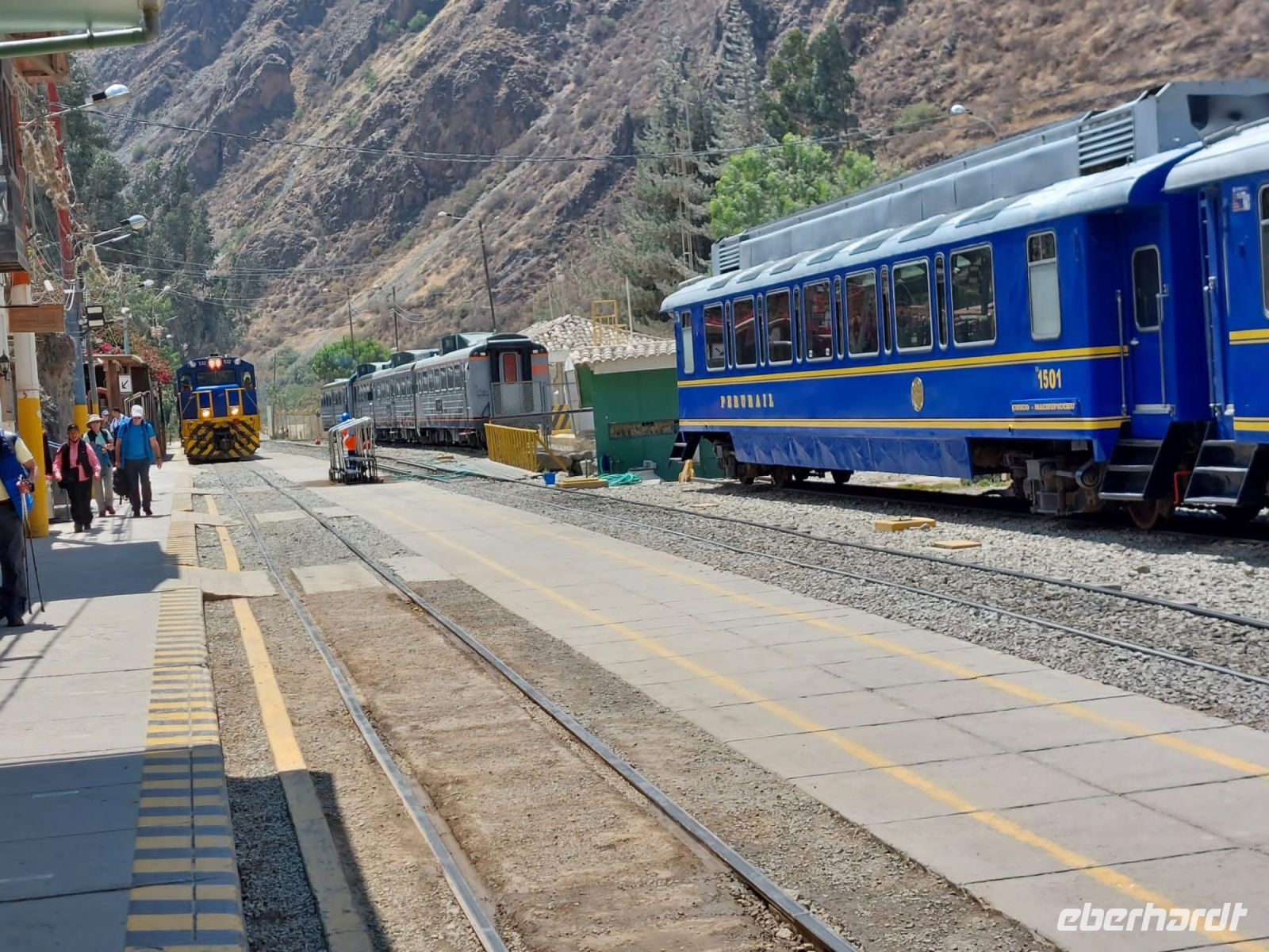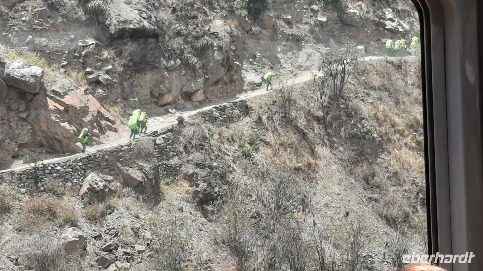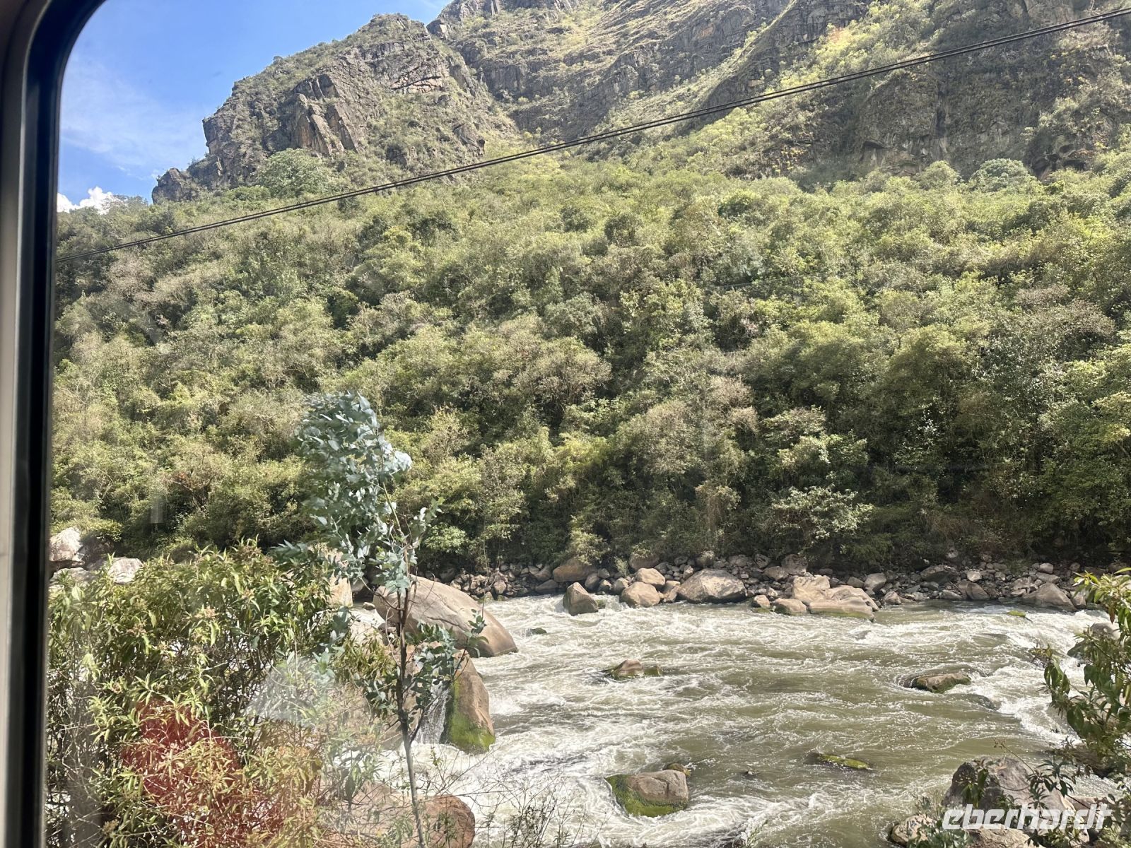 Mit dem Bus fahren wir zum Bahnhof von Ollantaytambo und von hier aus ca. zwei Stunden mit dem Zug nach Aguas Calientes. Die Fahrt führt durch eine spektakuläre Landschaft bis hinunter in den Regenwald. Unterwegs sehen wir Sherpas, die das Gepäck von gut zahlenden Kunden, den Inkatrail hinauf schleppen.