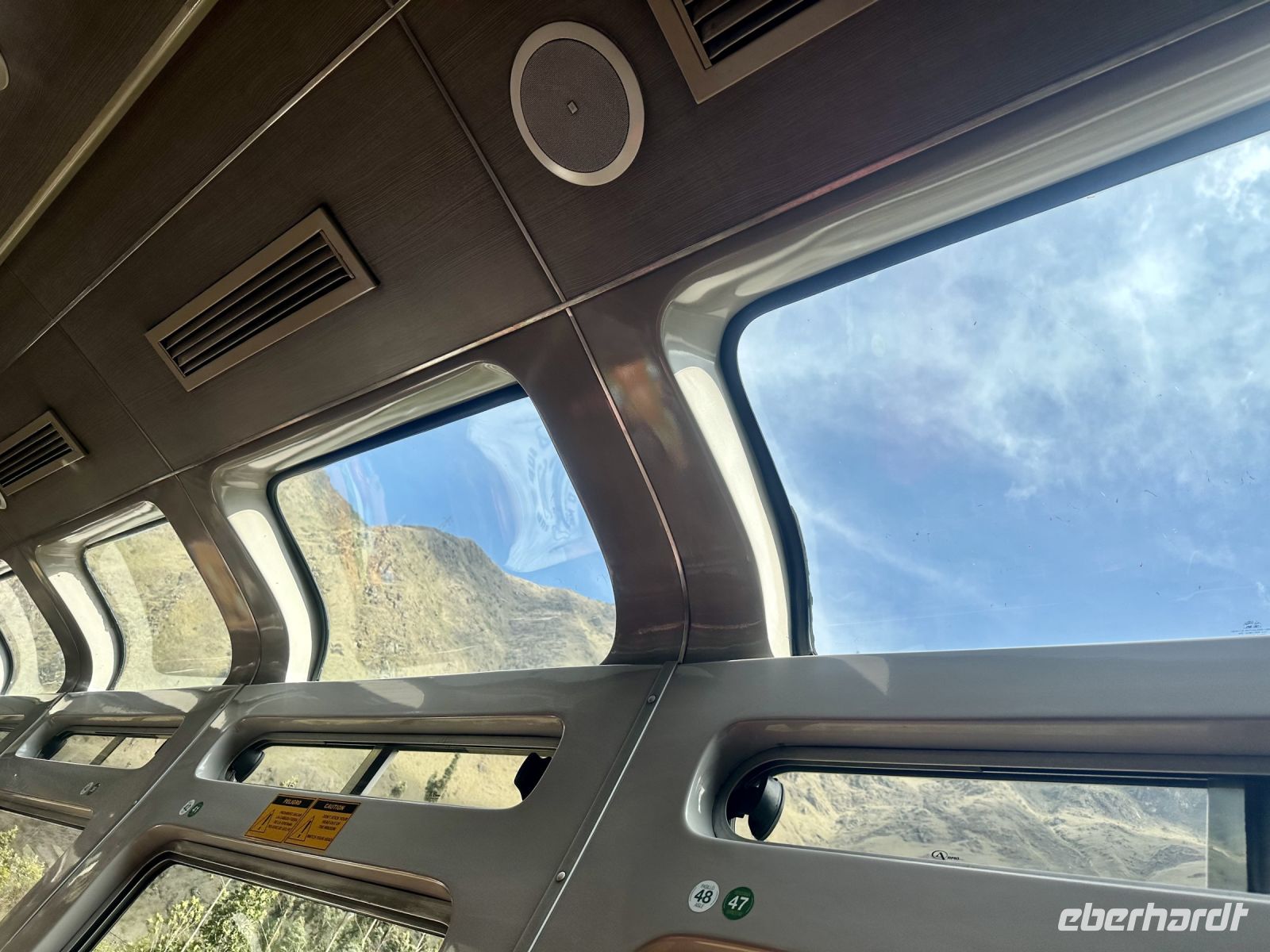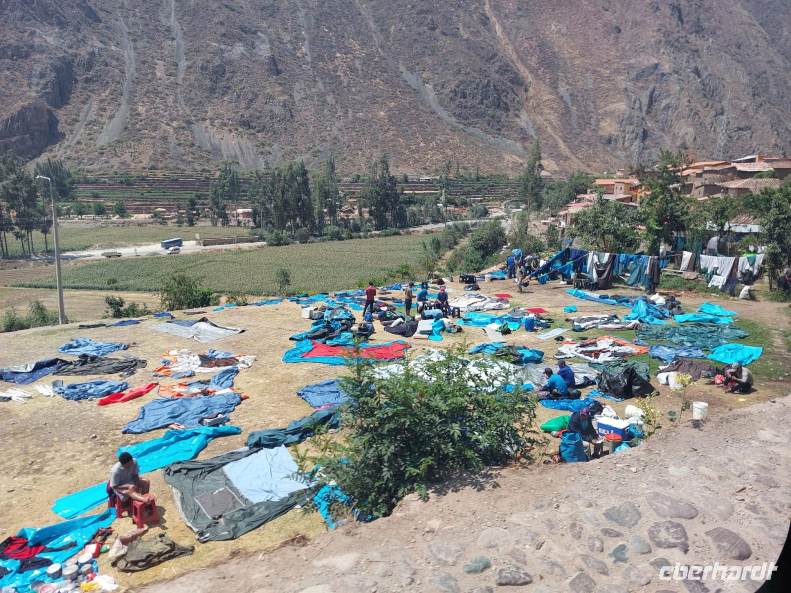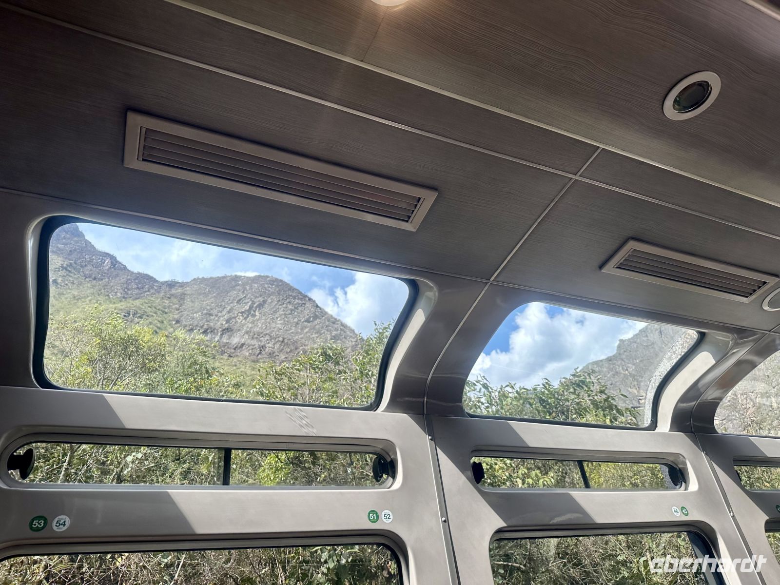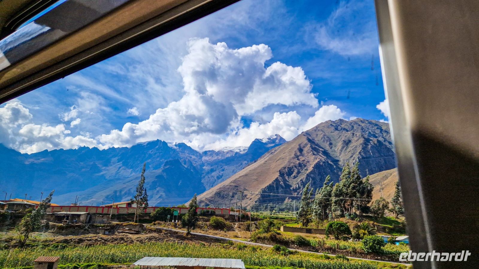 Mit dem Bus fahren wir zum Bahnhof von Ollantaytambo und von hier aus ca. zwei Stunden mit dem Zug nach Aguas Calientes. Die Fahrt führt durch eine spektakuläre Landschaft bis hinunter in den Regenwald. Unterwegs sehen wir Sherpas, die das Gepäck von gut zahlenden Kunden, den Inkatrail hinauf schleppen.