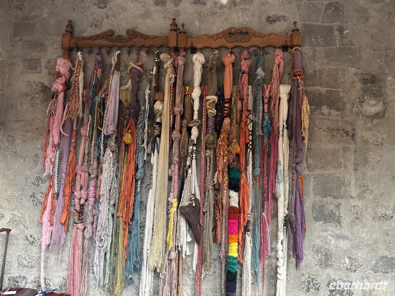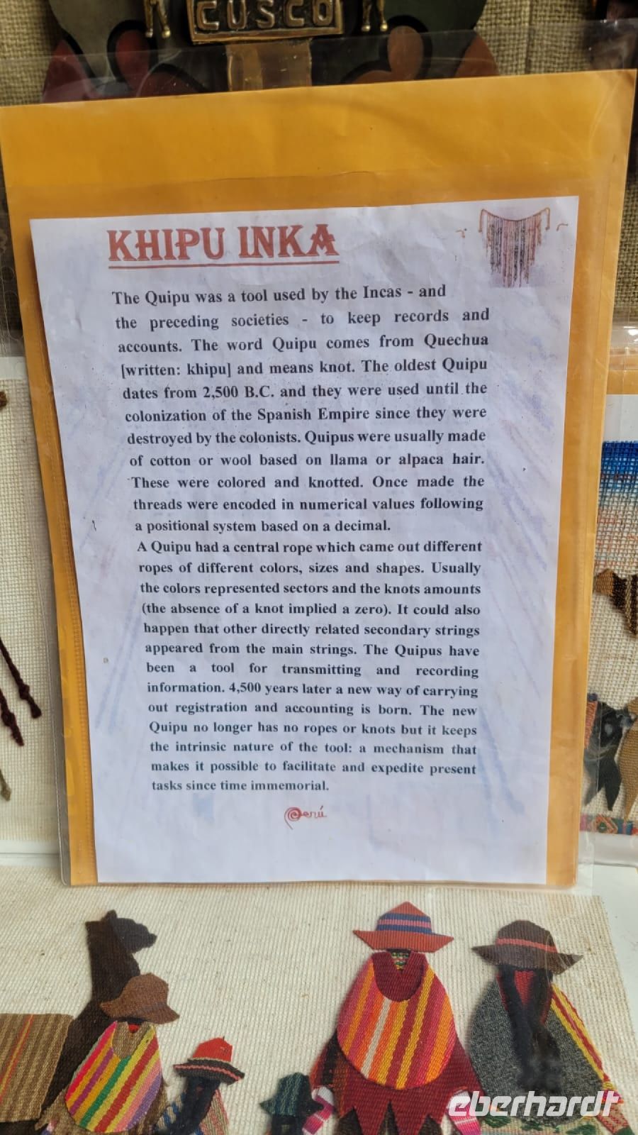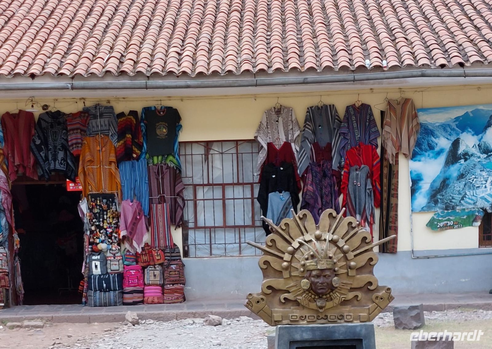 Am frühen Nachmittag erreichen wir Pisac, ein Städtchen, dass am Ufer des Urubamba liegt. Wir durchstreifen die Gassen mit ihren kunterbunten Läden bis zu einem Haus, in dem sich ein riesiger Backofen befindet. Hier versorgen wir uns mit leckeren Empanadas, Teigtaschen mit Käse gefüllt (in unserem Falle), kostet eins 4 Sol, also 1 Euro. Kann man auch zwei essen. Interessant sind hier auch spezielle Souveniers. Es werden Bilder verkauft, auf denen geknotete Schnüre geklebt sind. Dies bezieht sich auf eine historische Verständigungsform der Inka. Man hat tausende davon gefunden, kann sie aber bis heute nicht entschlüsseln. Die Bezeichnung dafür ist Quipu.