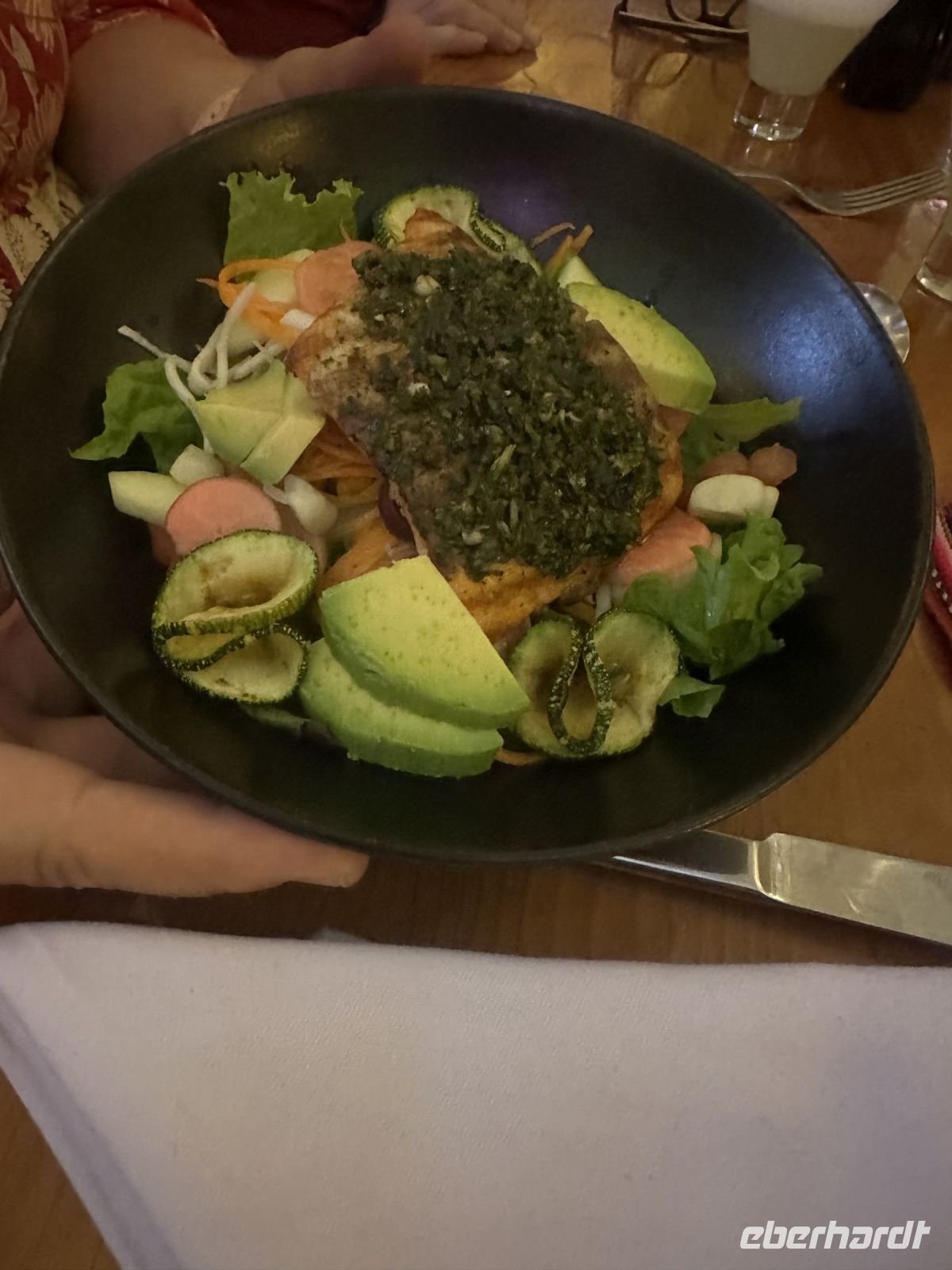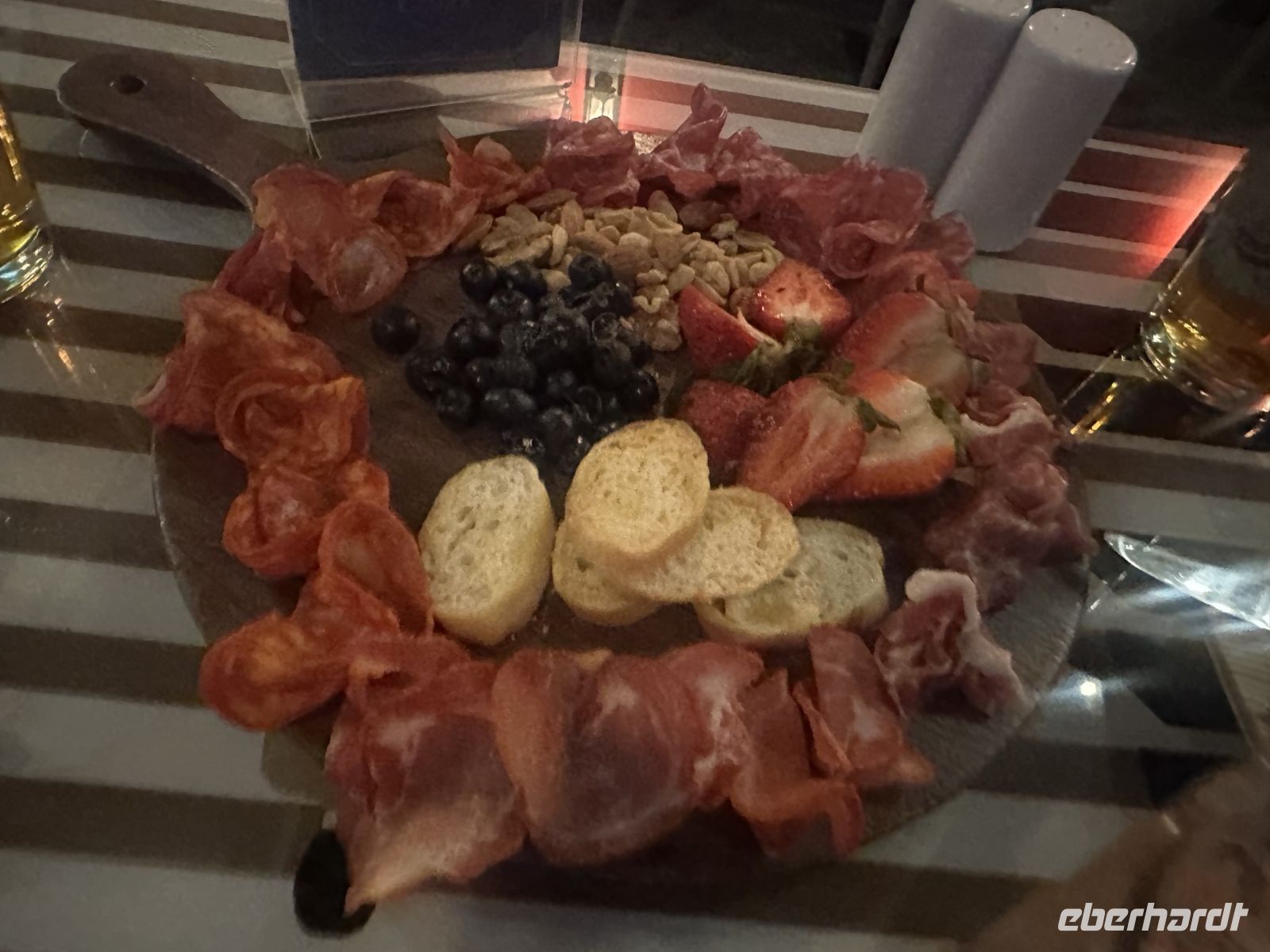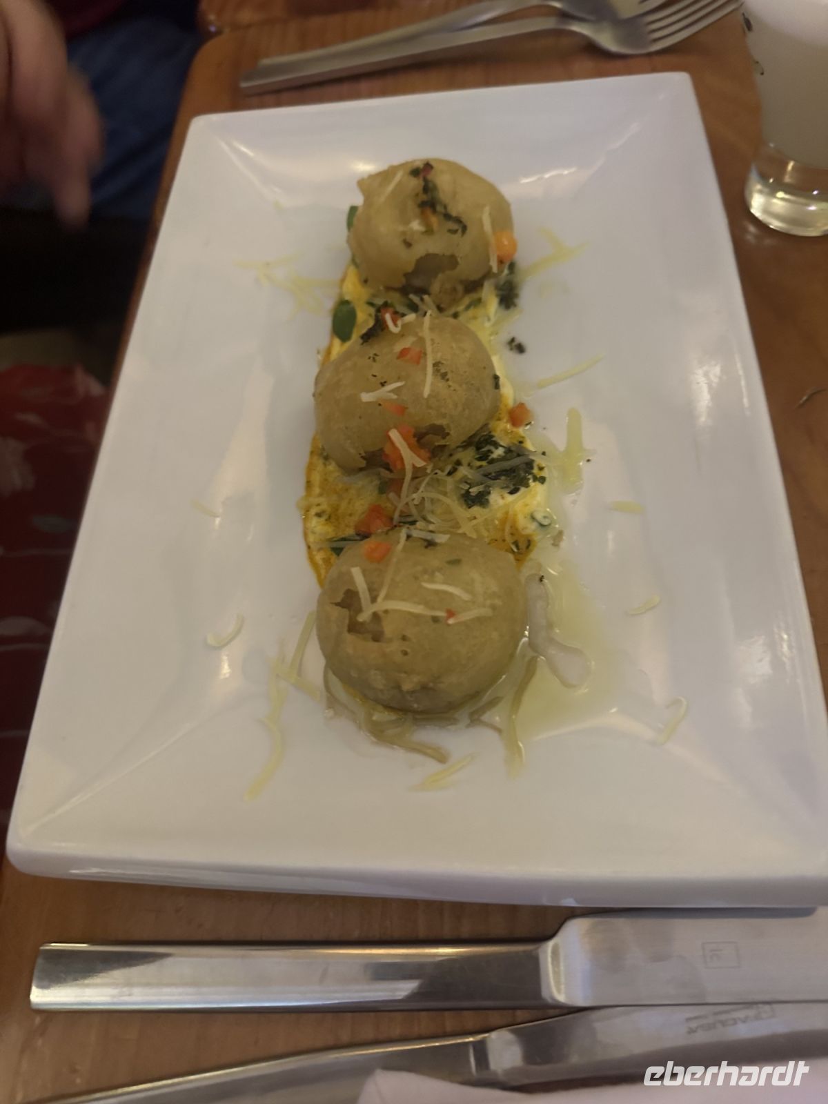 Am Abend gehen wir gemeinsam zum Restaurant Te Amaré Maitena. Hier empfängt uns eine freundliche Crew und ein liebevoll zubereitetes Abendessen wird serviert. Den Auftakt macht ein leckerer Caipirinha, den uns der Hotelchef eigentlich versprochen hatte und den es auf Grund eines Missverständnisses nicht gab. Nun springt unser Reiseveranstalter Eberhardt TRAVEL ein und spendiert das erwartete Getränk. Bald gibt es Empanadas mit Fleisch oder Bruschetta mit Rucola und Parmesan als Vorspeise, alles äußerst liebevoll angerichtet. Zum Hauptgang können wir sogar aus vier Varianten wählen: Surubi Fisch (Wels), Bife de Chorizo (Roastbeaf), Huhn mit Spinat oder Ravioli mit Rucola sind im Angebot. Zum Nachtisch gibt es Eis oder Flan.