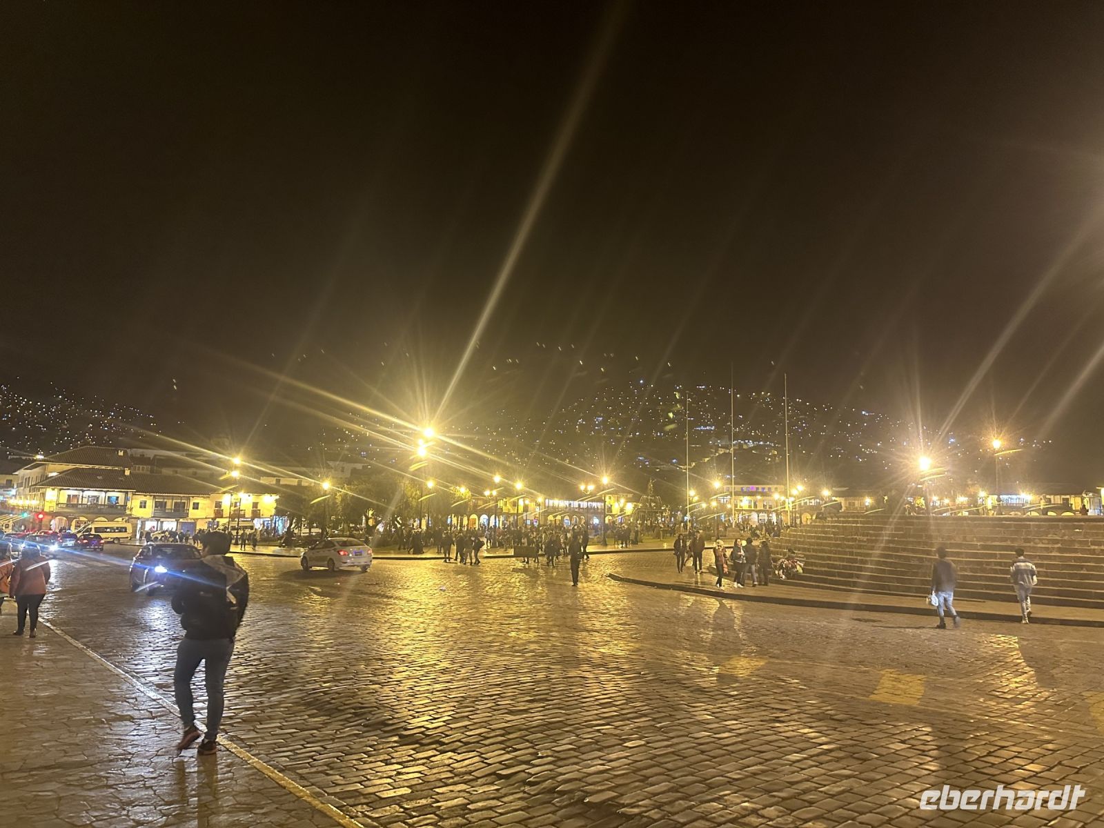 Pünktlich 13.07 Uhr beginnt unsere Rückfahrt nach Ollantaytambo. Nicht nur, dass wir wieder die spektakuläre Landschaft durchqueren, darüber hinaus gibt es ein Unterhaltungsprogramm im Zug. Nachdem das nette Zugpersonal uns mit Getränken und Snacks versorgt hat, spielt einer der Kellner klassische Musik auf der Geige. „Halleluja“ ist das erste Lied, weitere folgen. Anschließend gibt es eine folkloristische Darbietung und eine Modenschau. Wir erreichen Ollantaytambo und finden nach geraumer Zeit den Bus, der uns nach Cusco bringt. Weitere zwei Stunden später, stoppt unser Fahrer in Cusco und gibt uns zu verstehen, dass wir aussteigen sollen. Die Straßen wären zu eng für den Bus. Direkt hinter dem Bus steht ein Van, mit dem wir nun weiterfahren. Es ist Rushhour in Cusco und wir kommen nur langsam voran. Ein großes Hallo gibt es, als wir unterwegs direkten Einblick in eine Zahnarztpraxis haben. Geschickt fädelt sich unser Fahrer immer wieder zwischen die Stoßstange an Stoßstange fahrenden Autos. Unser Hotel befindet sich direkt im Zentrum von Cusco. Wir werden bereits erwartet, die Zimmerschlüssel liegen bereit. Keine viertel Stunde später wartet Alex auf uns, um uns zum Restaurant zu begleiten. Inzwischen ist es dunkel und als wir den Plaza de Armas erreichen, bleiben wir vor Staunen stehen. Direkt gegenüber vom Platz befindet sich ein Berg, an dem hunderte Lichter leuchten. Fast sieht es aus wie Weihnachten, es sind aber die Lichter der Häuser, die sich am Berg befinden. Wir überqueren den Platz und erreichen nach ein paar Minuten das Restaurant Republica. Das Menü hatten wir vor ein paar Tagen schon gewählt und fast unkompliziert bekommt jeder das was er bestellt hat.