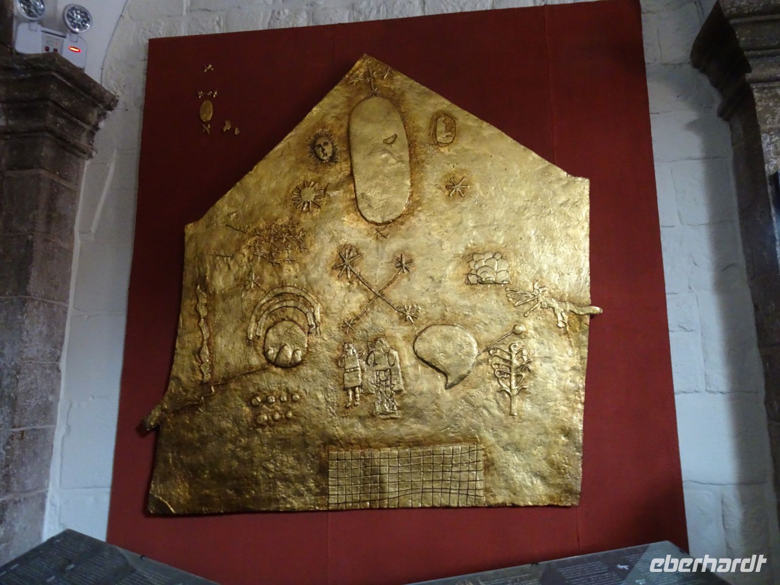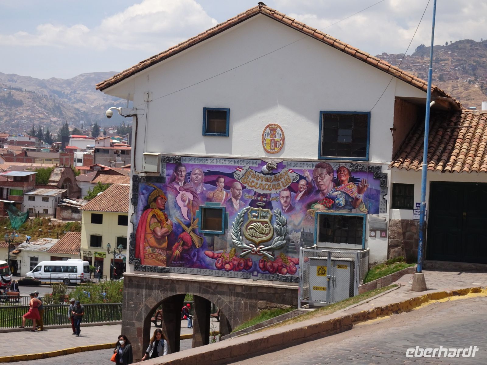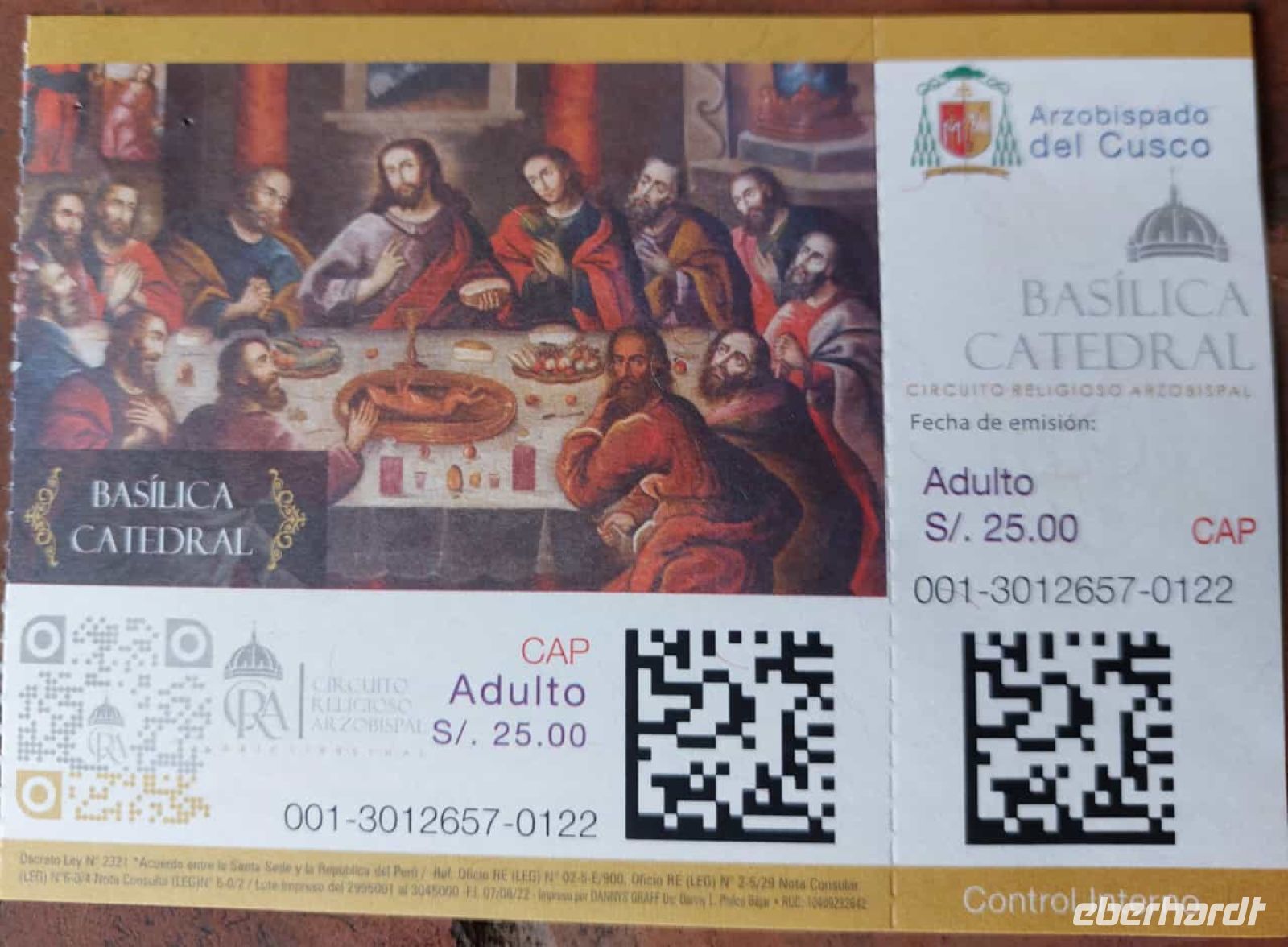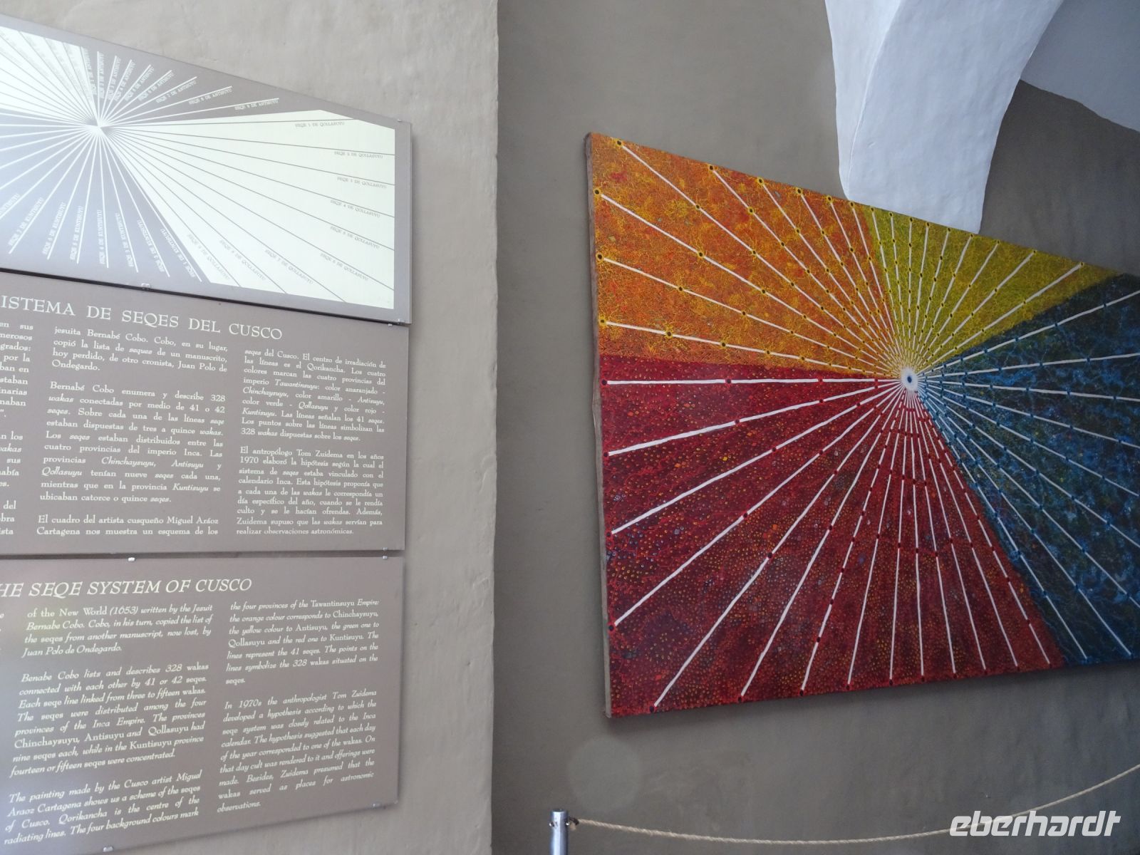 Mit Blick auf den Innenhof, auf dem sich vier weiße Kreise befinden, erklärt uns Alex wie wir uns im Falle eines Erdbebens verhalten sollen. Die weißen Kreise zeigen Notfalltreffpunkte an. Nun kommen wir zu einer goldenen Tafel (Original im Museum), die zeigt, wie die Inkas das Universum sahen. Mutter Erde, Mond, Wasser und den einzigen unsichtbaren Gott in Form eines Eis gehörten dazu. Ein paar Schritte weiter haben moderne Künstler die Weltansicht der Inka auf ihre Weise interpretiert. Unser nächstes Ziel ist die Kathedrale von Cusco. 1560 begann der Bau, der einhundert Jahre dauern sollte. Sie wurde auf dem Palast von Viracocha, dem 8. Inka, errichtet. Das Material, ein roter Granit, kam aus Sacsayhuaman. Innen glänzt die Ausstattung der Kathedrale aus Gold und Silber und über vierhundert Gemälde schmücken die Wände. Eines davon zeigt "Das Letzte Abendmahl" von Leonardo da Vinci, allerdings beeinflusst von der Andenkultur, denn hier wird ein Meerschweinchen gegessen und Chicha getrunken. Dieses Bild wurde 1753 von Marcos Zapata gemalt und es erstaunt noch heute, dass die katholische Kirche dies duldete. Jedoch war Zapata zu seiner Zeit ein anerkannter Künstler und Meerschweinchen zu essen, gehörte zum Alltag.