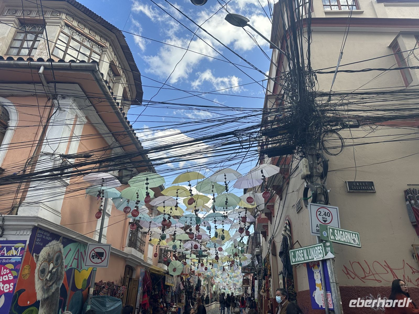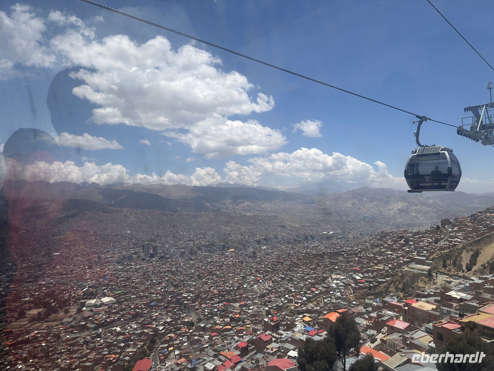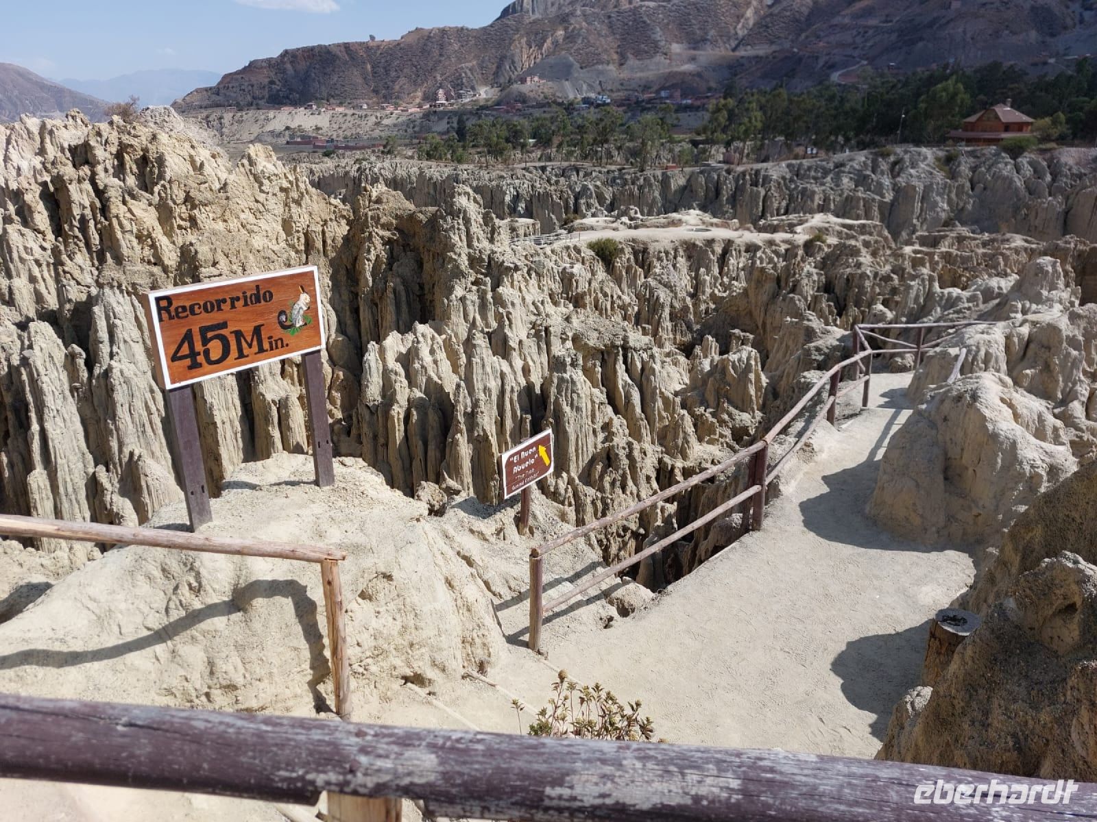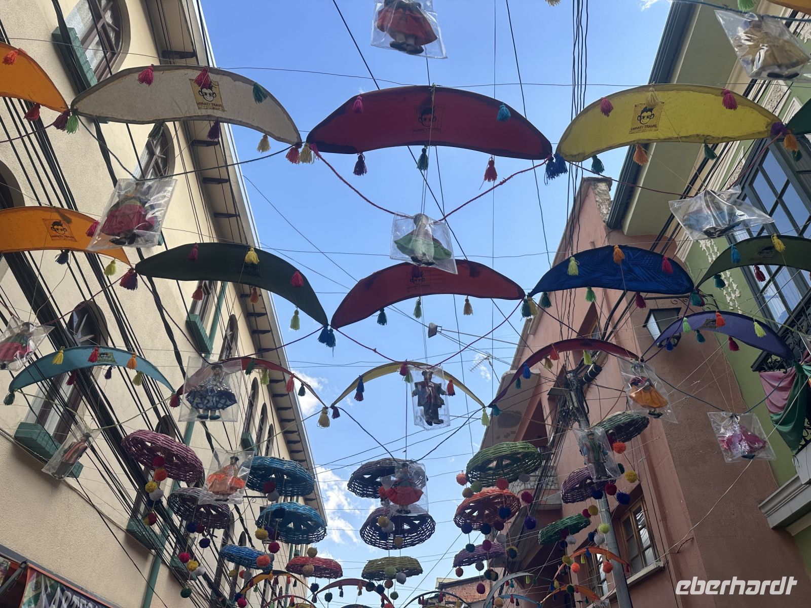 Auf den Straßen herrscht ein reges Treiben, inzwischen haben wir uns an den Anblick der regional gekleideten Menschen gewöhnt, dennoch entzücken immer wieder die Frauen in ihren ausladenden Unterröcken und den Melonen auf dem Kopf. Bald verlassen wir den Bus und setzen unsere Stadtrundfahrt mit der Seilbahn fort. Die Seilbahn ist ein fester Bestandteil des öffentlichen Verkehrsnetzes von La Paz und bedient mehrere Linien. Wir lassen uns zunächst von dem unglaublichen Ausblick auf La Paz berauschen und nutzen erst die blaue Linie und danach die gelbe, welche uns eintausend Meter hinab ins Stadtzentrum bringt. Unten, in La Paz, herrscht ein komplett anderes Leben. Es geht eindeutig vornehmer und wohlhabender zu. Da es bereits mittags ist, knurrt uns ein bisschen der Magen und José sucht eine kleine Imbiss-Stube, wo wir uns mit Empanadas stärken können. Weiter führt uns der Weg ins Mondtal. Wir treffen auf eine Landschaft aus spitzen Felsen und seltsamen Steinstrukturen, die von Wind, Regen und Erosion geschaffen wurde. Durch die bizarren Felsen führen ausgeschilderte Wanderwege und an manchen Ecken stehen einheimische Musiker, die mit ihren Melodien das sonderbare Ambiente unterstreichen.